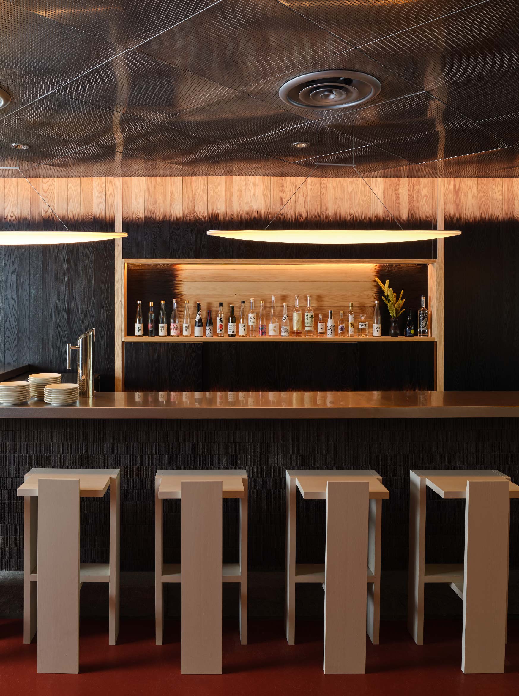 ,設計師Sacha Leong提到,他在研究馬格利酒廠時,發現燒焦木材在韓國建築中的獨特質感,決定將其融入餐廳設計,因而製作樣本、嘗試創造一個簡單的圖案,最終在木材上形成