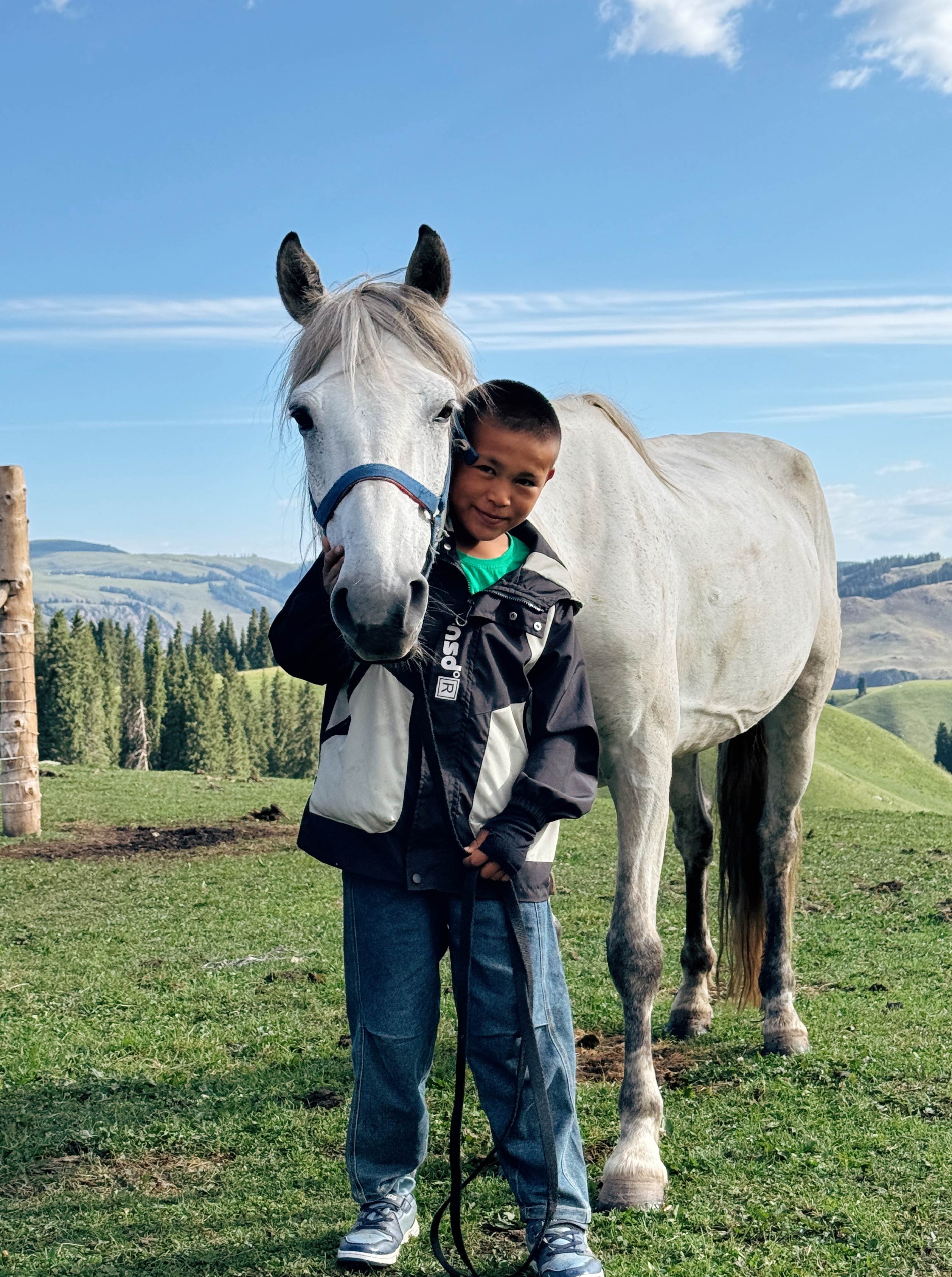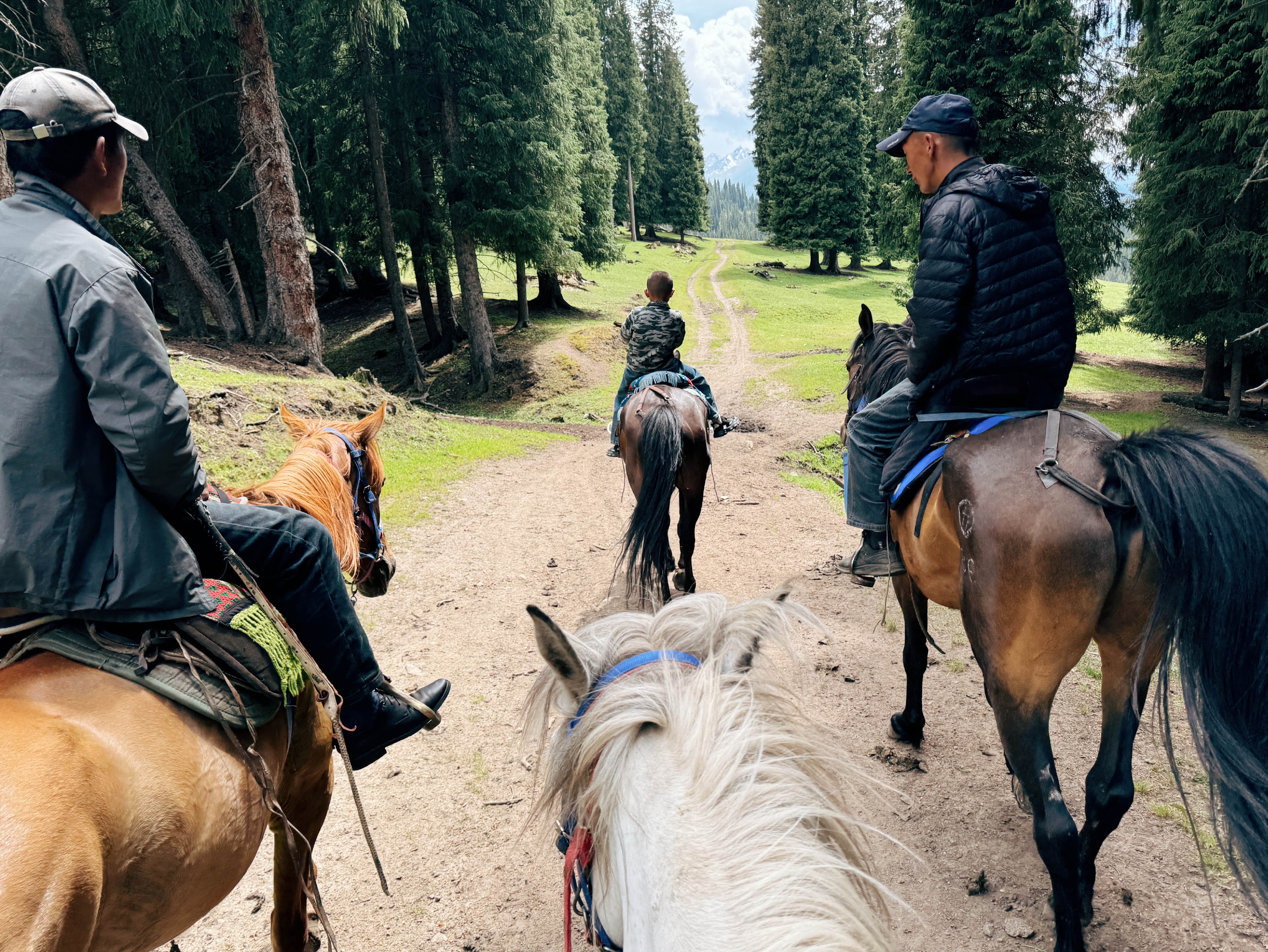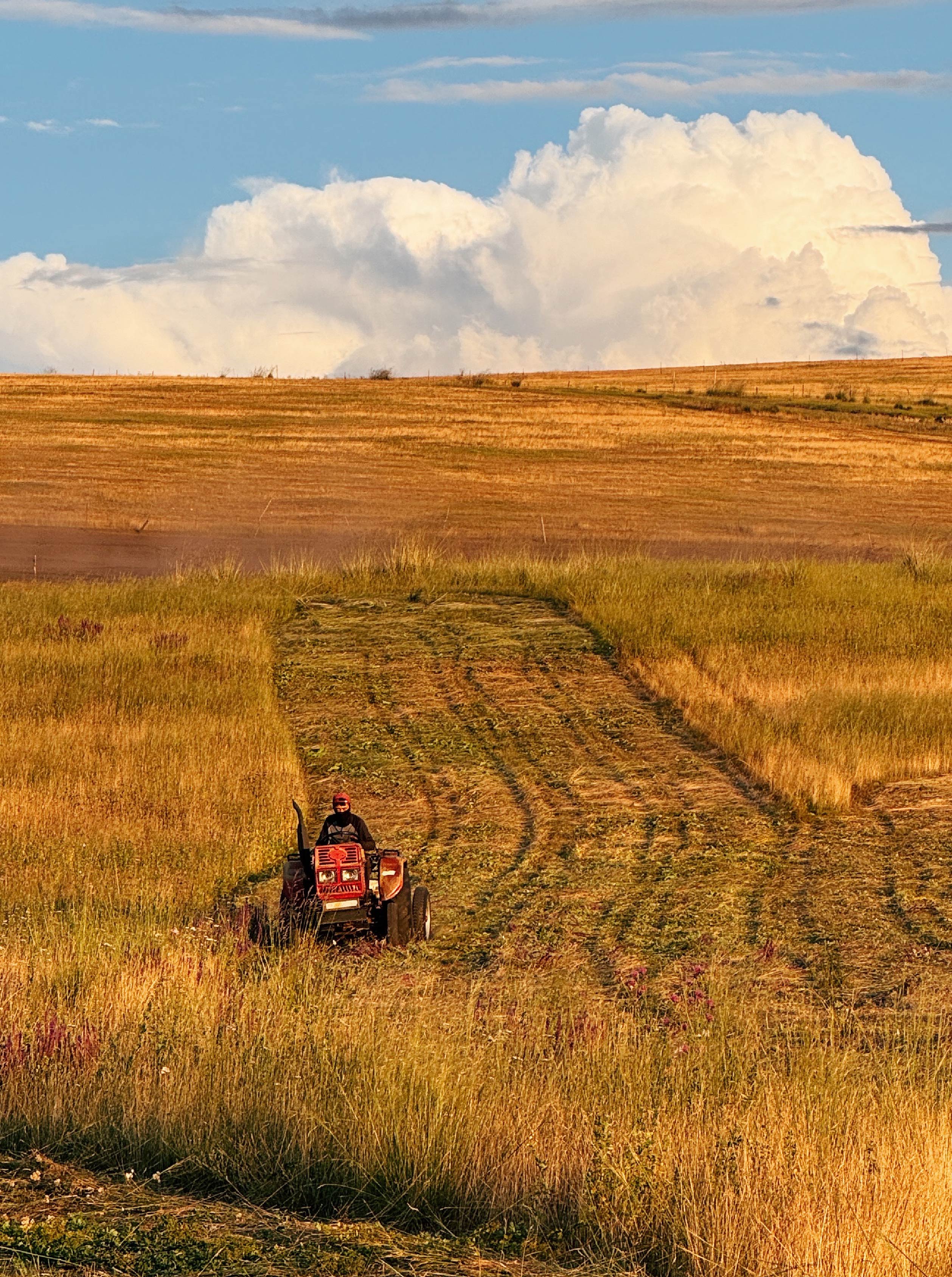 為了趕在下雨前把曬乾的牧草打包,今天我們才剛喝完早茶,就騎馬往兩座山之外的冬牧場走去。巨大的打包機轟隆隆地在草地上來回轉著,把前幾天割下、已經曬乾的牧草捲進它的肚子裡,在草原上形成一塊塊方形草垛。