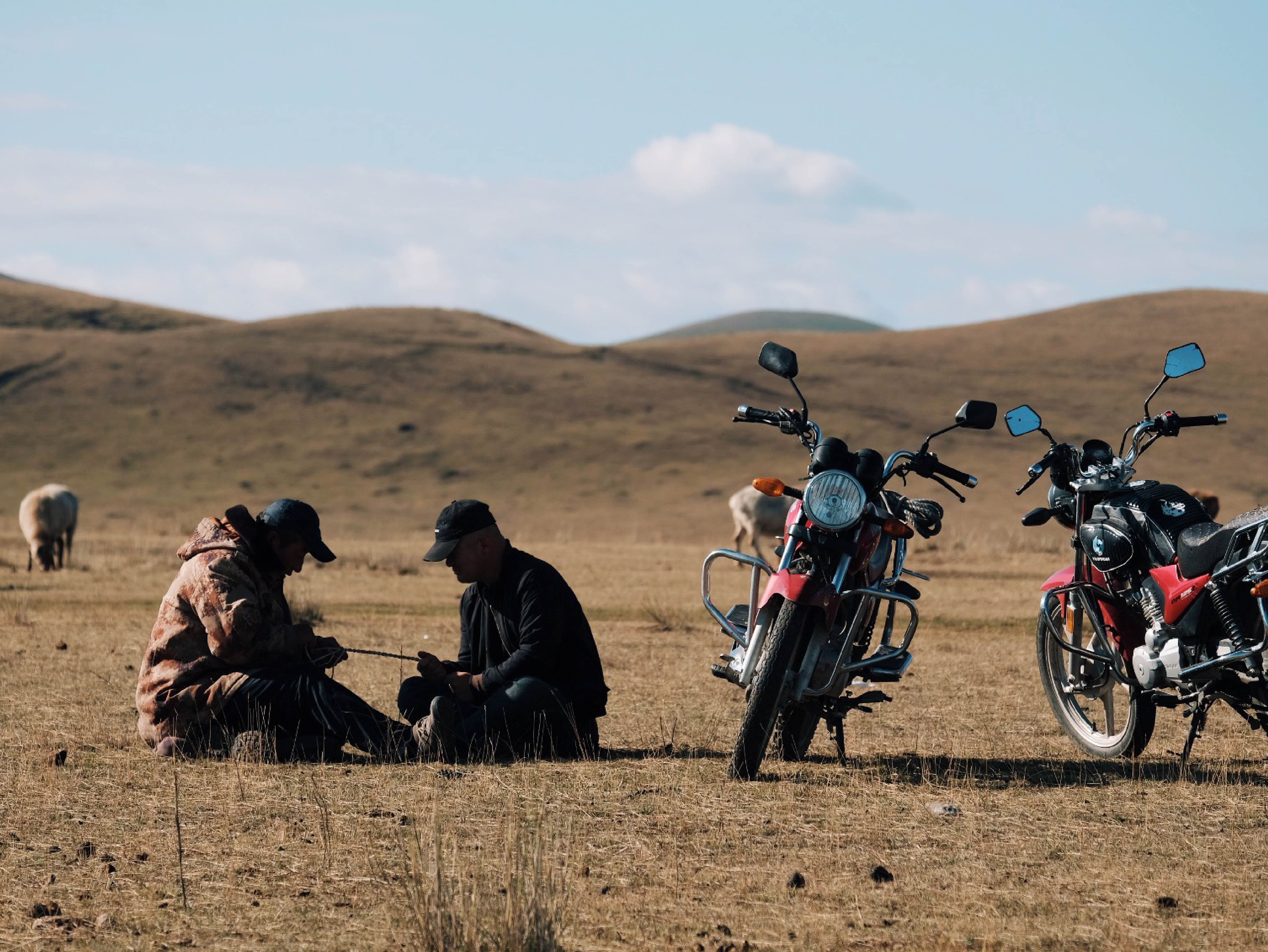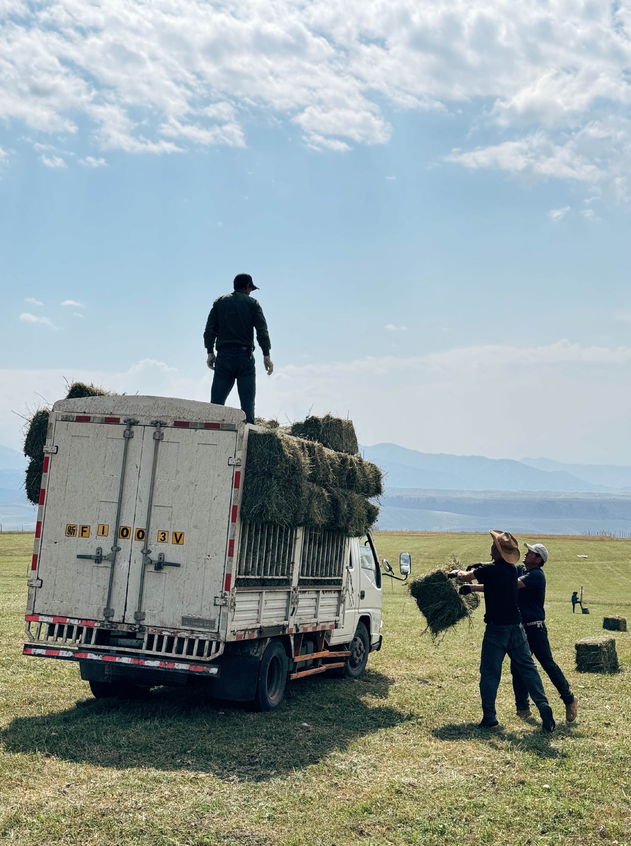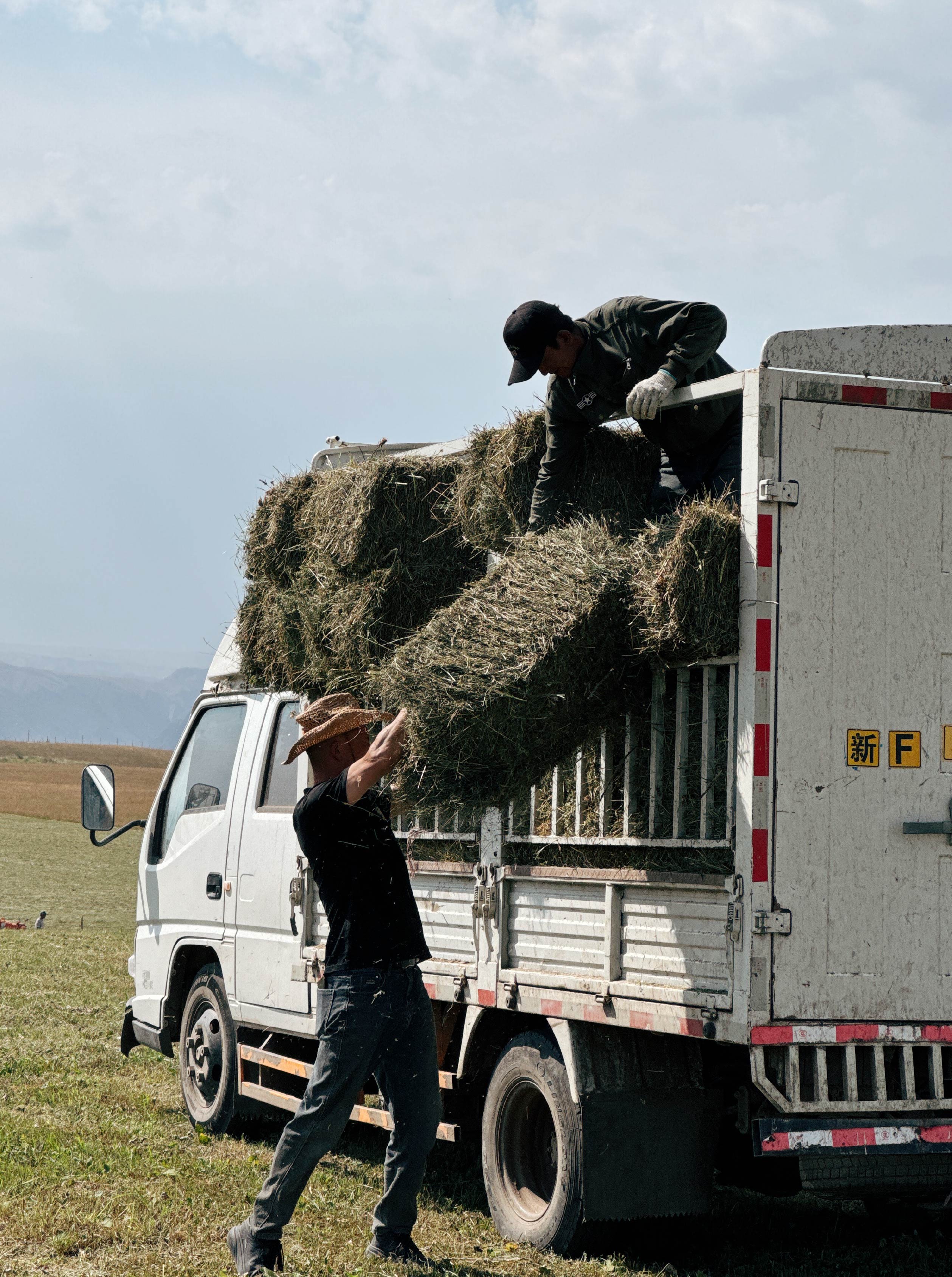 木拉提把手套遞給我,讓我幫忙把散落的草垛抬到貨車旁邊,我才知道這一捆乾草有多扎實——只用一隻手根本拿不起來、拿著走幾步就累了、即使帶著手套依然會被尖銳的草梗刺痛。正當我用螃蟹走路的姿勢,滑稽地抬著草垛一步一步往前時,木拉提跟大哥已經把好幾捆草集中到車邊了(他們居然能單手拿起20公斤重的草!)