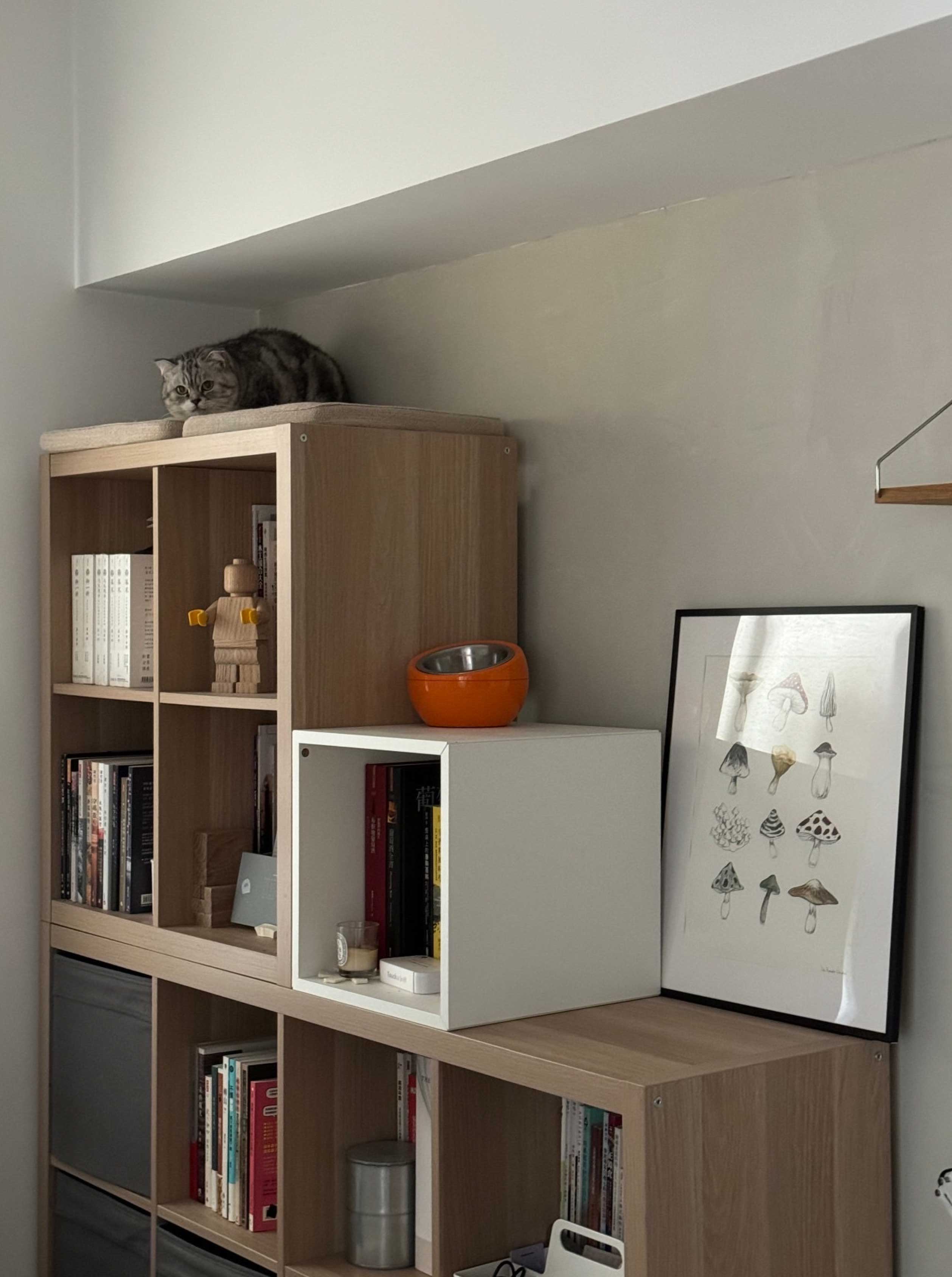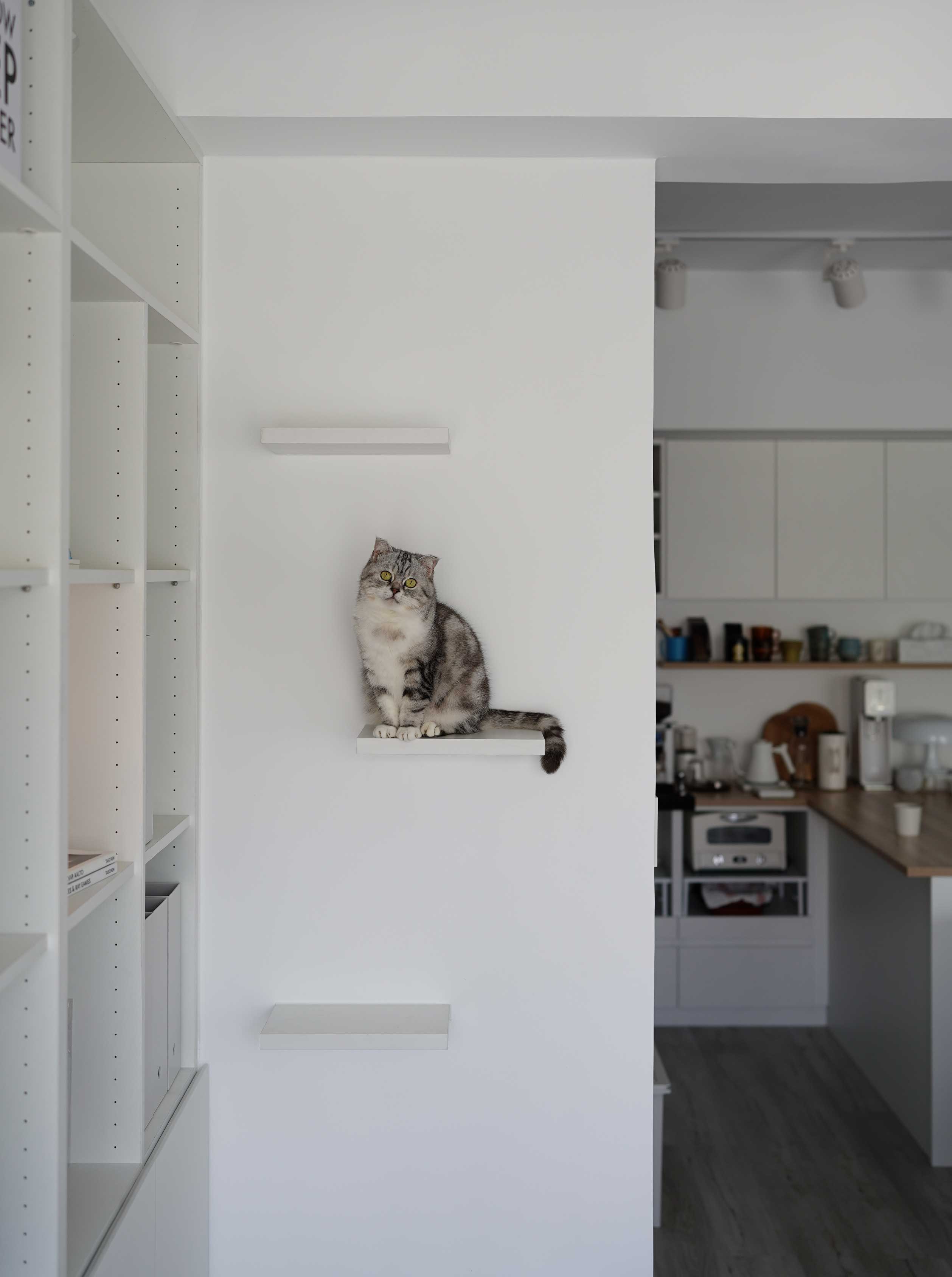 菇小姐:以前的老家,大多是一些木頭櫃子和桌子,沒有特別的佈置,所以搬到新家後,我們便依生活習慣和麵麵的個性來重新規劃。麵麵是一隻怕高的貓,牠曾經跳到約100公分高的鞋櫃就卡住不敢下來,一直喵喵地求救,所以我特別設計了「可以走、但不會太高」的動線:像是餐桌後的牆面,我利用空氣清淨機作為牠的第一階,接著跳到層架與書櫃,一路延伸到上方;在臥室則是用 IKEA 的書櫃疊成階梯,或許因為比較有「躲藏感」,所以牠時常待在那裡。但整體來說,麵麵的行動力並沒有那麼強,所以我常常讓這些動線同時兼具置物的功能。