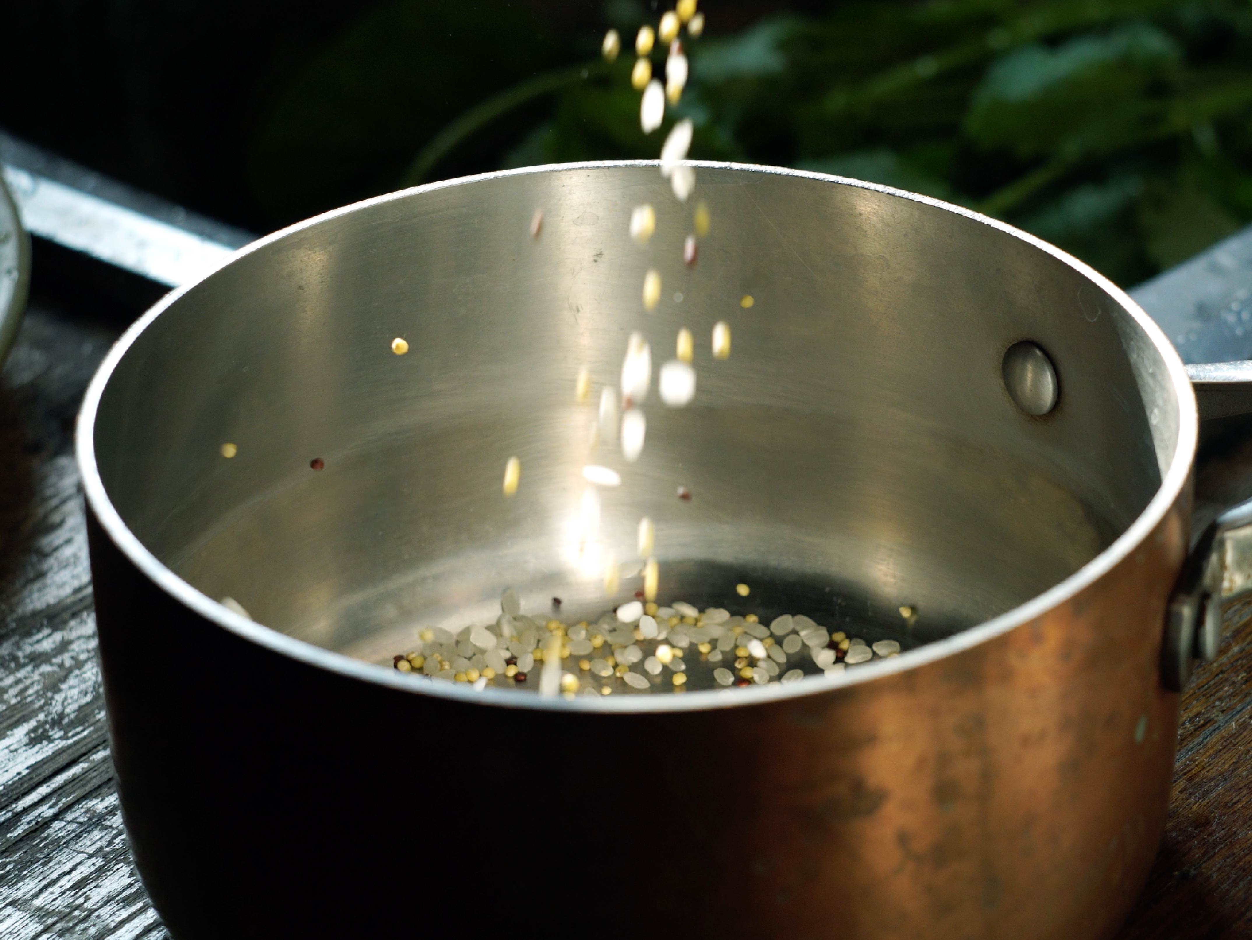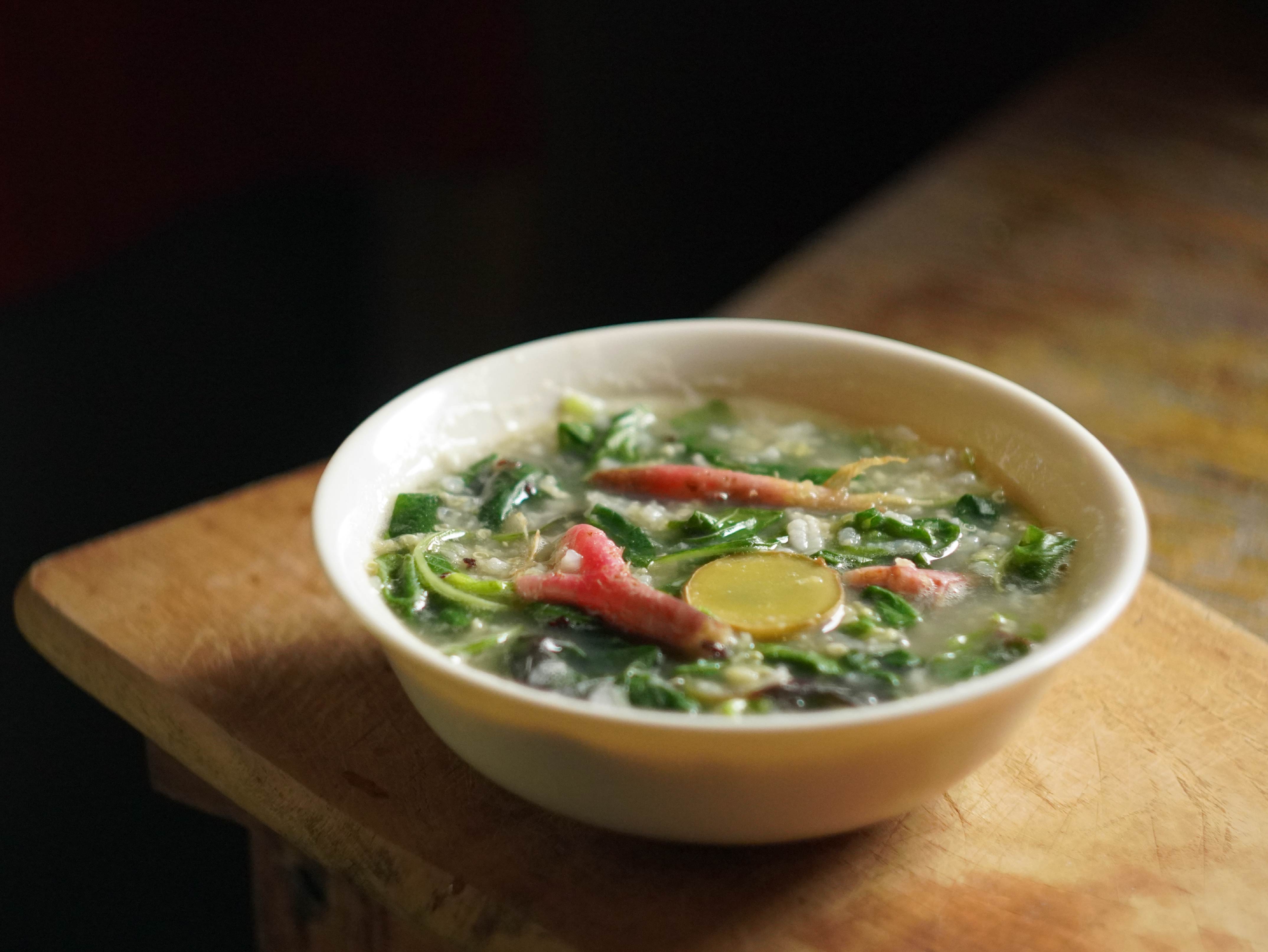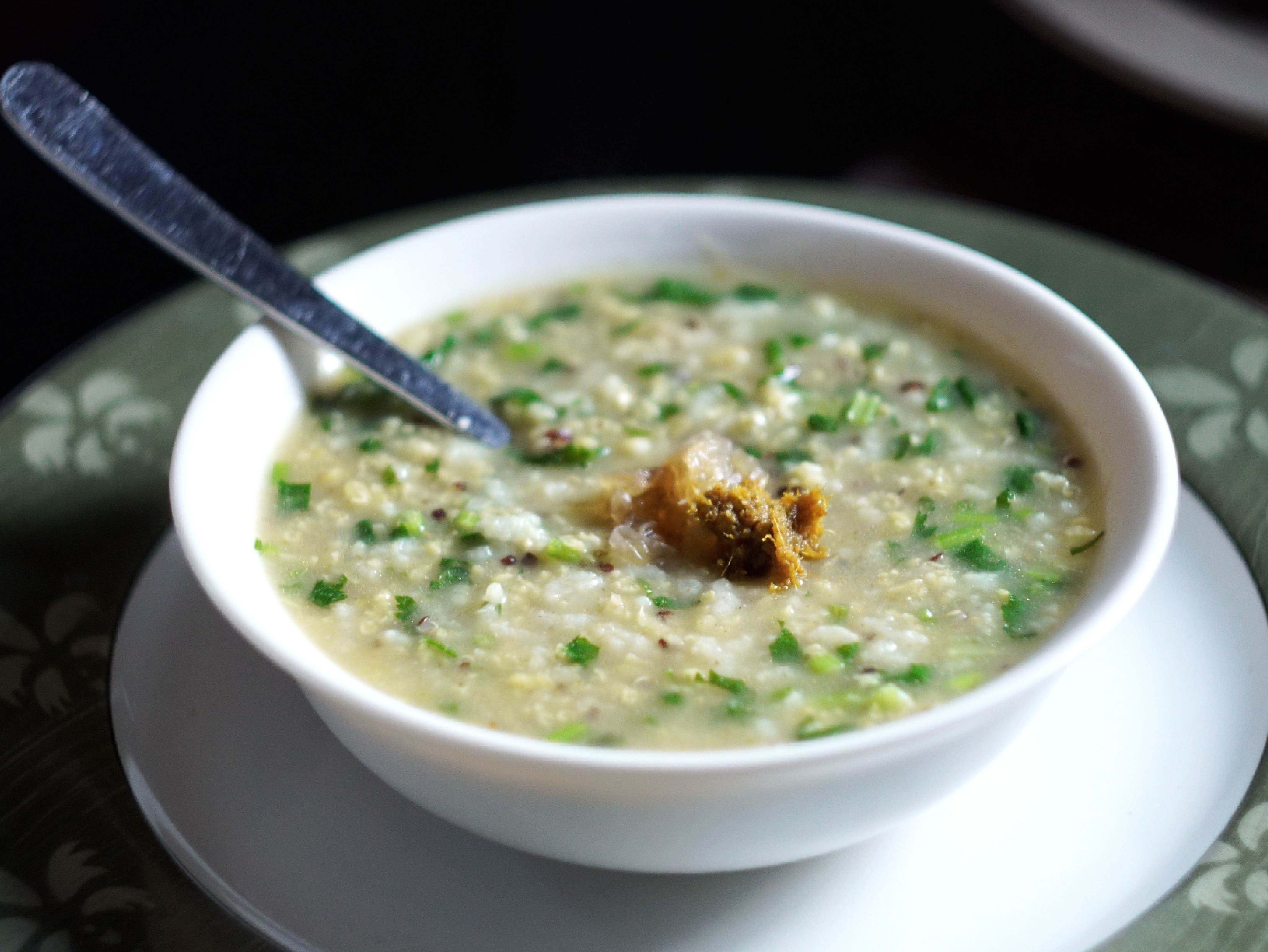 我喜歡把各種榖物混合熬粥,也避免營養過於單一。這碗紅莧菜米豆粥,以白米、藜麥、綠豆仁為基底。綠豆仁助於消化,也協助去除體內多餘濕氣,入口時也多了一層口感。紅莧菜在最後起鍋前十分鐘加入,調味僅需薑片、鹽與胡椒,或一點芝麻油。沒有繁複的技巧,卻能足夠滋潤身心,簡單不造作的氣味,也柔軟了僵化許久的心。