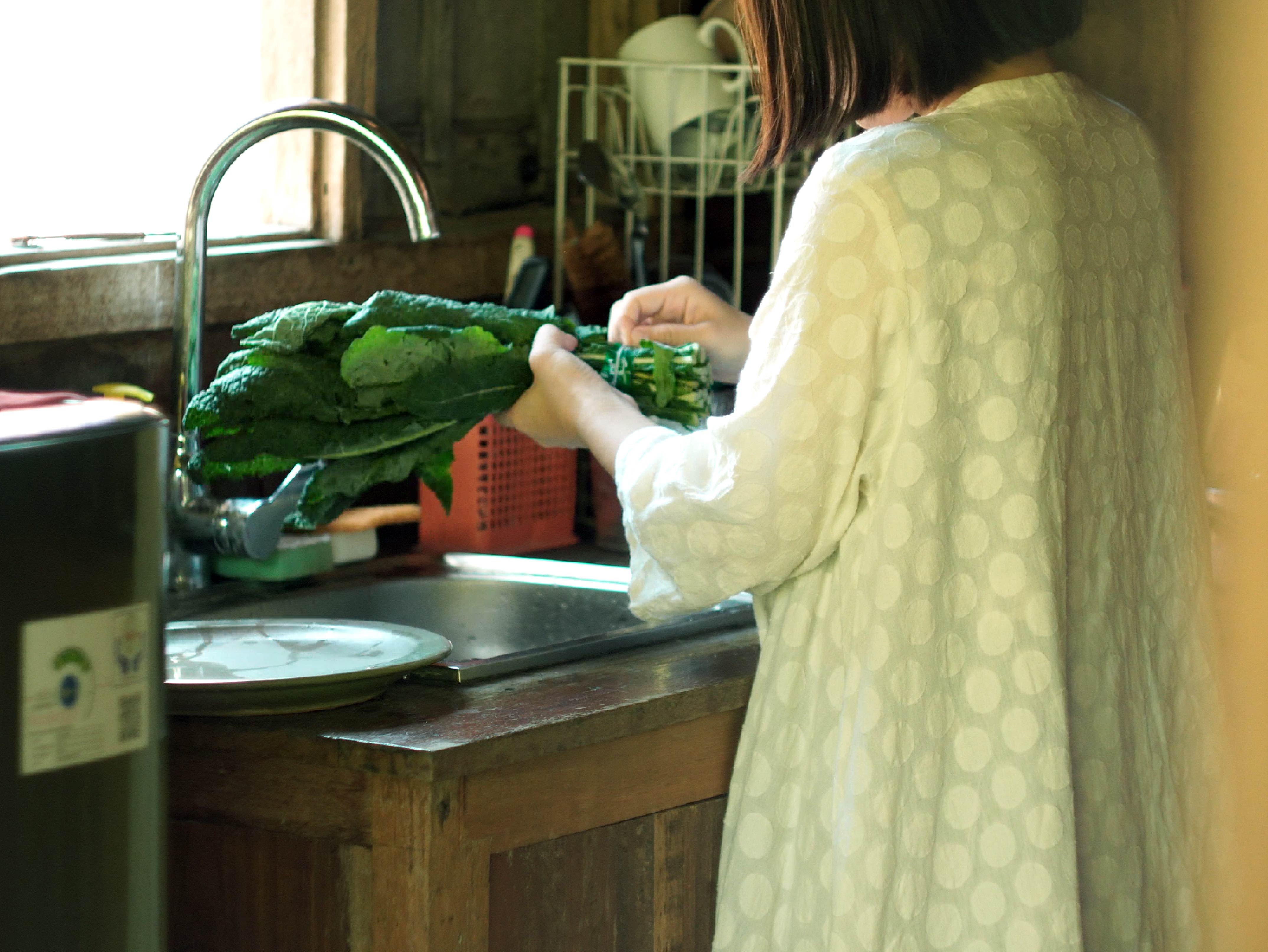 廚房是一個半室外的空間,配有冰箱、兩口瓦斯爐與簡單的碗盤器具。只帶了一口鍋與一只杯子的我,輕輕對齊便能滿足日常所需。早晨起床梳洗後,推開木窗,讓光灑進空間,再慢慢煮一杯熱普洱奶茶,新的一天就這樣展開。