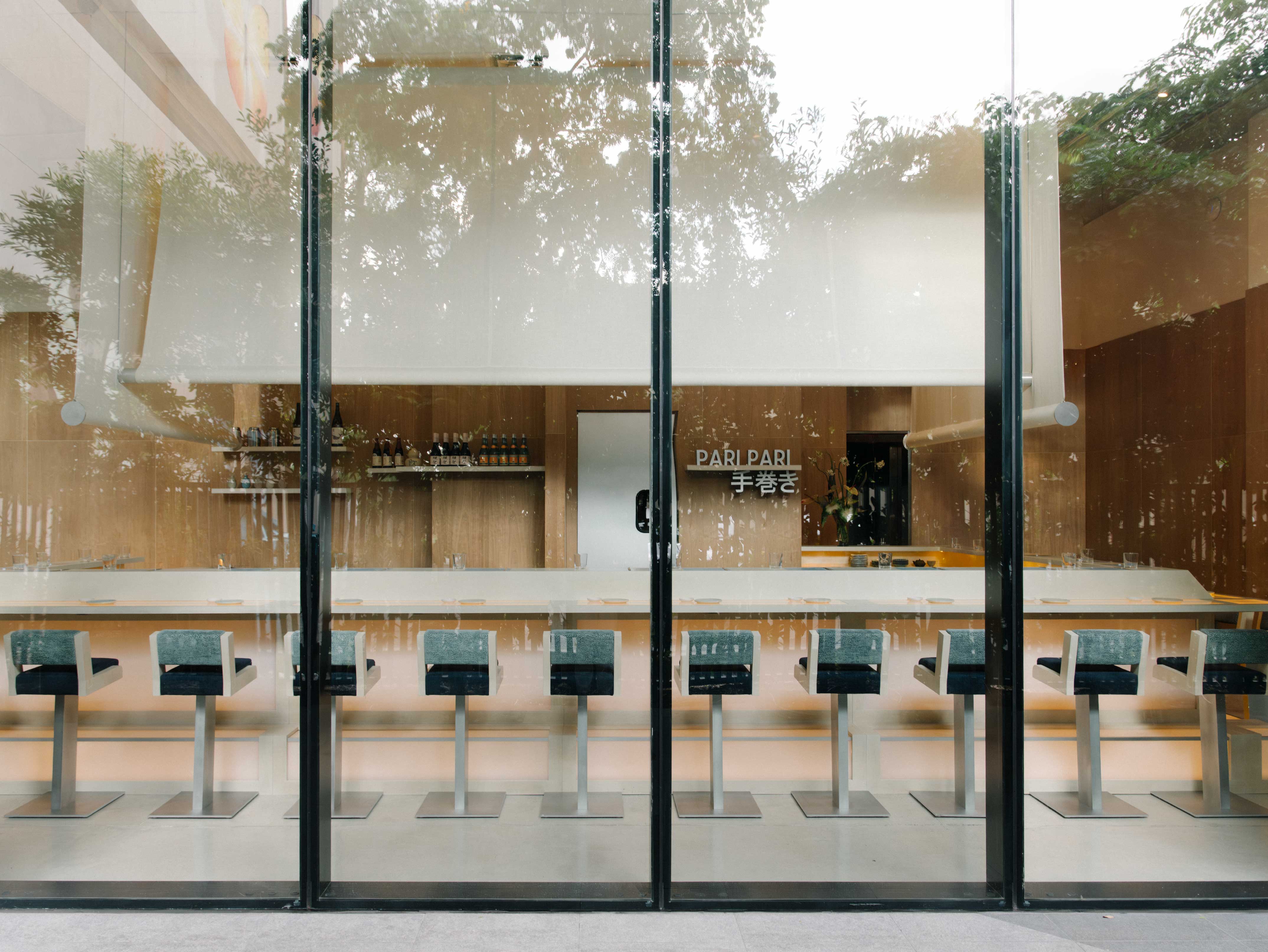透過諾大的落地玻璃,很清楚地可以看到Pari Pari 的焦點是一座專為手捲設計的吧台,設計師將其想像為一盞