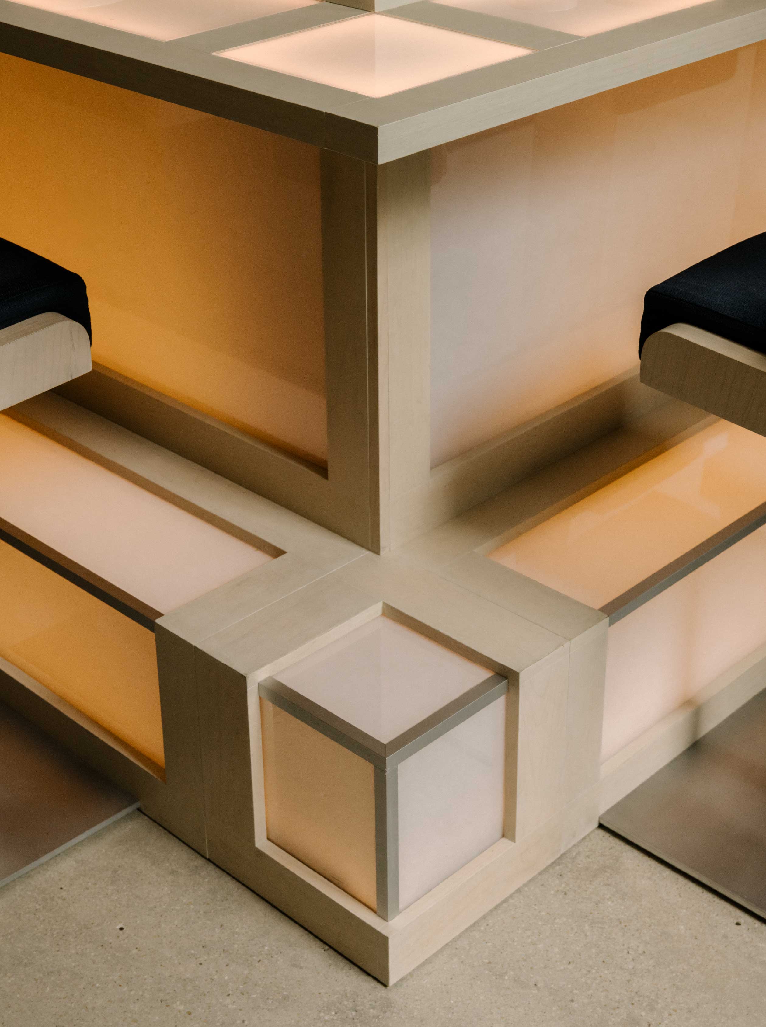 讓吧台在白天的光線下能散發出輕盈明亮的效果,如同清晨第一道陽光般;到了夜晚,則轉化為溫潤柔和的色調,映襯夕陽餘暉,隨著光線層次的變化,感受時間的流動。