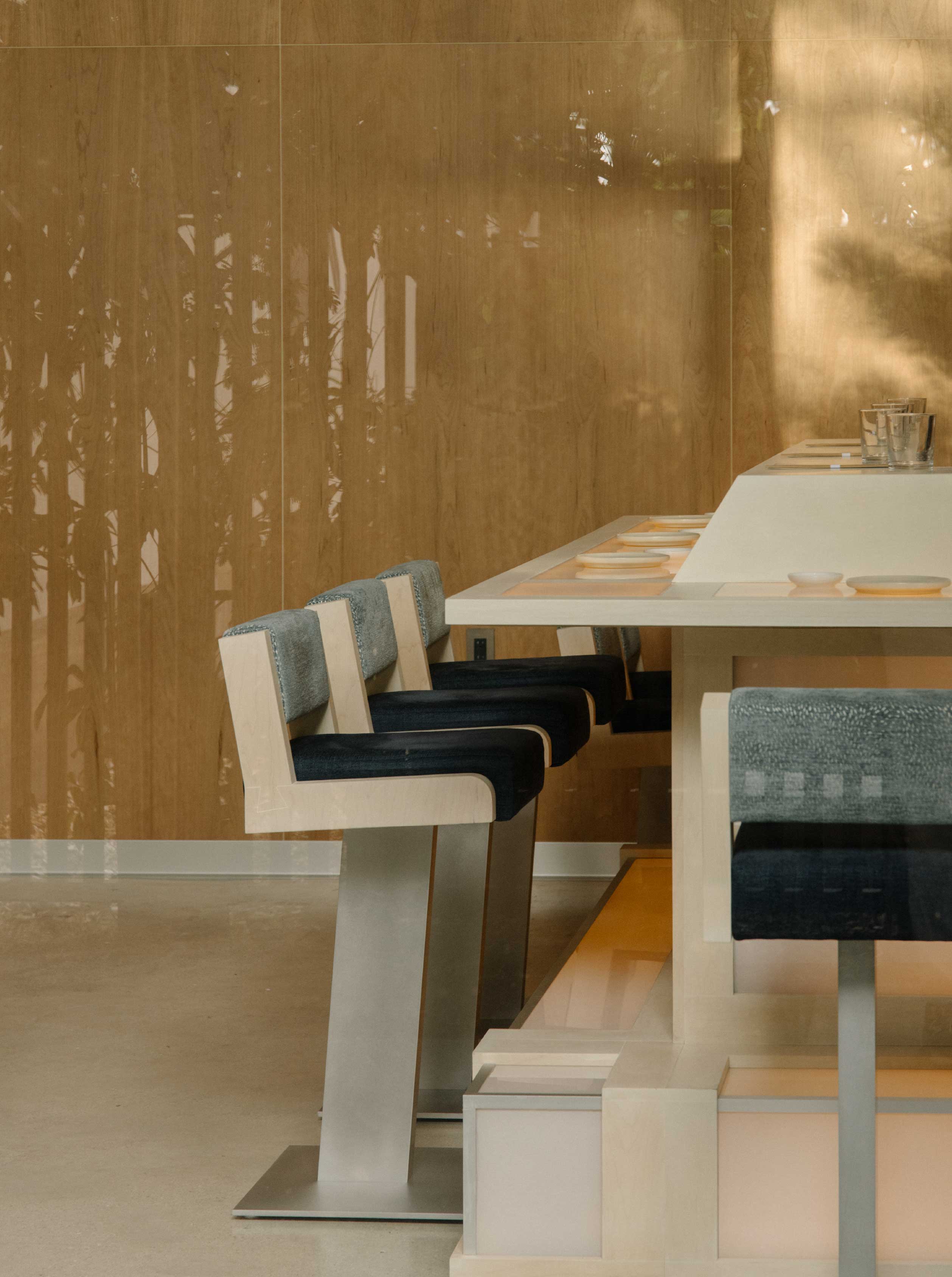 除此之外,巨幅布幔還具有儀式意象,在這層白色亞麻布的庇護之下,魚料被精準切割,隱喻日式料理製作過程的專注與敬意。
