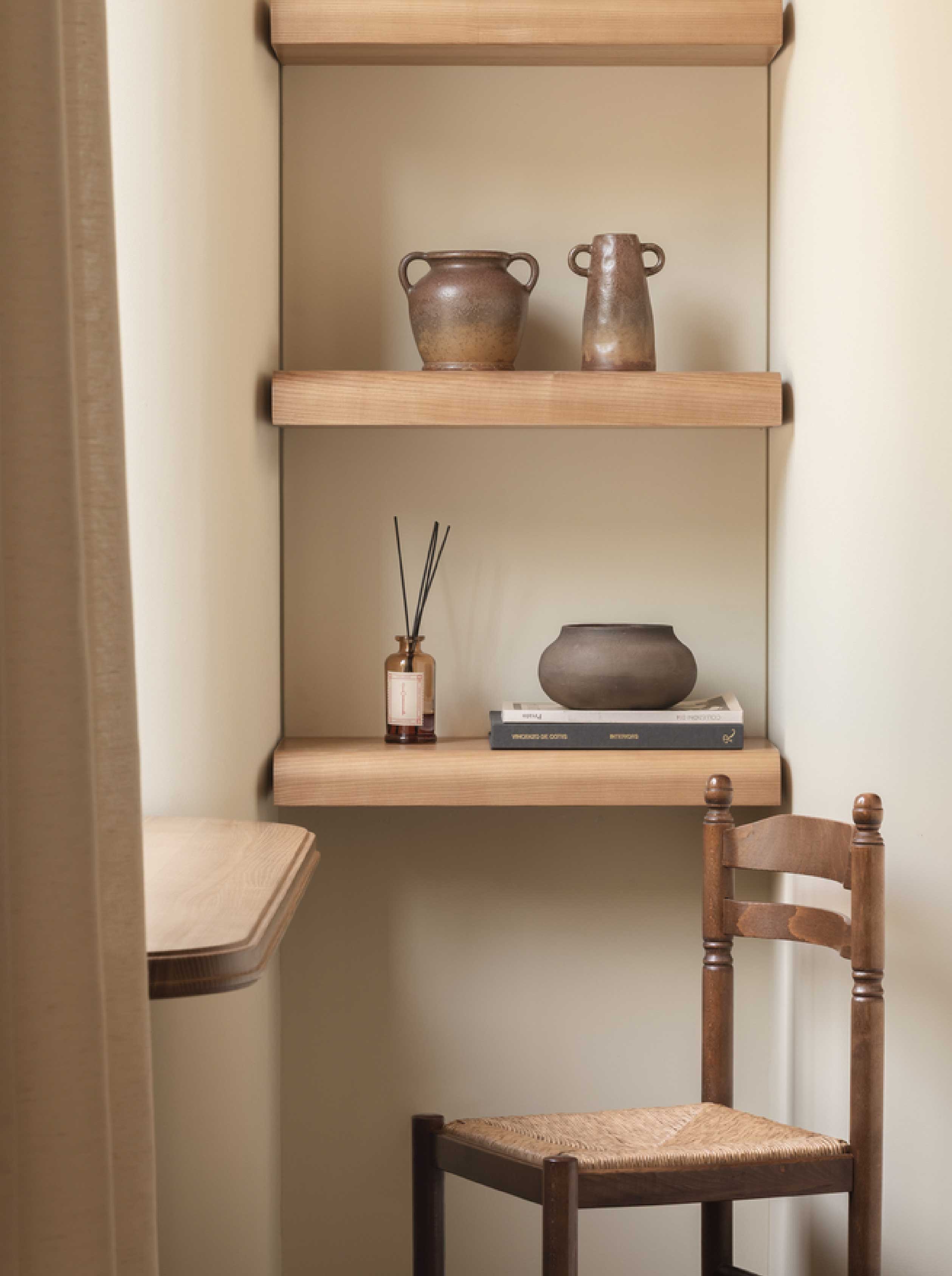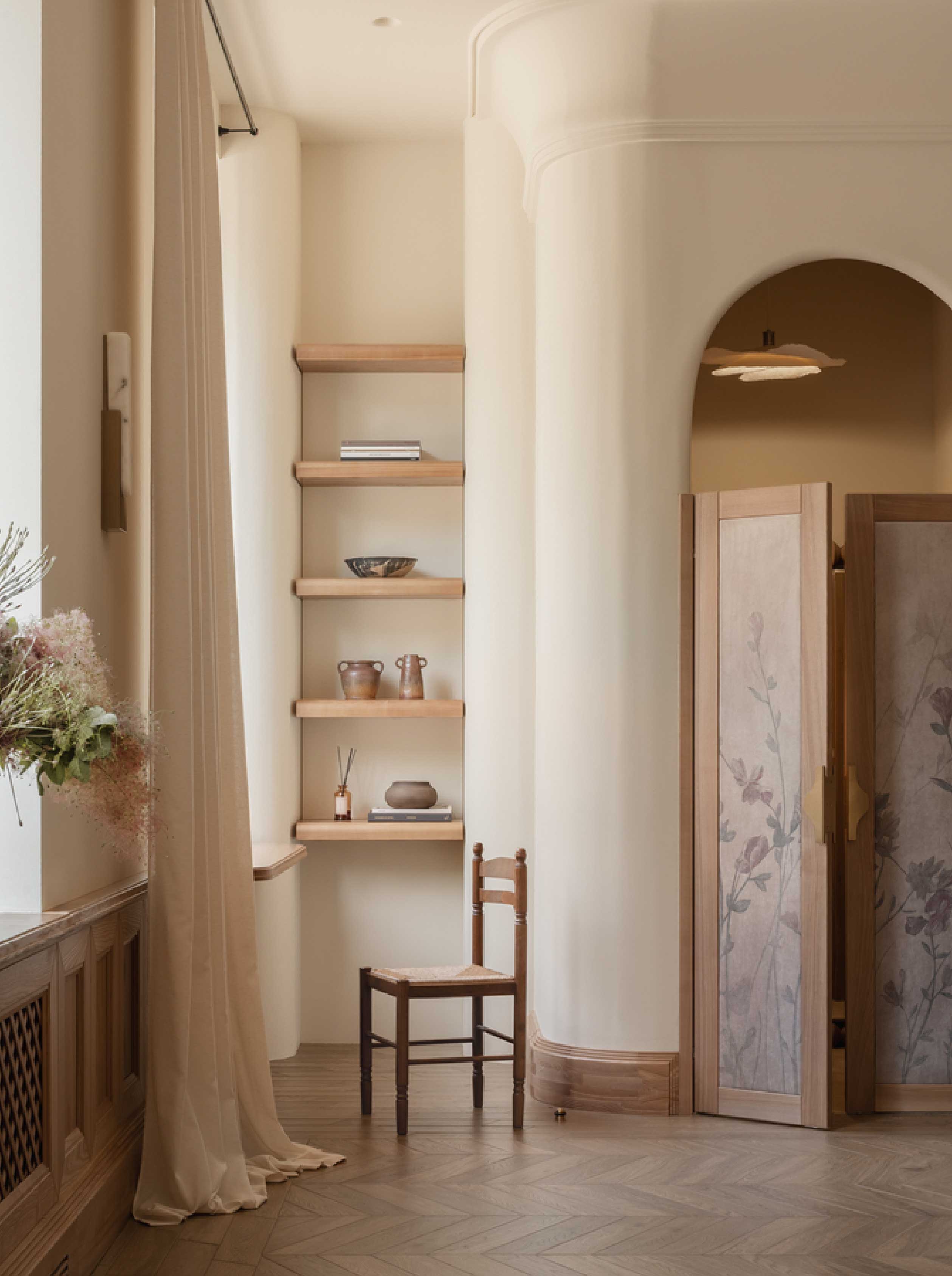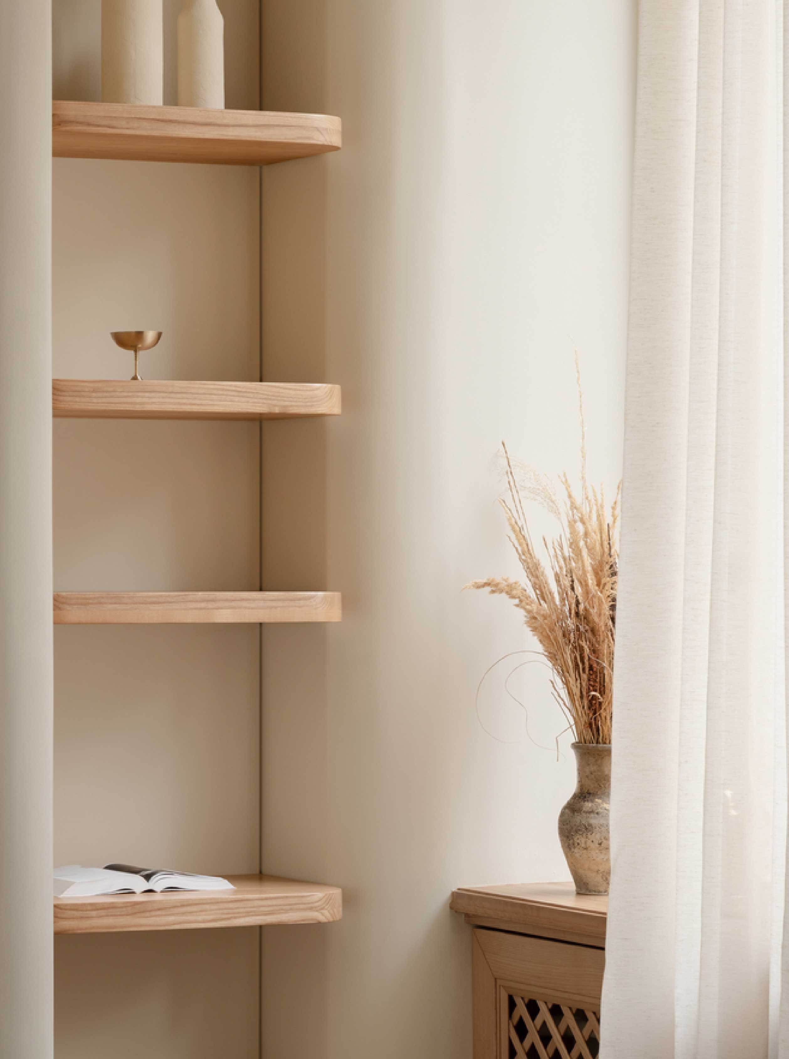 牆面以柔和的奶油色為底,溫潤的天然木材貫穿於門片、牆板與訂製家具之間,形成穩定而不失輕盈與平衡的基調。