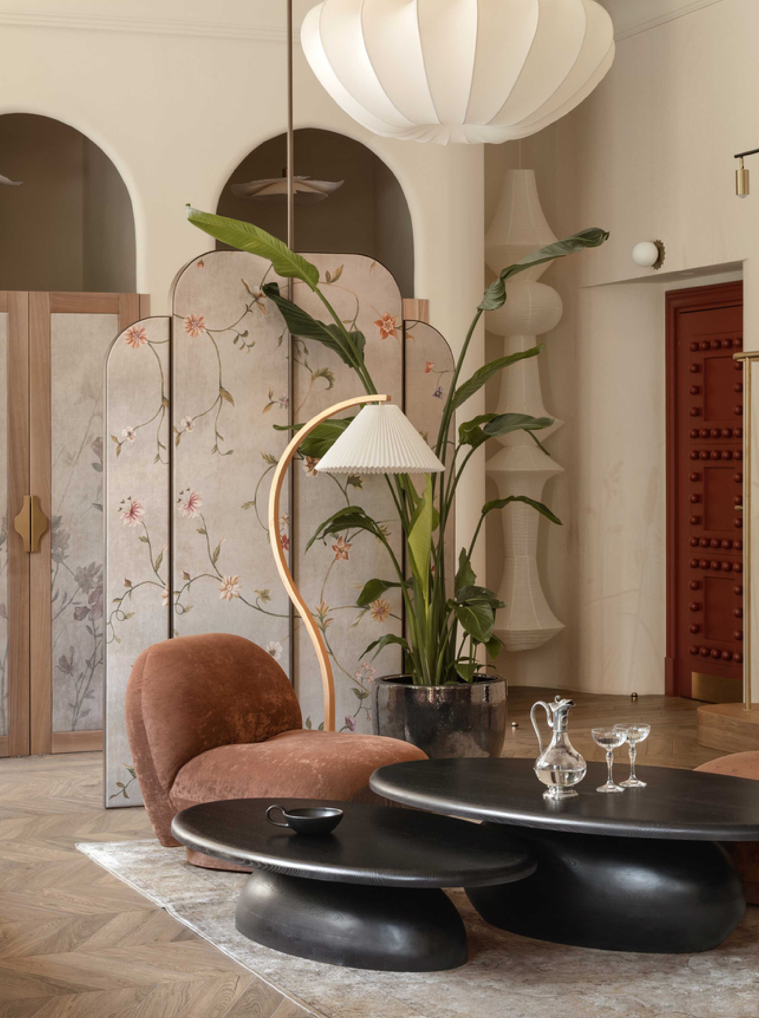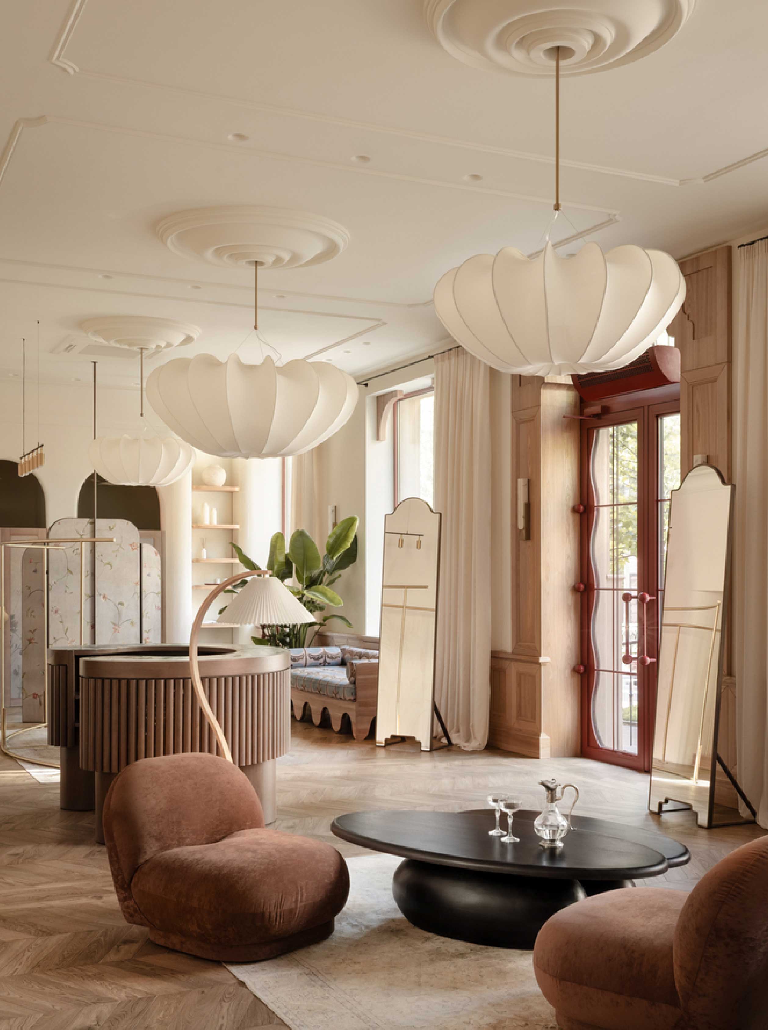 三盞懸掛於中央、以水母為靈感的吊燈,從街道上便能吸引目光,輕柔的弧線與微妙的光影,為空間注入流動與夢幻感。