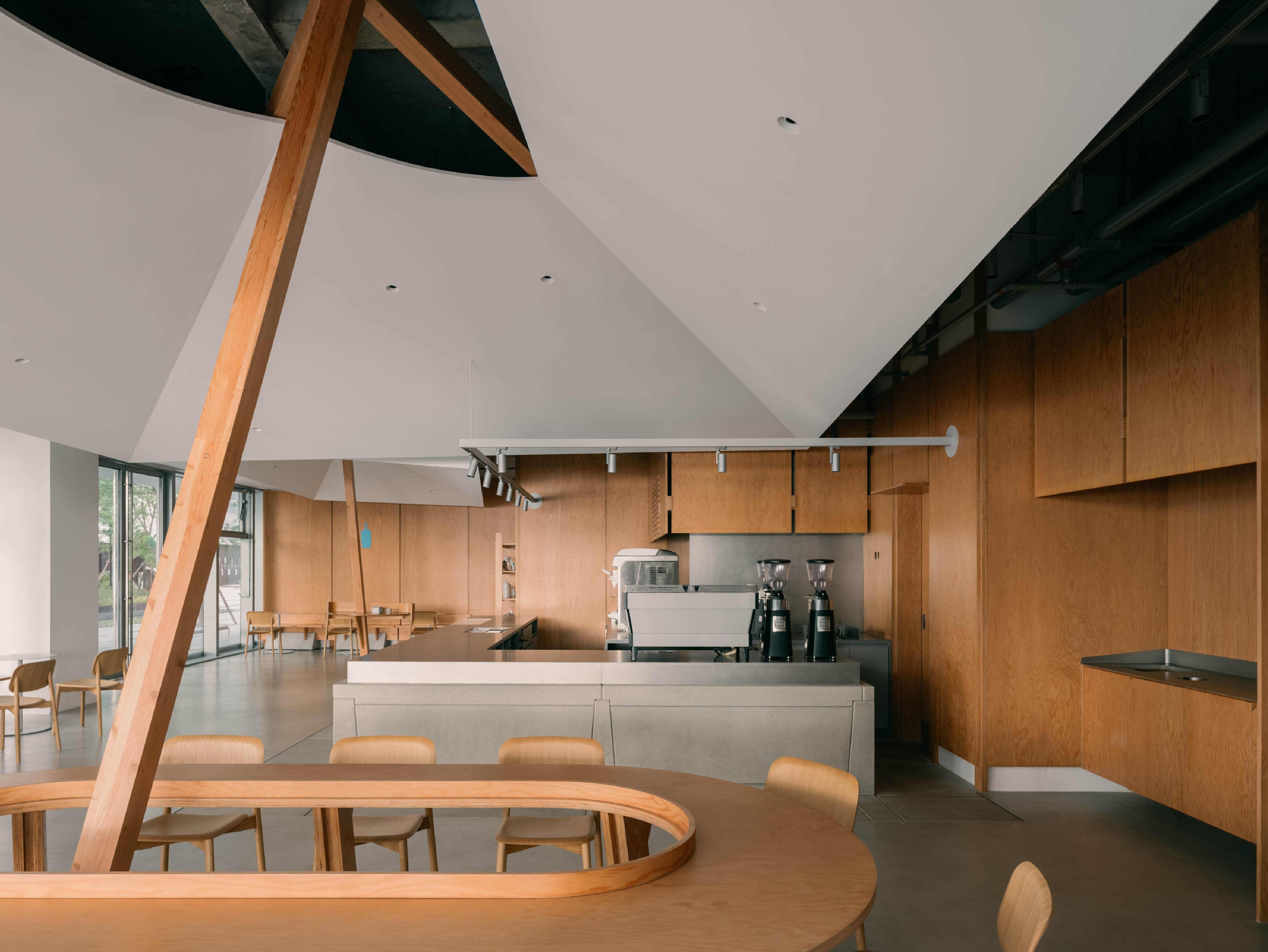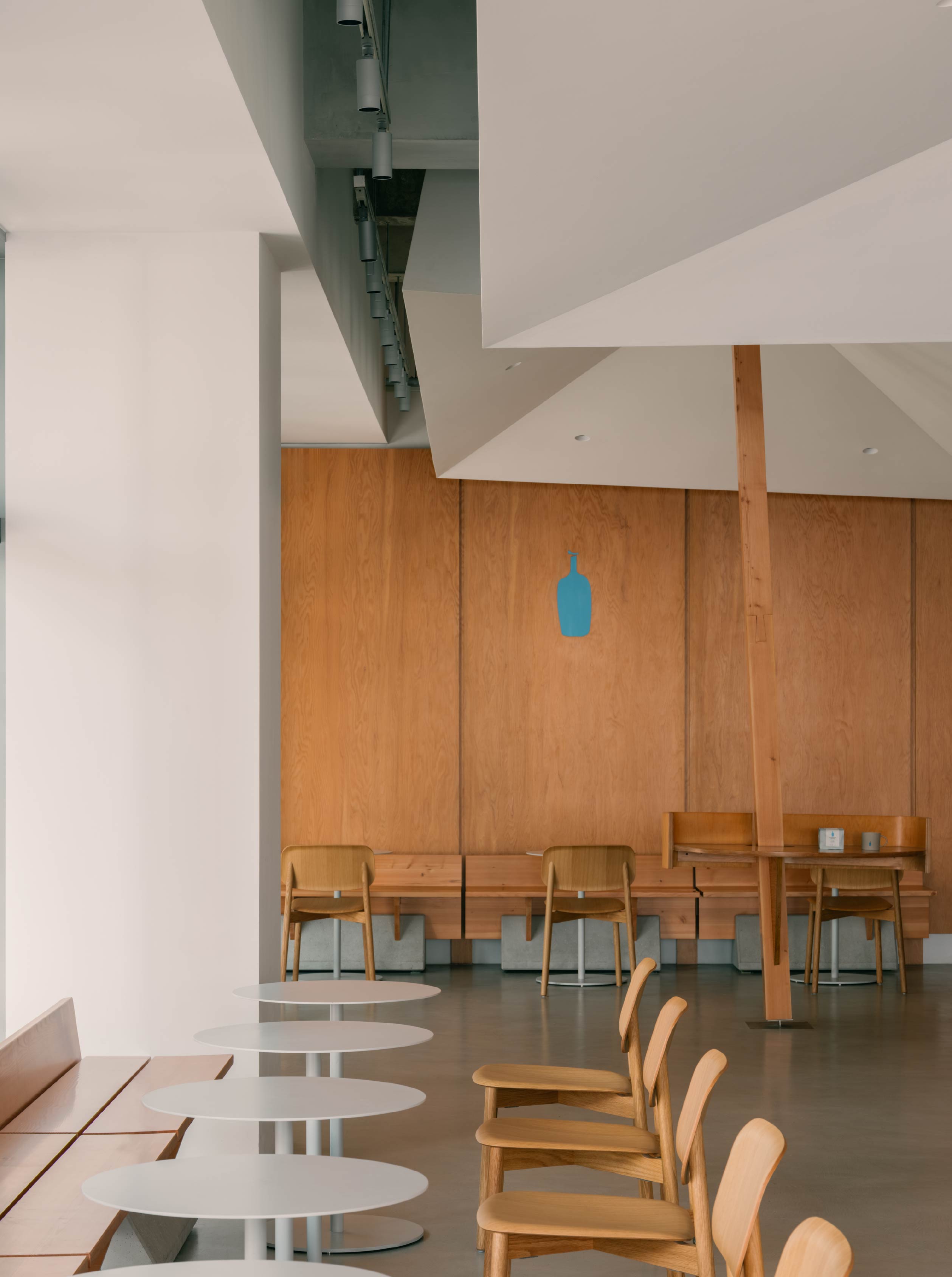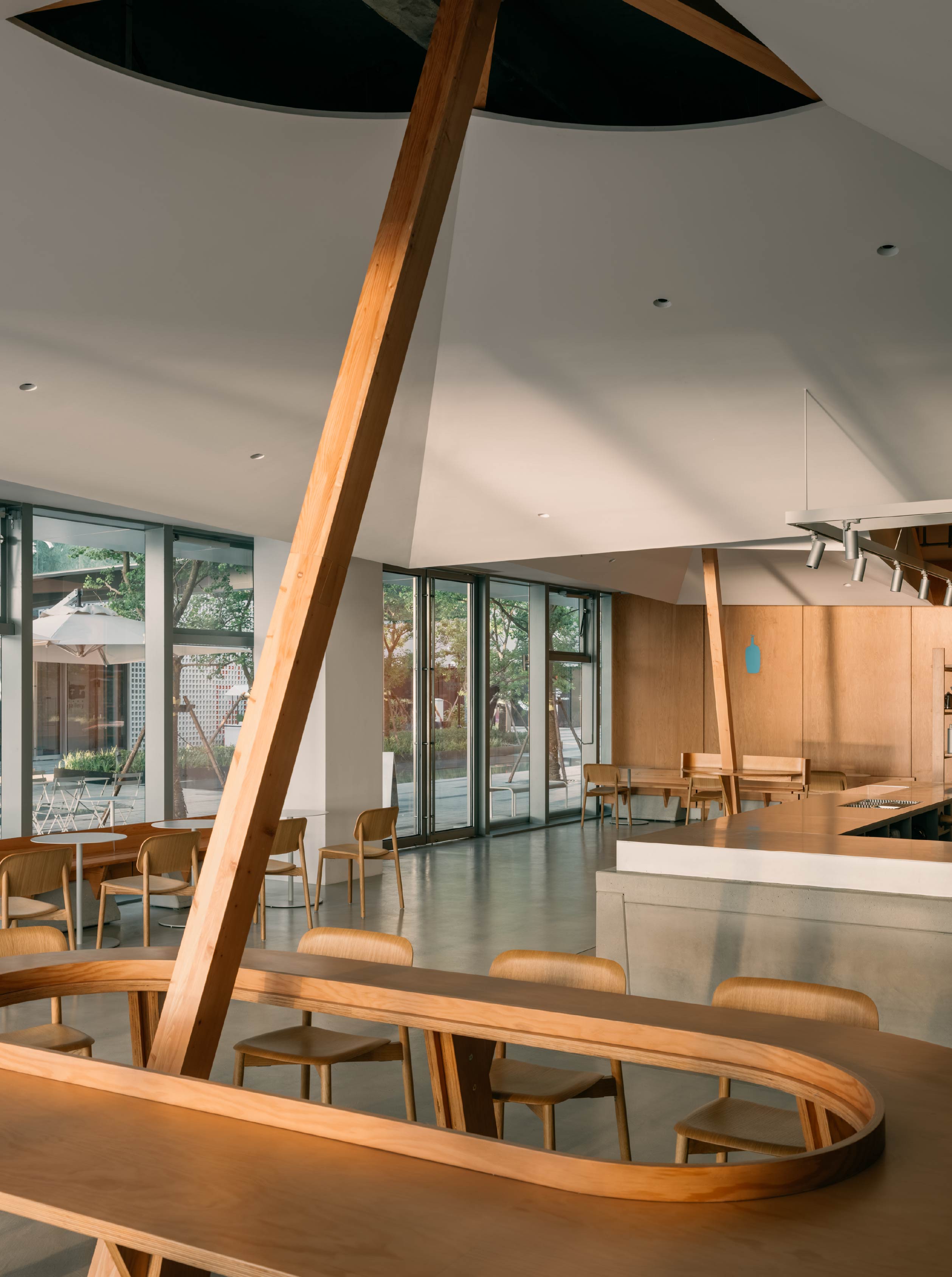 近年來,藍瓶咖啡在全球展店的設計,可以觀察到負責的設計團隊皆重新思考「空間應該如何融入城市」,試圖回應所在的建築條件、城市脈絡與文化特徵。坐落於上海西岸的藍瓶咖啡亦是如此,基地是原來的水泥廠舊址,負責規劃的atelier tao+c西濤設計以獨特的帳幕天花結構、溫潤的木質語彙,再加上延續工業氛圍的預製混凝土構件,將歷史與當代生活融合,成為人們停留、休息、觀望江景的新場所。