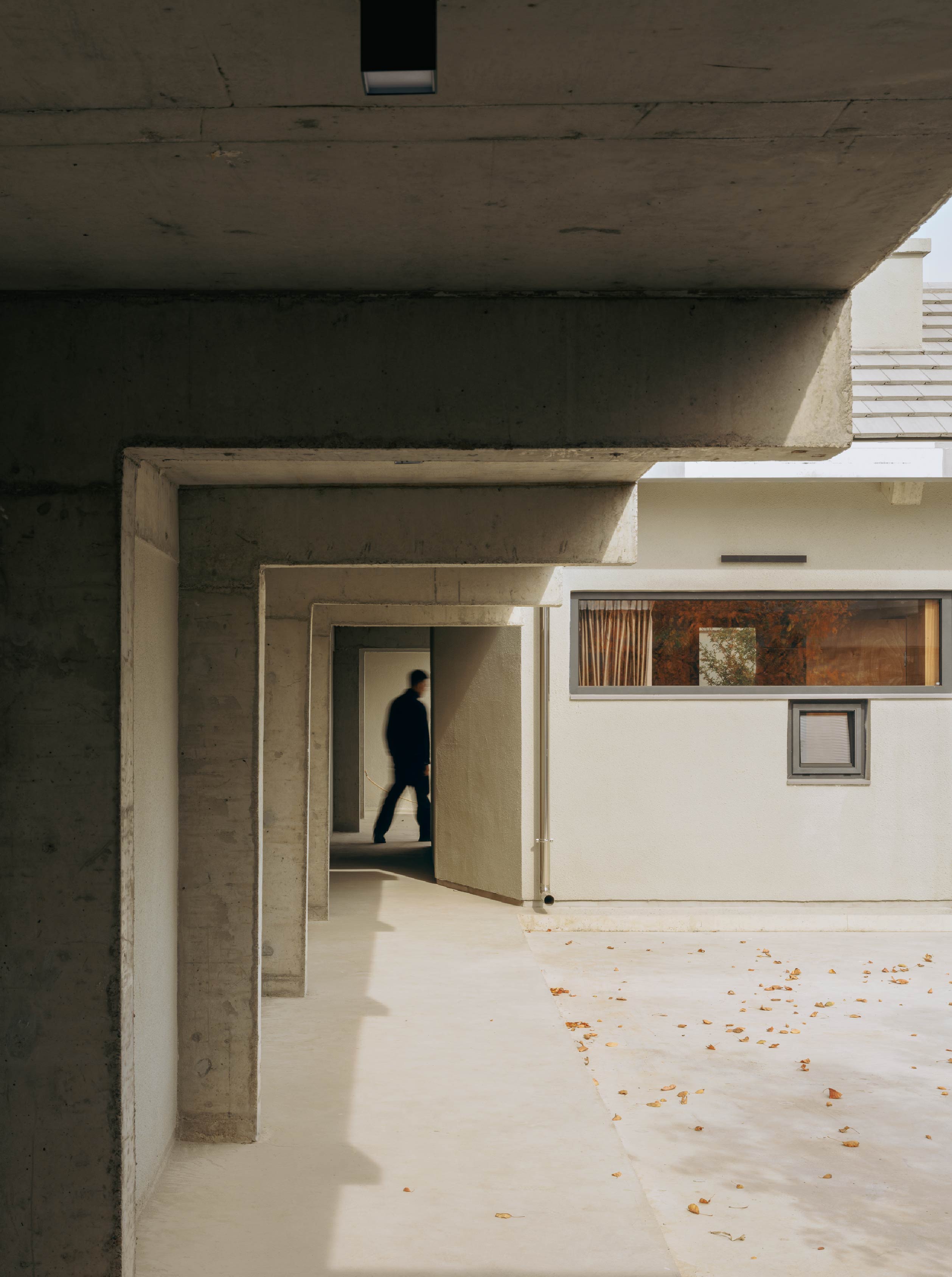 面向街道的外牆採用以疊澀技法堆砌,構成梯形斜面,在街巷呈現匍匐姿態,謙遜而克制。入口門廊順勢延伸出斜屋頂,形成家與外界之間的過渡地帶,下雨時放傘、歸家時緩步,形塑充滿儀式的生活節奏。