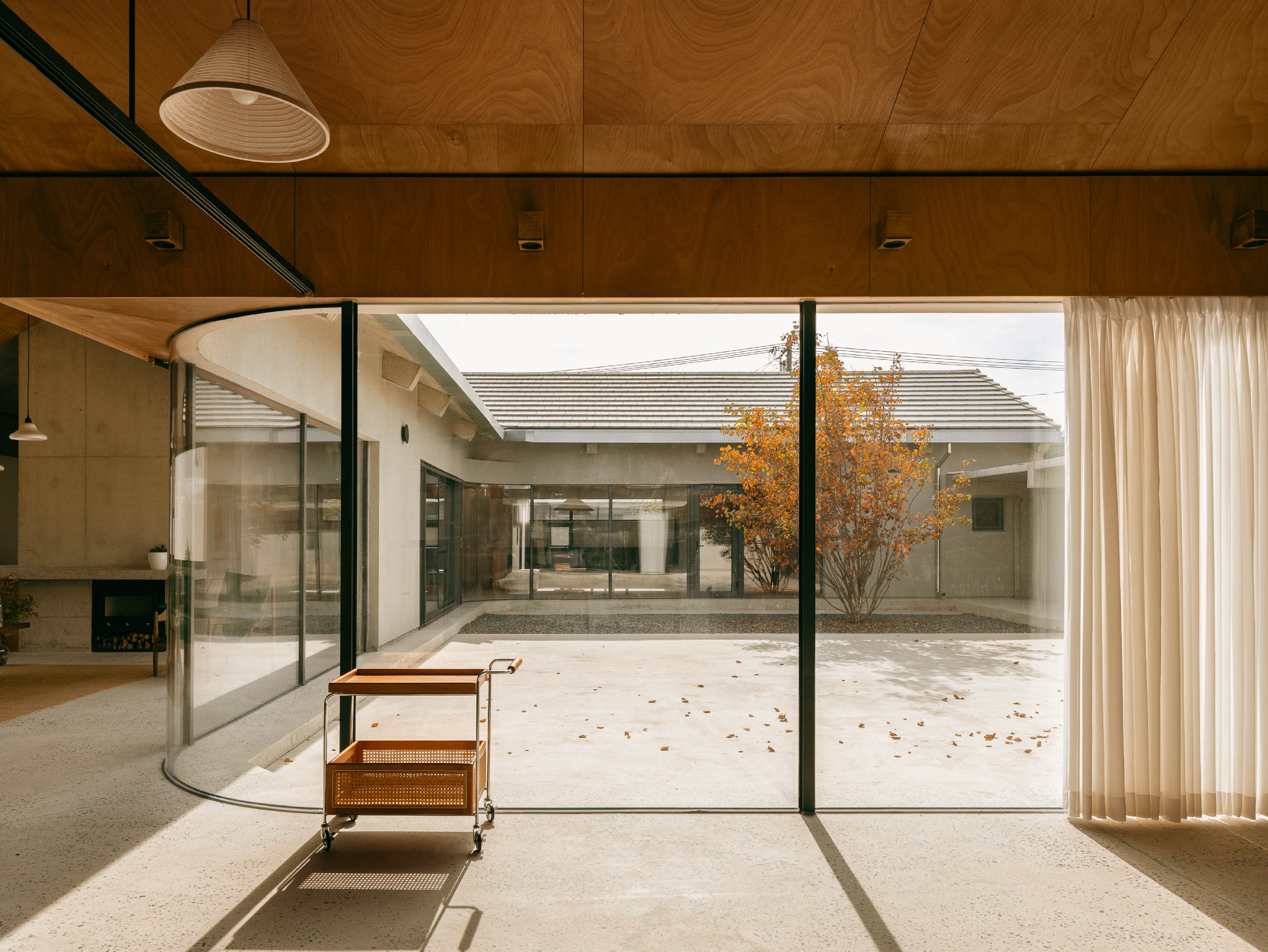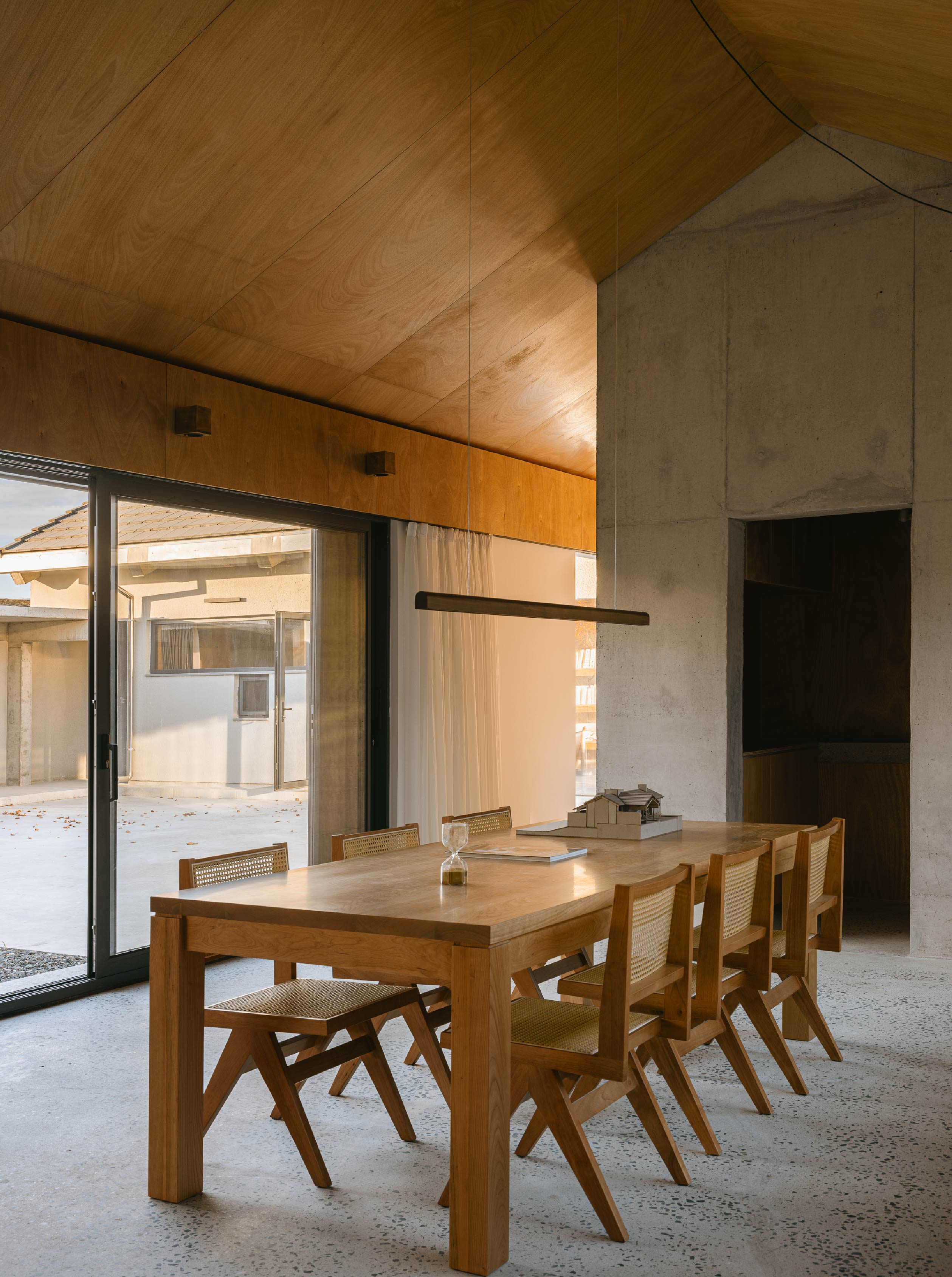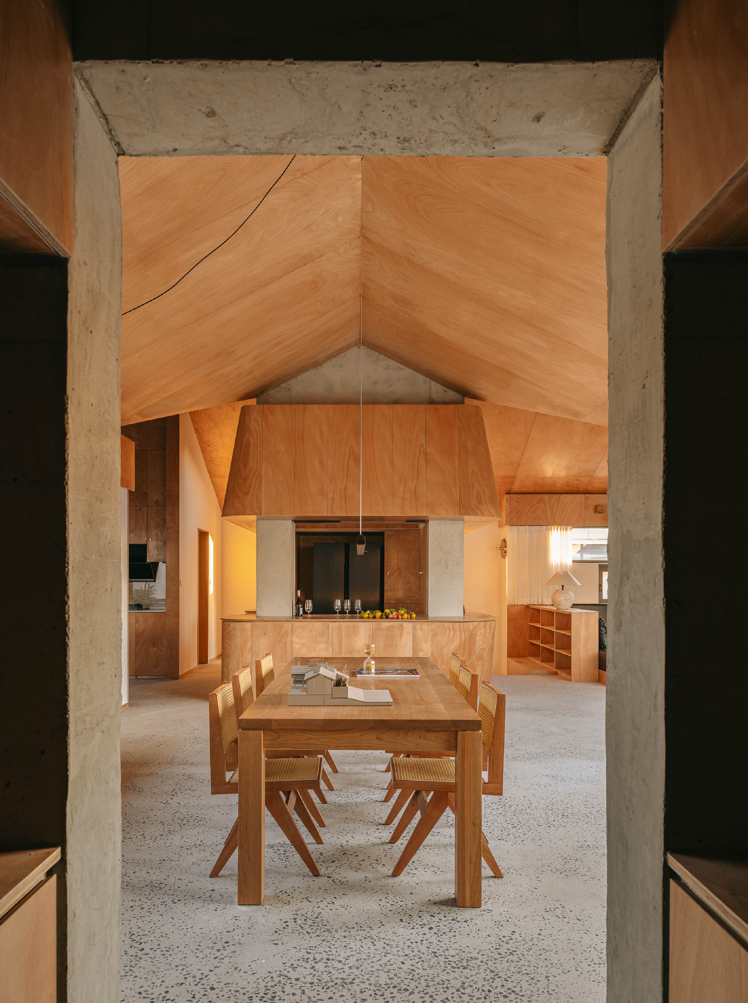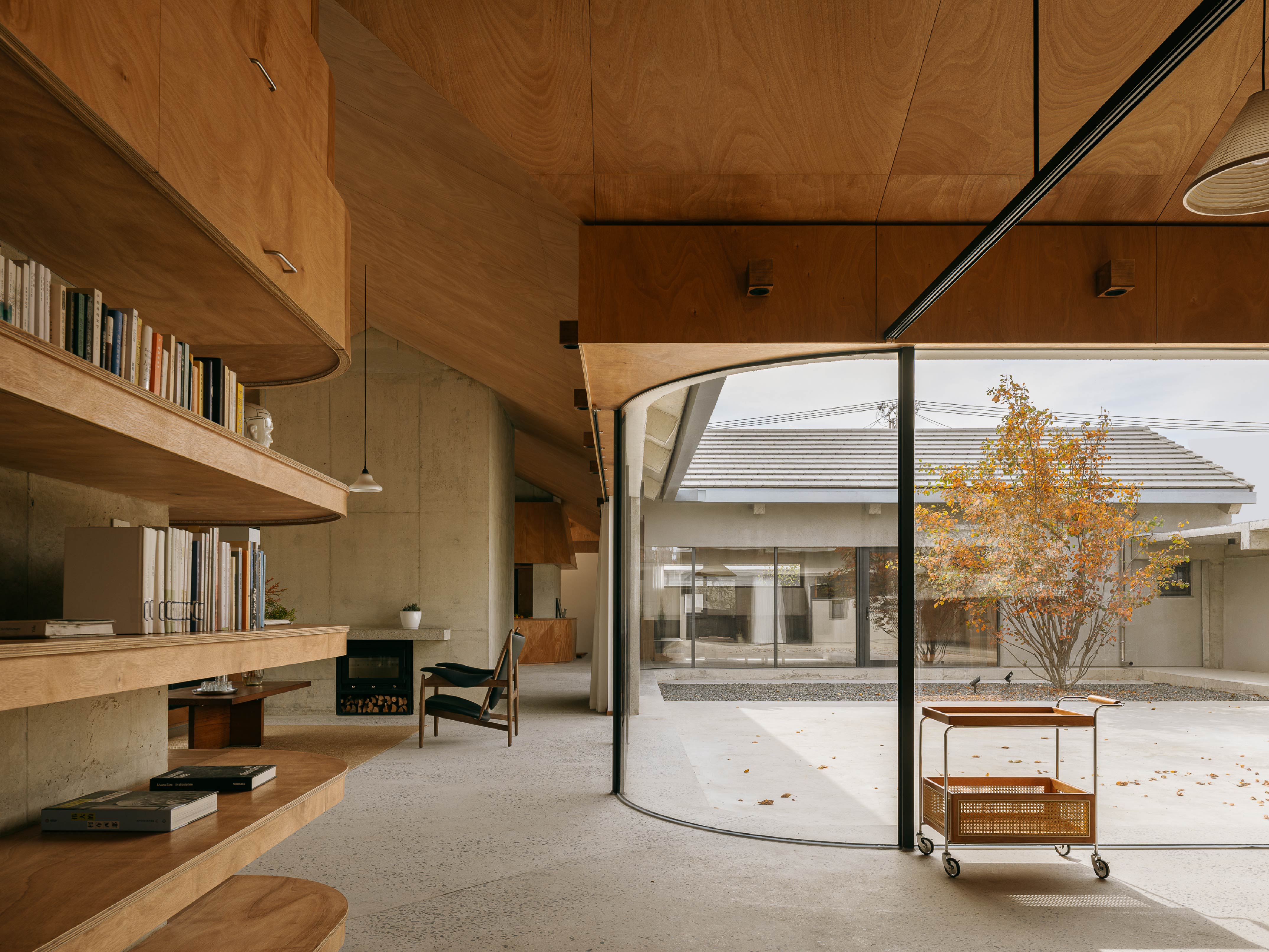 為了讓視野更通透開闊,建築結構集中於屋脊,形成剪力牆桶,屋簷則能向四面挑出,即能安排落地大窗與院落銜接,不僅解除僵硬的邊界,室內外融為一體,也多了包覆庇護感。