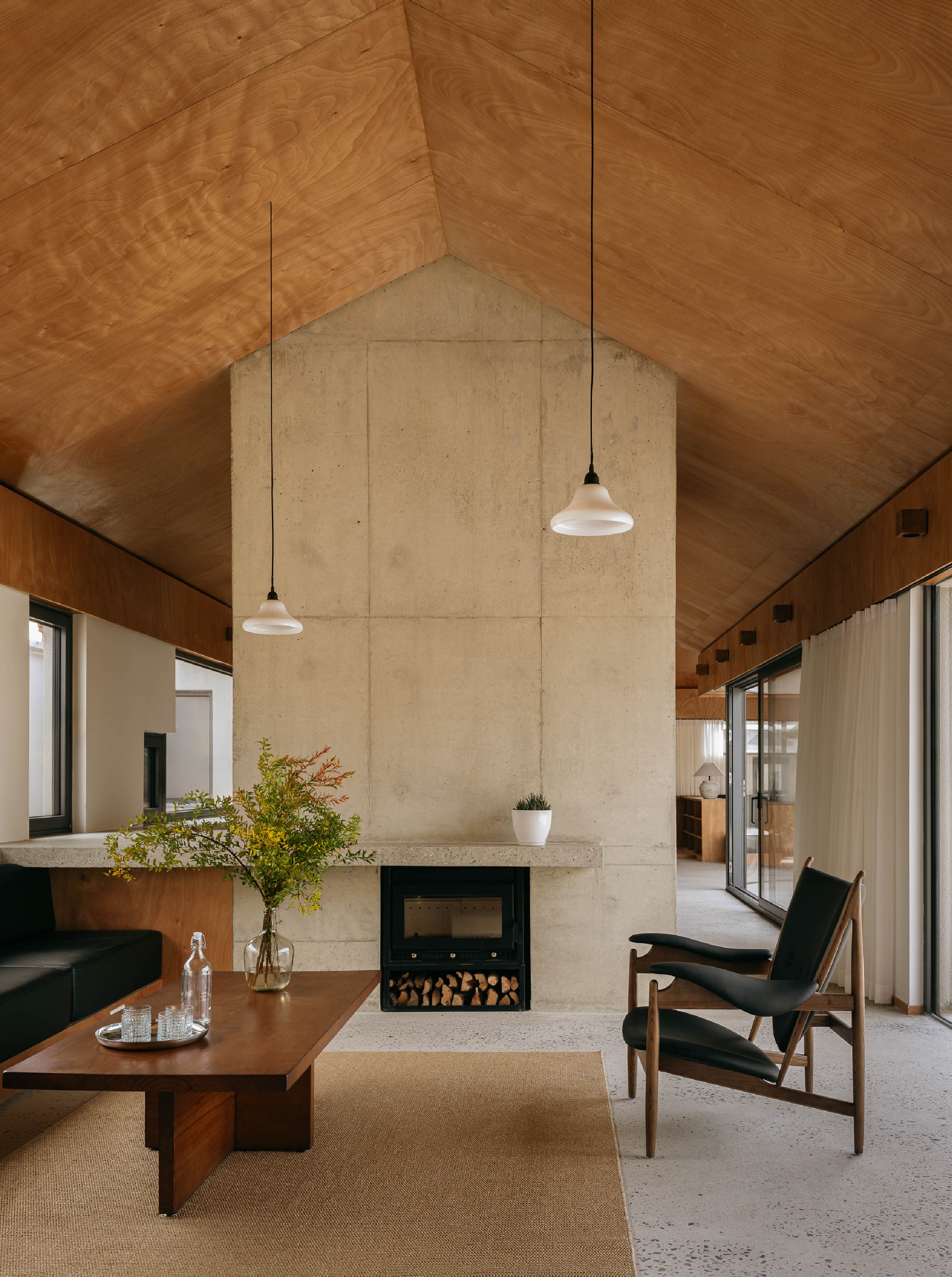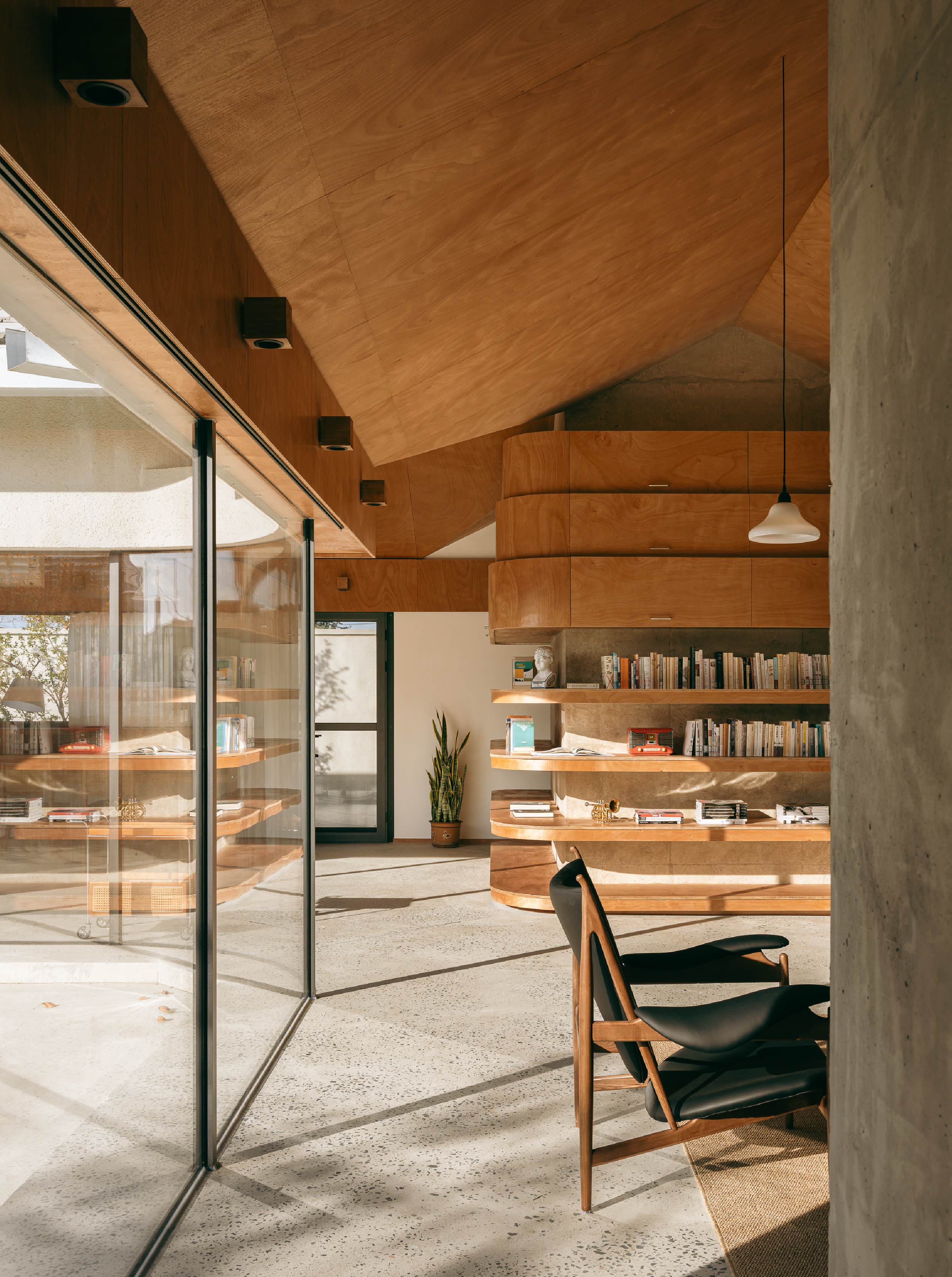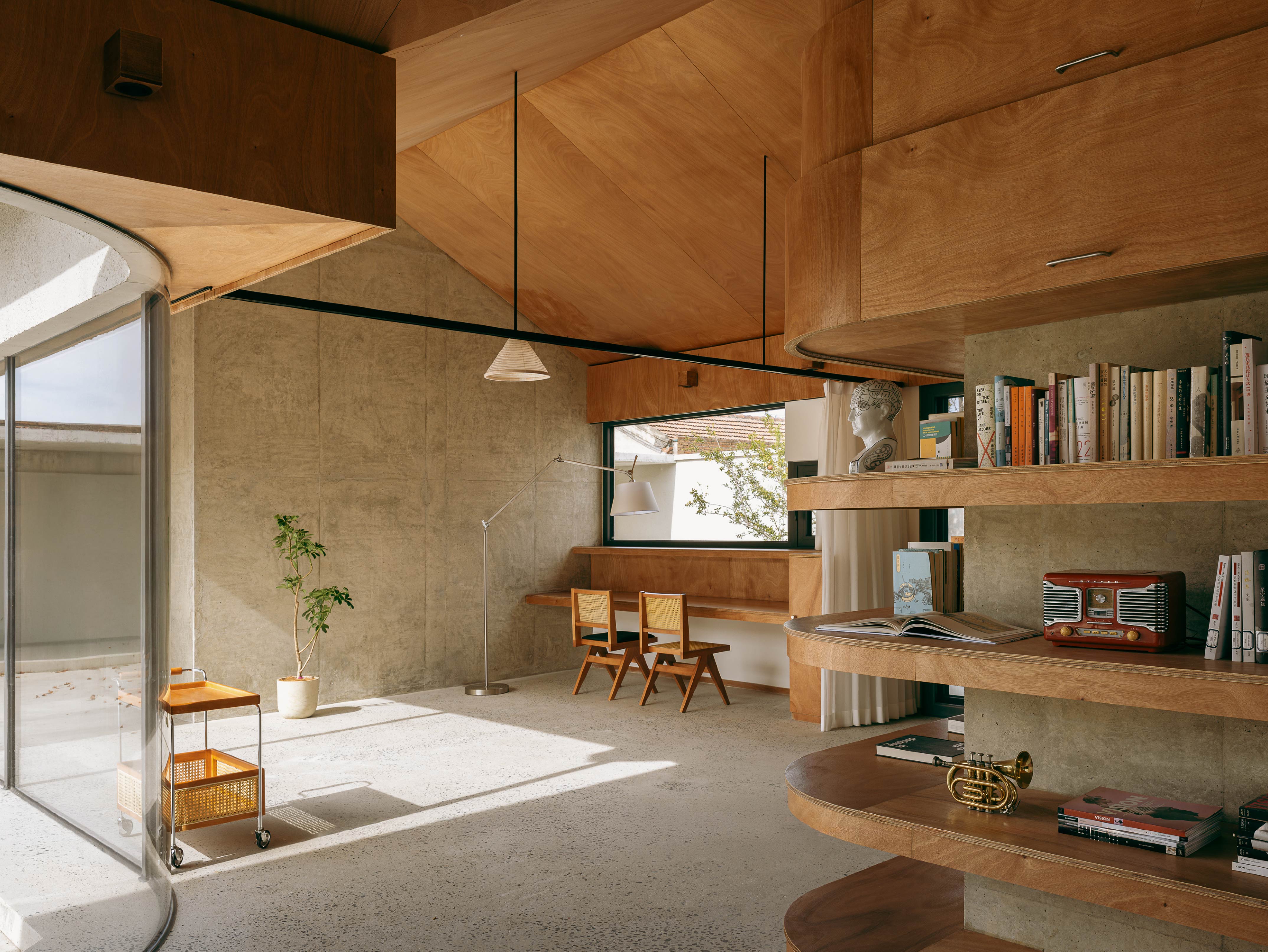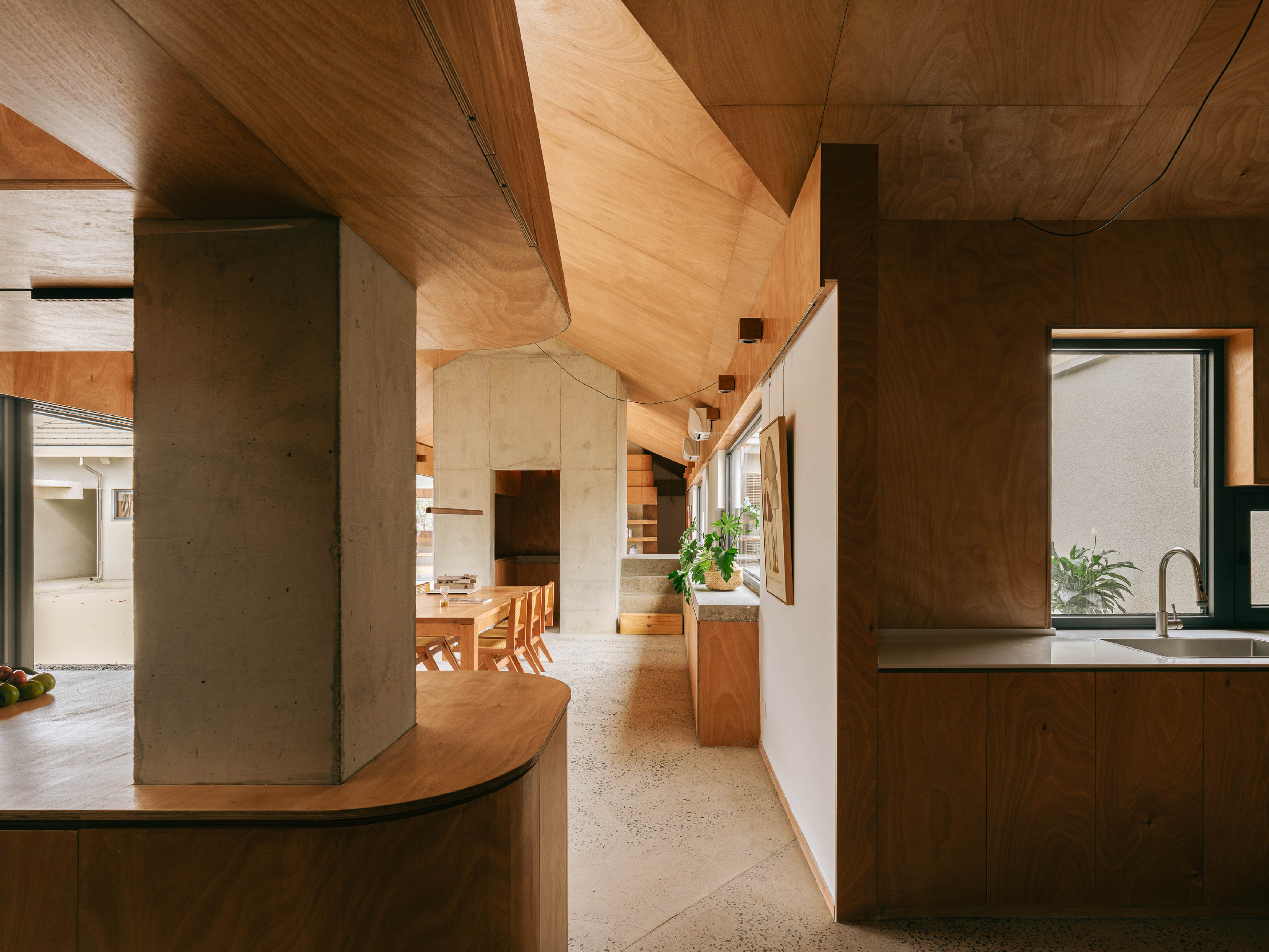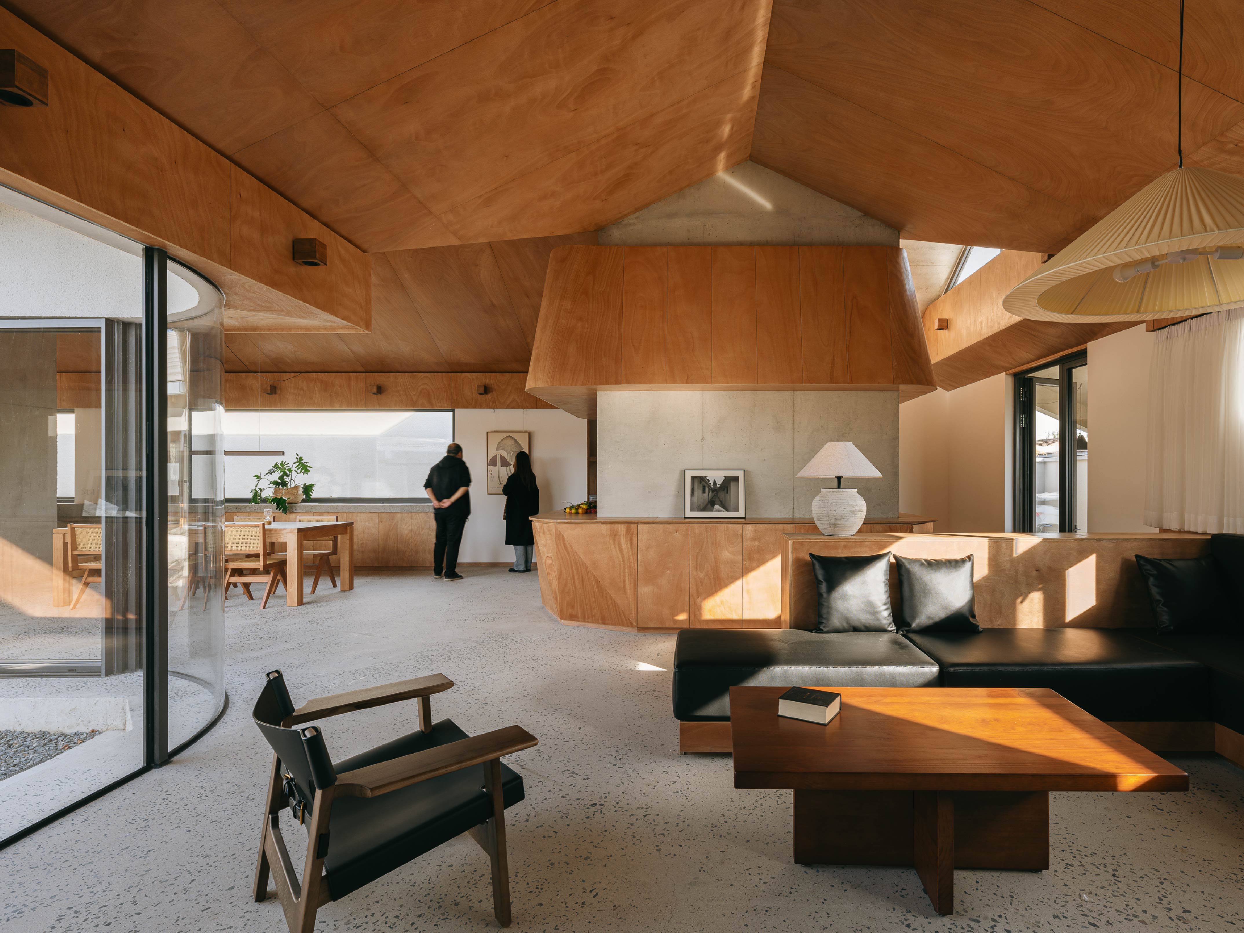 為了讓視野更通透開闊,建築結構集中於屋脊,形成剪力牆桶,屋簷則能向四面挑出,即能安排落地大窗與院落銜接,不僅解除僵硬的邊界,室內外融為一體,也多了包覆庇護感。