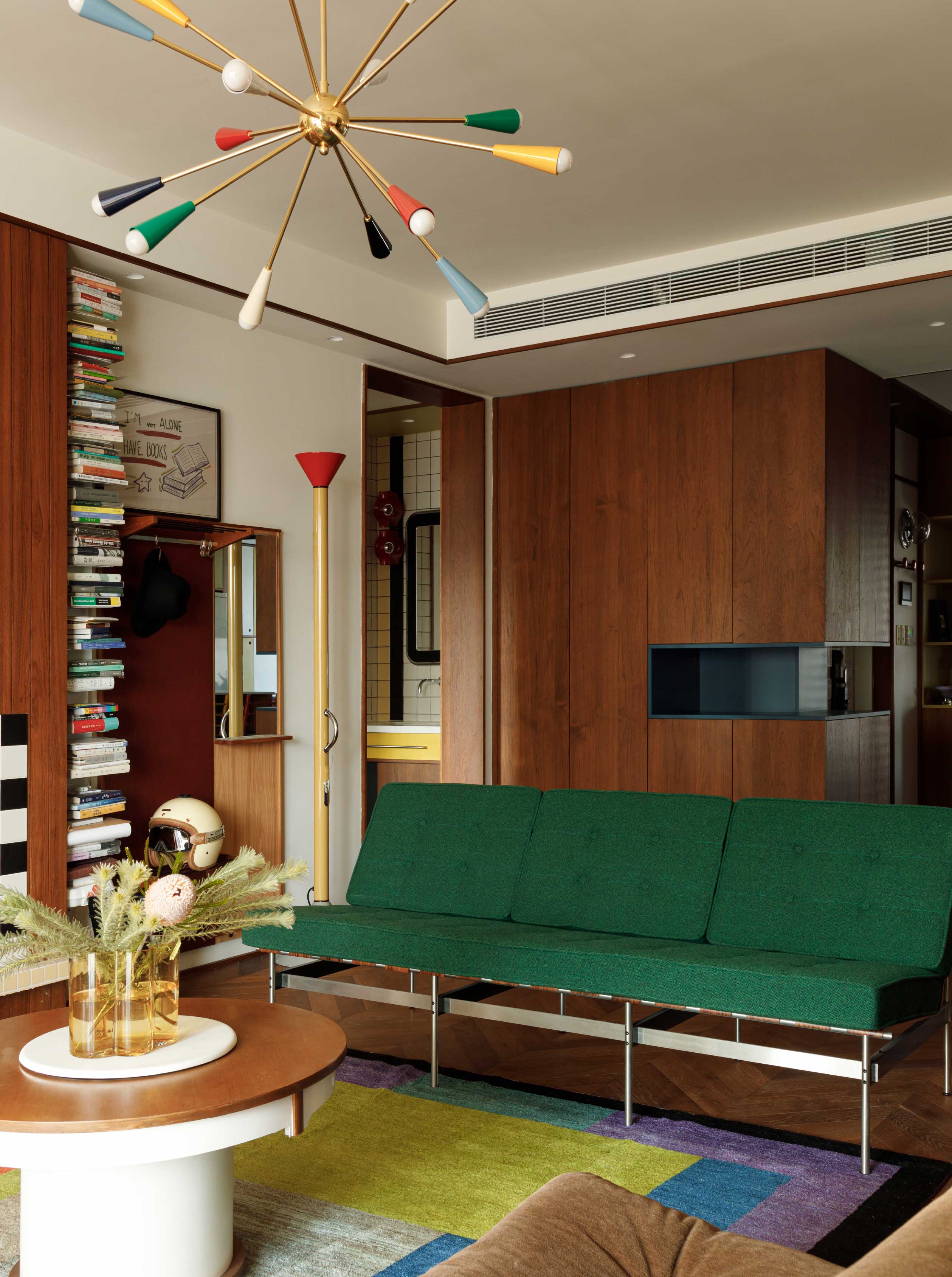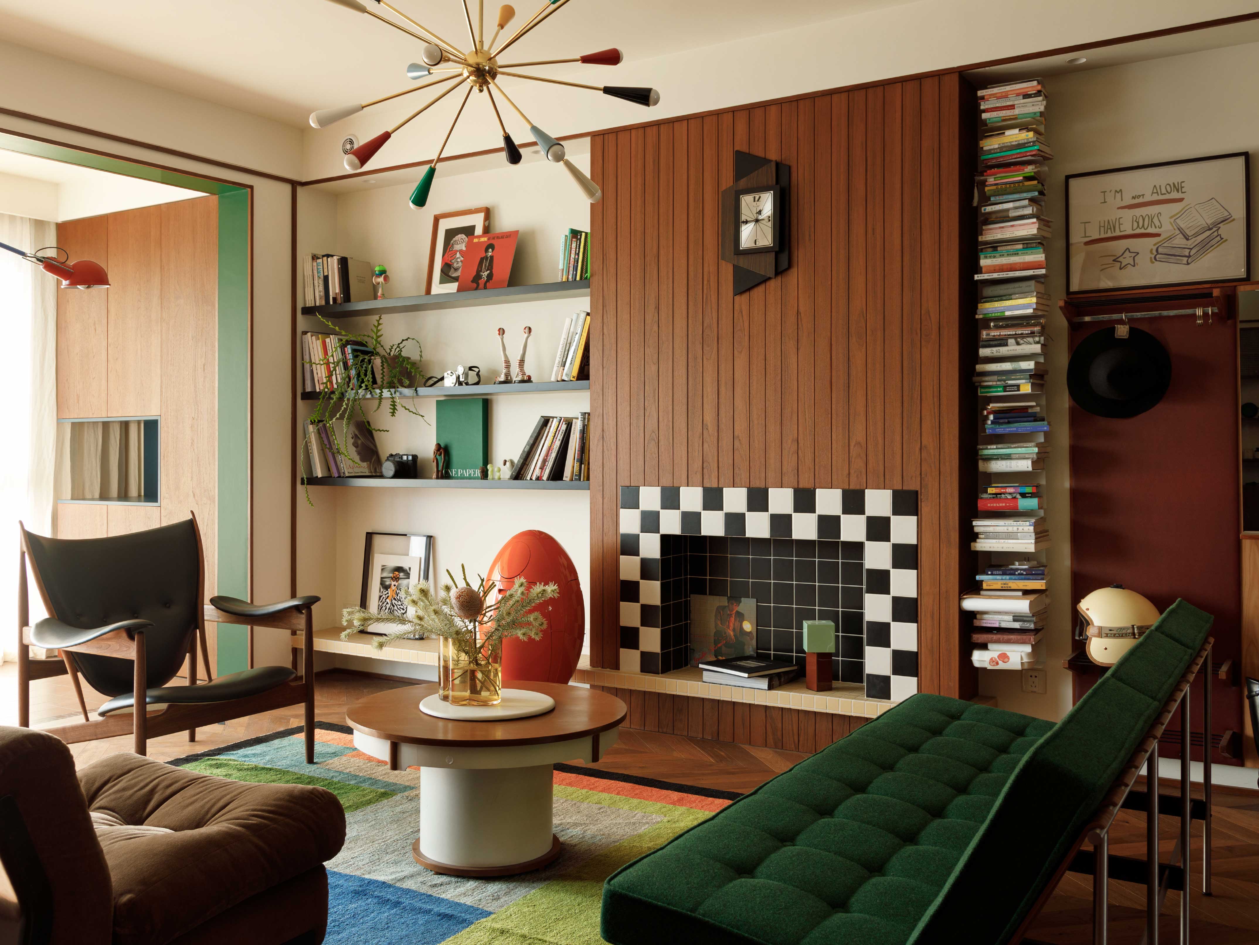 中央則懸掛60年代的Sputnik彩色吊燈,與手工色塊地毯相互映襯,跳躍色彩與幾何光影結合,迎來復古印象。而壁爐兩側採用非對稱設計,打破制式規律,也讓書籍與藏品各得其所。