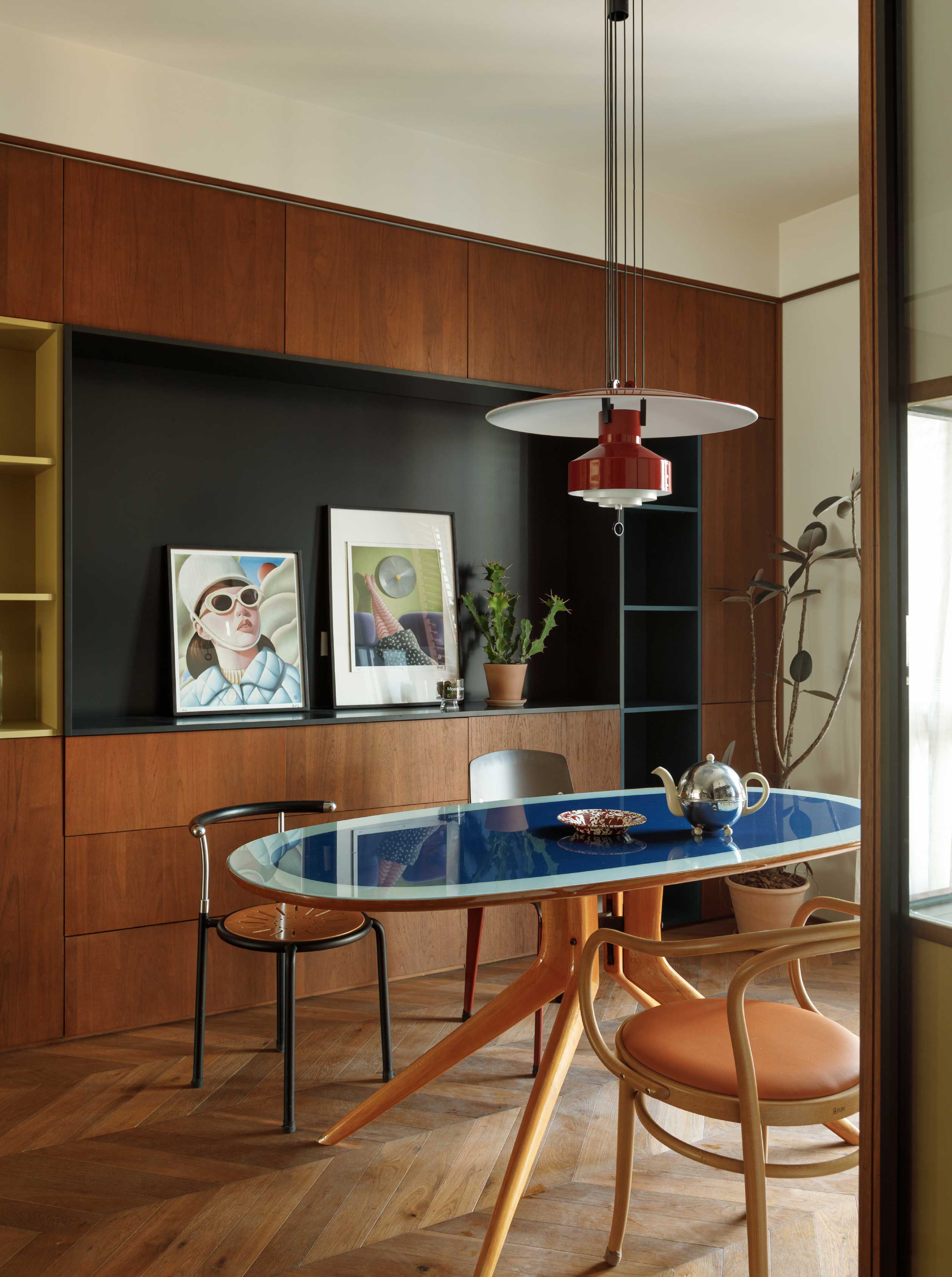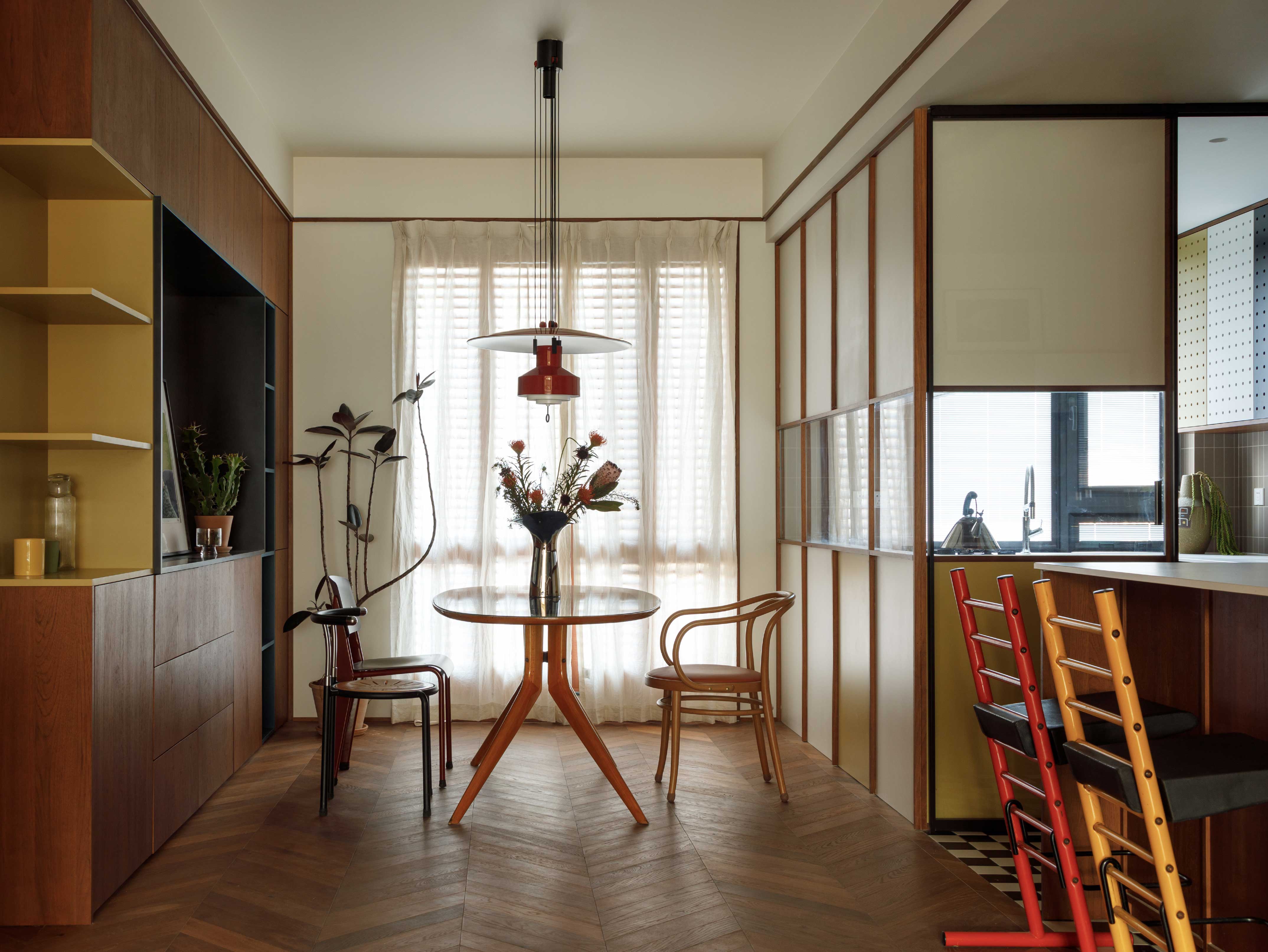 餐廳安排藍色復古餐桌,上方垂掛Stilnovo Saliscendi紅色吊燈,映襯芥黃邊櫃,三原色交錯呈現,鮮明的濃彩色調成為視覺焦點。