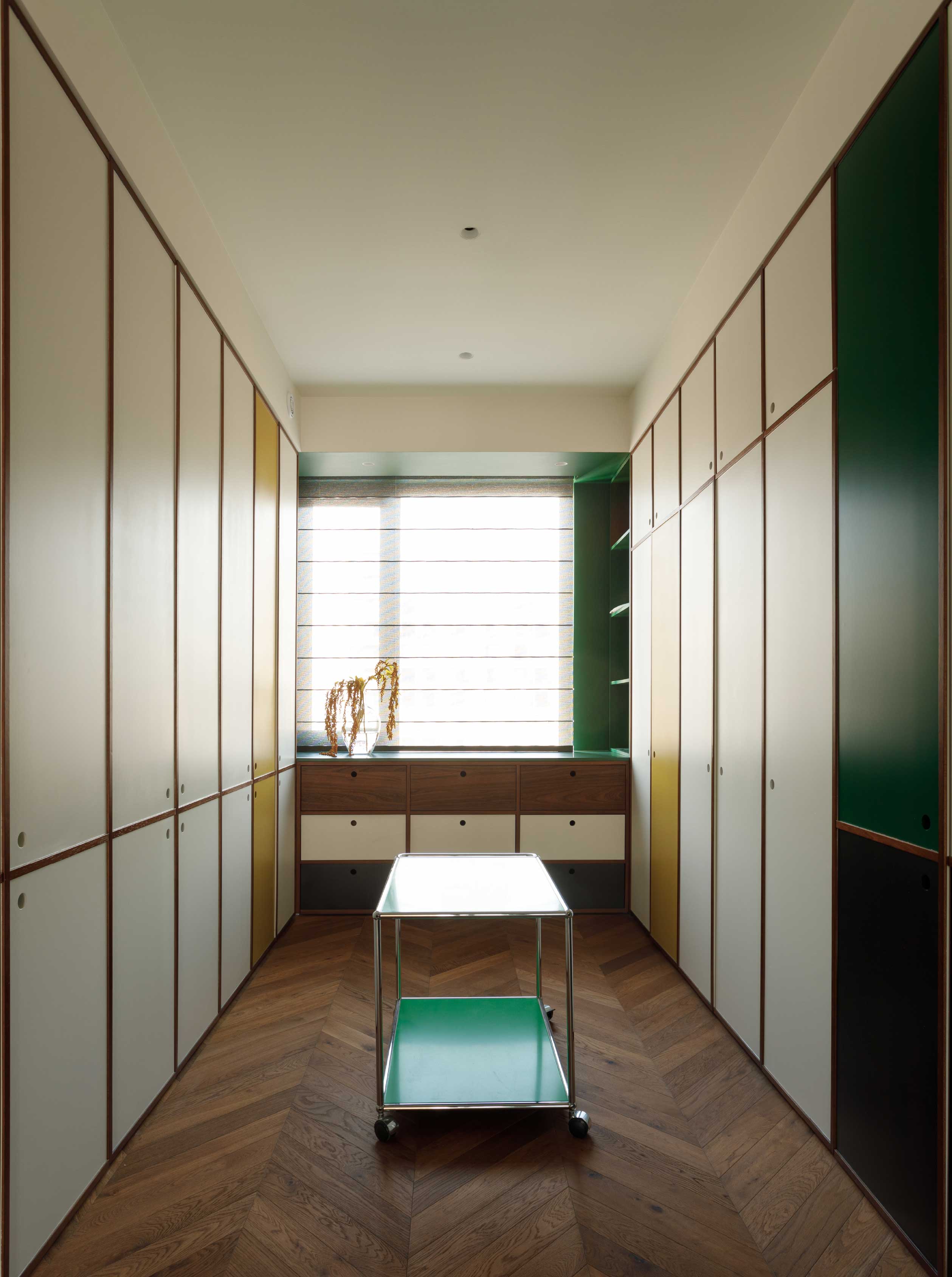 更衣室則配置白色櫃體,巧妙運用綠、黃、黑的色塊搭配,提升視覺節奏也強化收納分類。主衛納入蒙德里安的畫作結構,選用手工小磚與幾何色塊拼貼,使機能空間也保有藝術感。