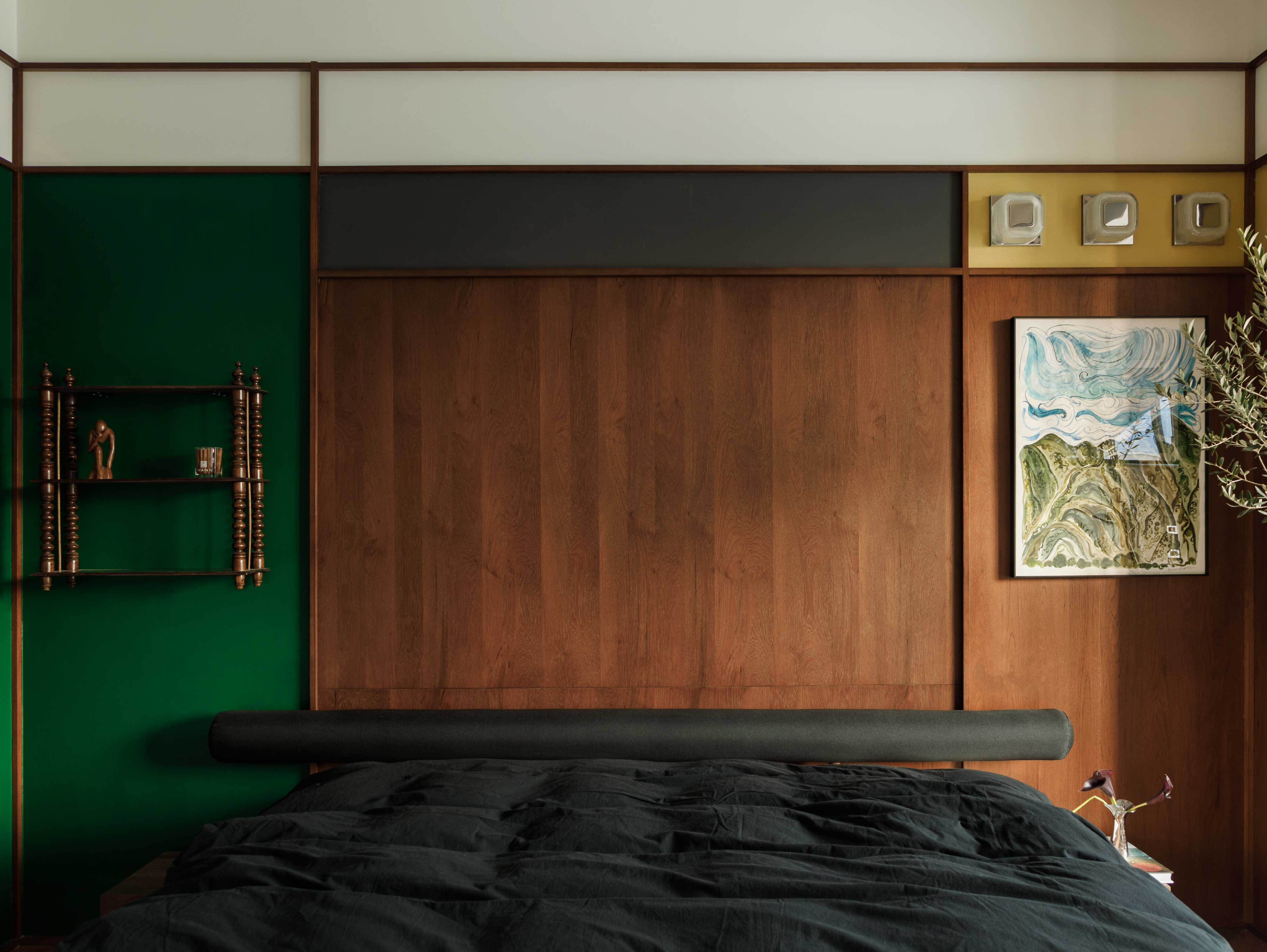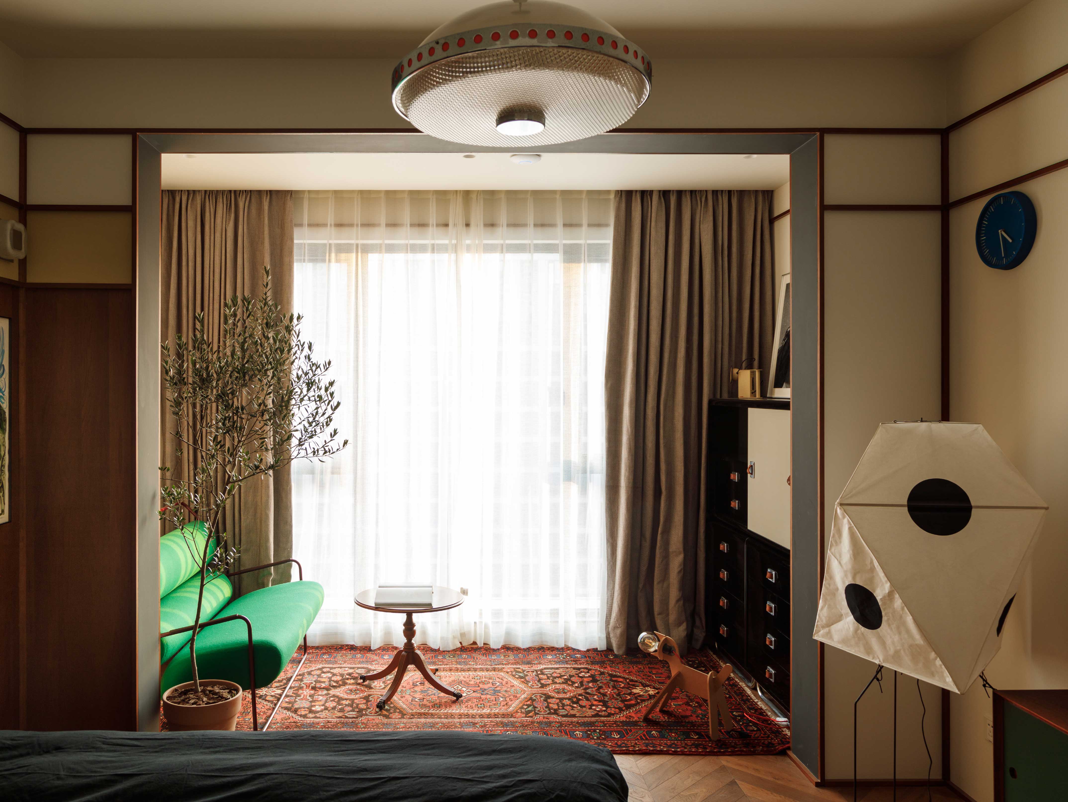 主臥延續空間的綠色脈絡,選用Sancarlo綠色沙發,搭配波斯地毯,構成一處可閱讀、可小憩的私密角落。床頭燈與吊燈皆為歐洲中古品,呼應低調細膩的未來主義語彙。