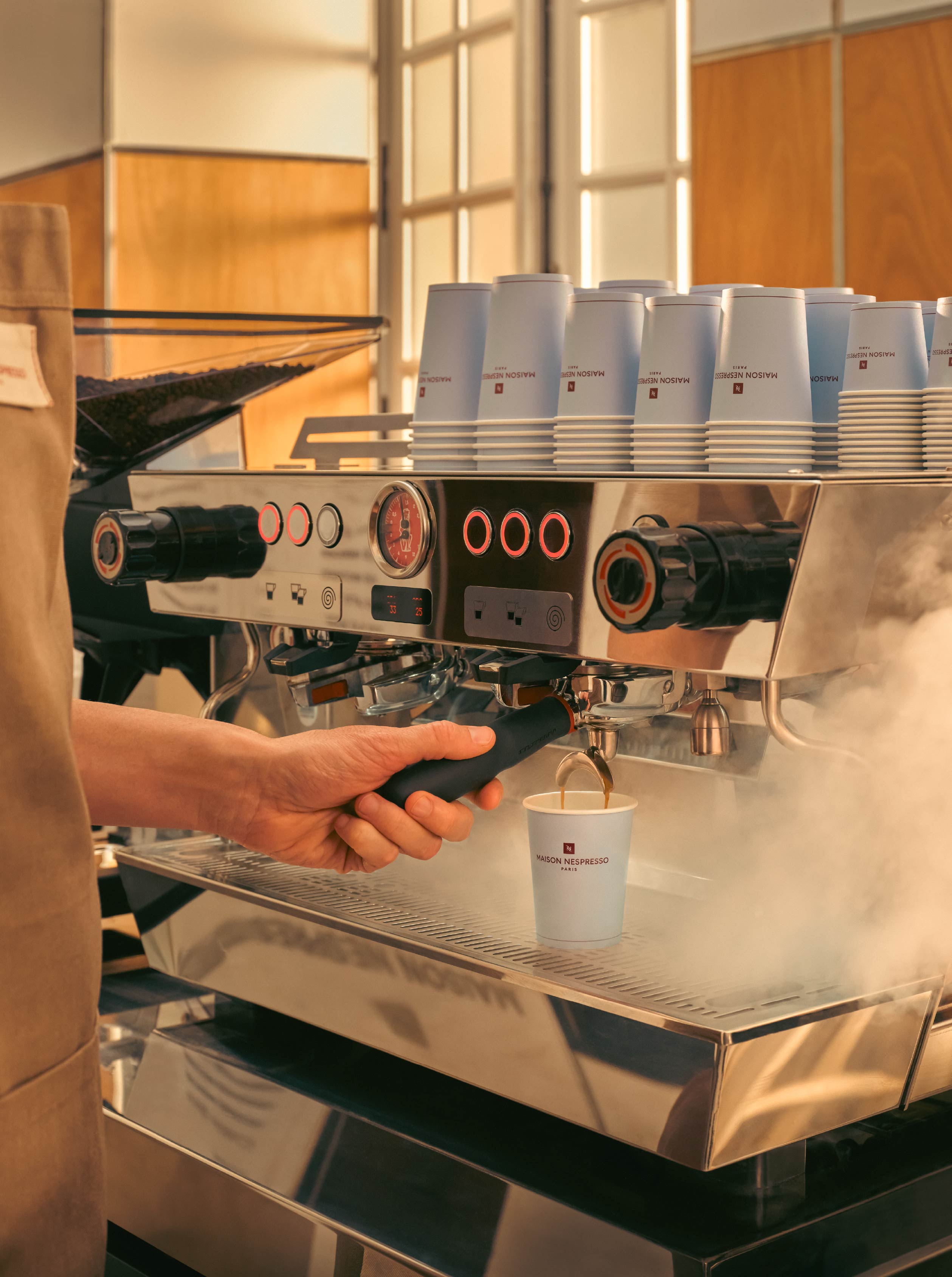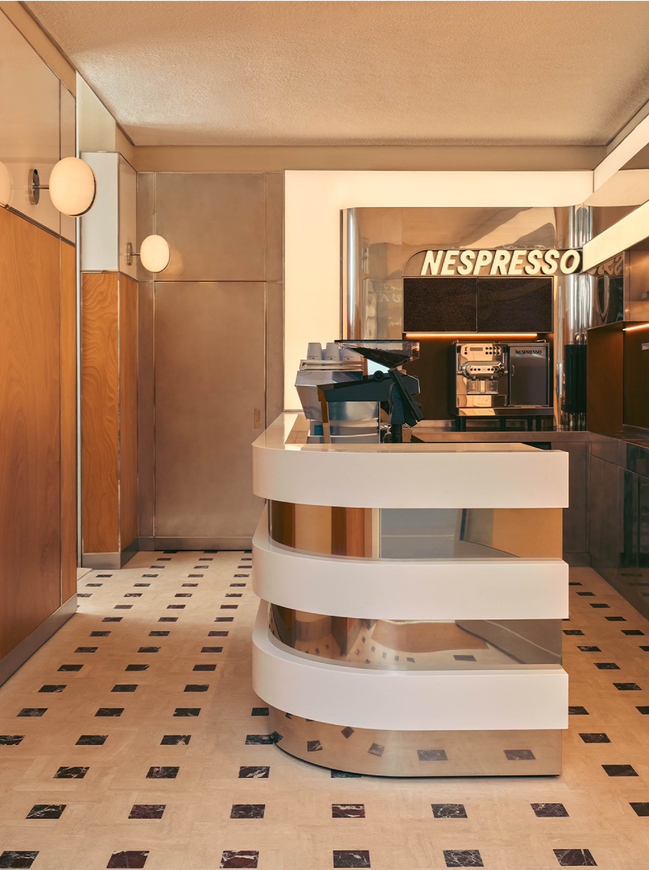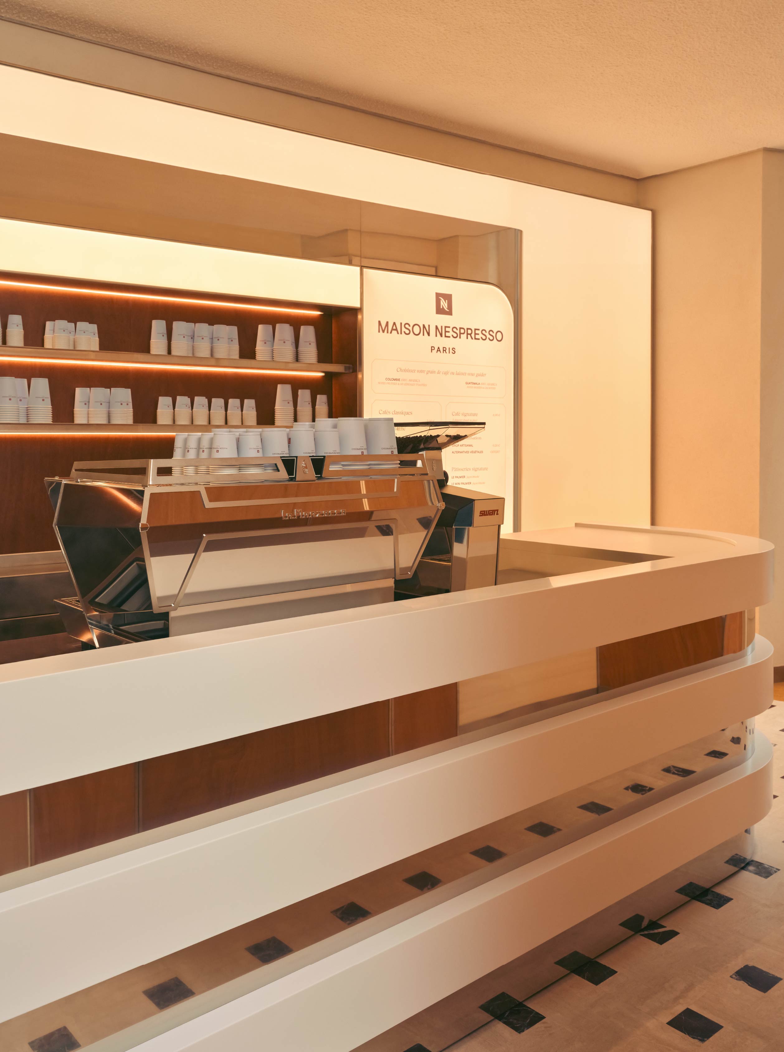 於是,拋光金紅石鋁製吧檯呼應義大利濃縮咖啡機的線條,也隱喻著現代交通工具的機身造型,象徵咖啡從世界各地而來的旅程。地坪則是以石灰石鑲嵌櫻桃色大理石,靈感來自義大利傳統的大理石鑲嵌工藝,而特別為了這個案子訂製的乳白吹製玻璃燈具,造型有如咖啡豆,是向 Vico Magistretti 經典設計的俏皮致敬。天花板則以潔白的起伏造型呈現出奶泡般的輕盈質地,讓整體氛圍更顯溫潤柔和,像一杯剛完成的卡布奇諾,帶著細膩的層次與暖意。