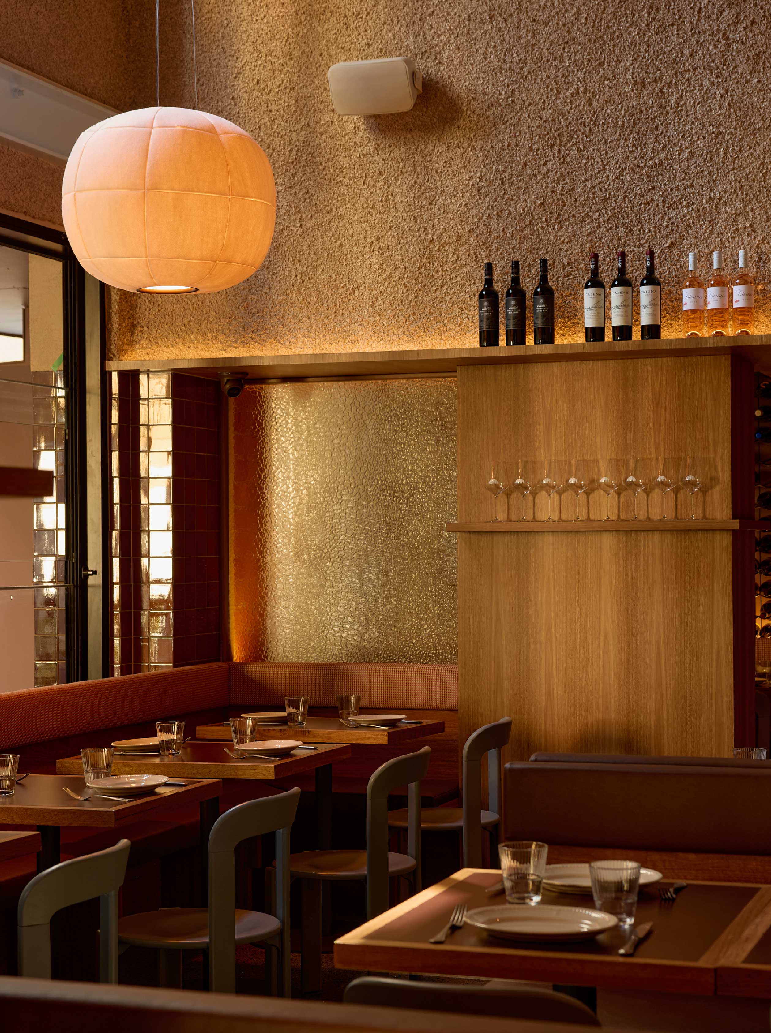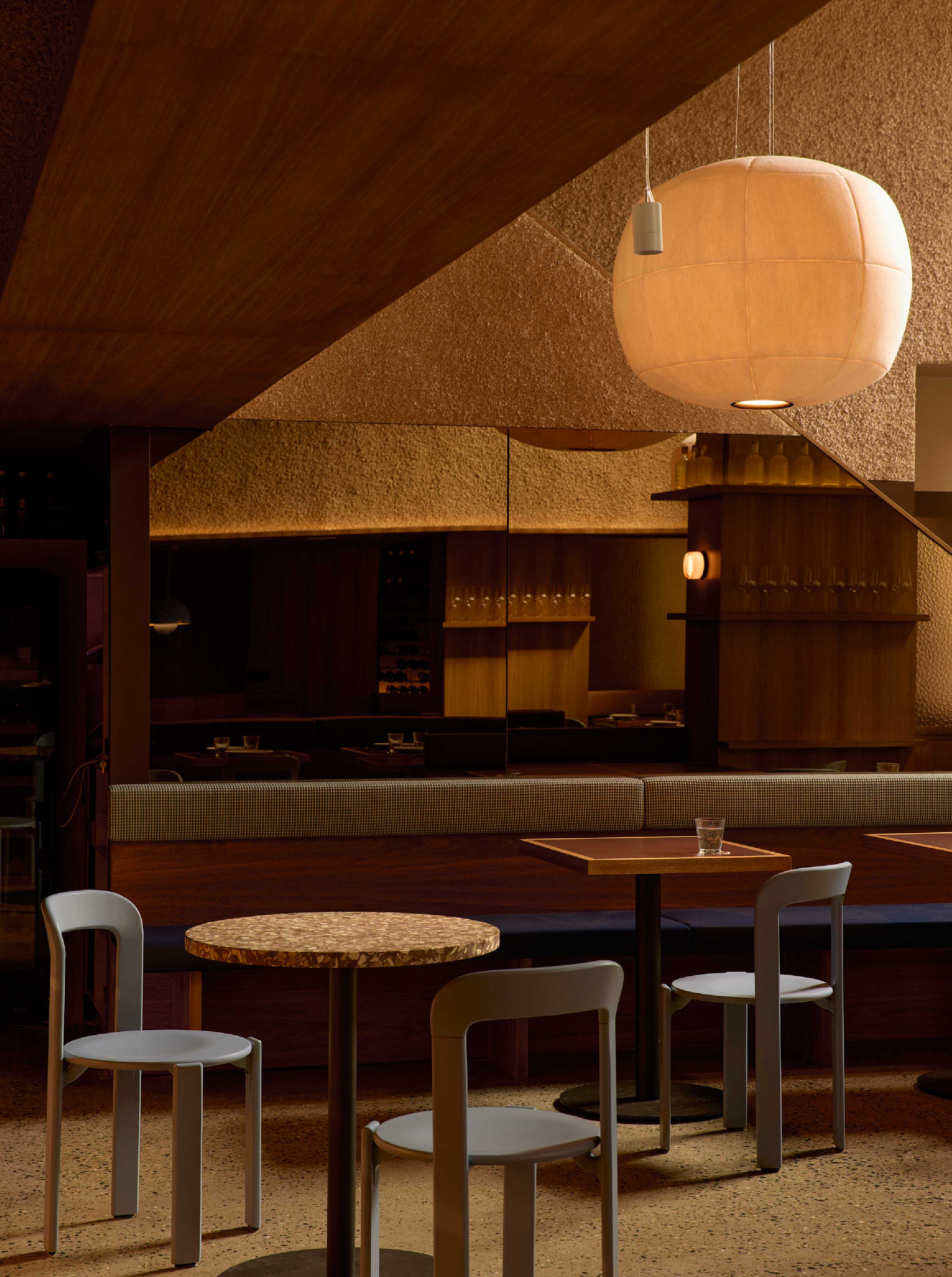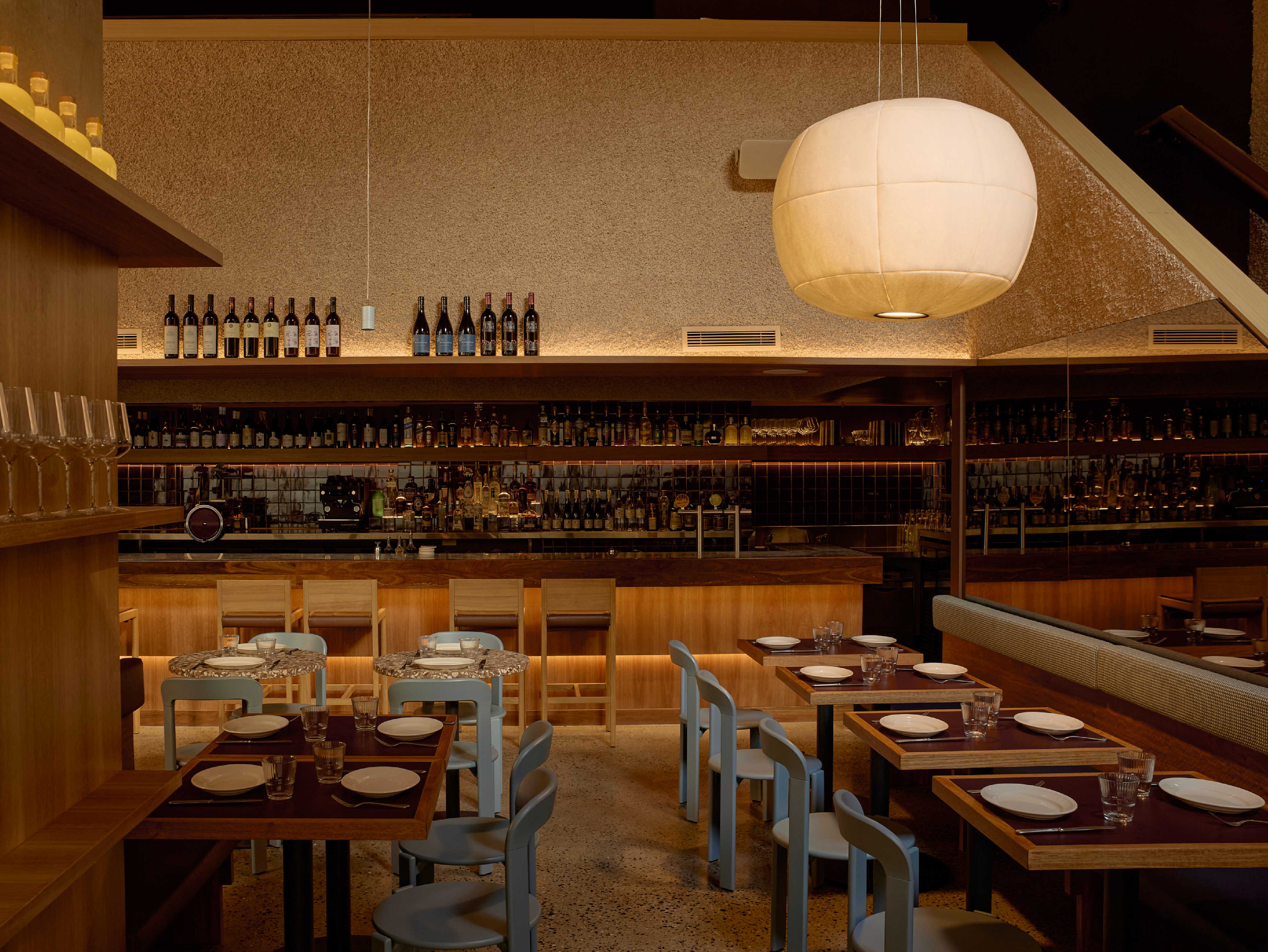 這間可容納百席的 Bar Monte Newstead,設計師 Will Rathgeber 以義大利理性主義為設計主軸,將「結構與秩序」作為空間語言,藉由層次分明的格局安排與光線控制,重現義式餐廳的當代節奏。裸露的混凝土柱體形成清晰骨架,搭配木質與陶磚,空間在冷暖之間取得平衡。中央的幾何長椅貫穿主要動線,柔化結構線條,上方懸掛的羊毛吊燈以柔光覆蓋全室,帶出放鬆節奏。