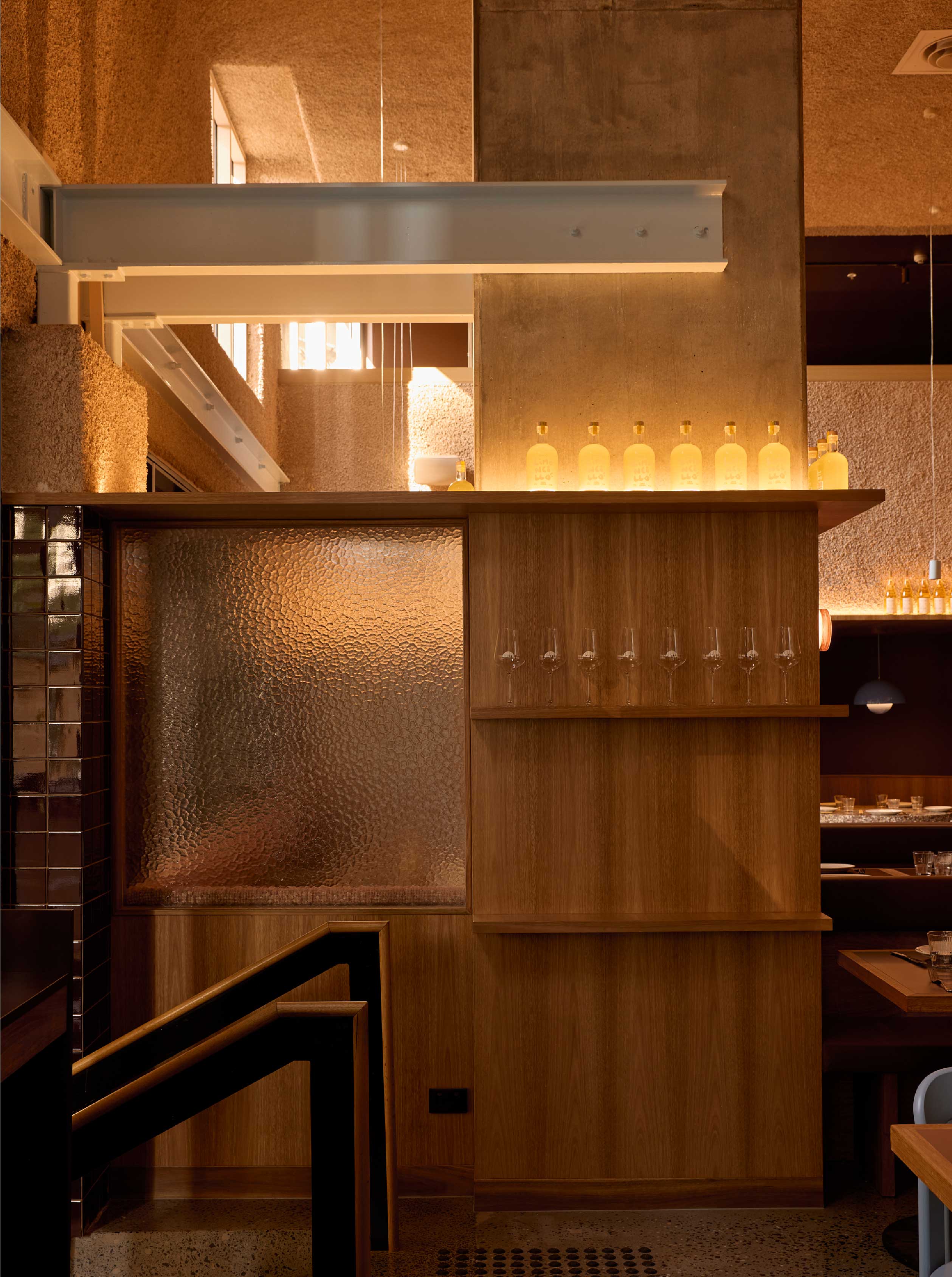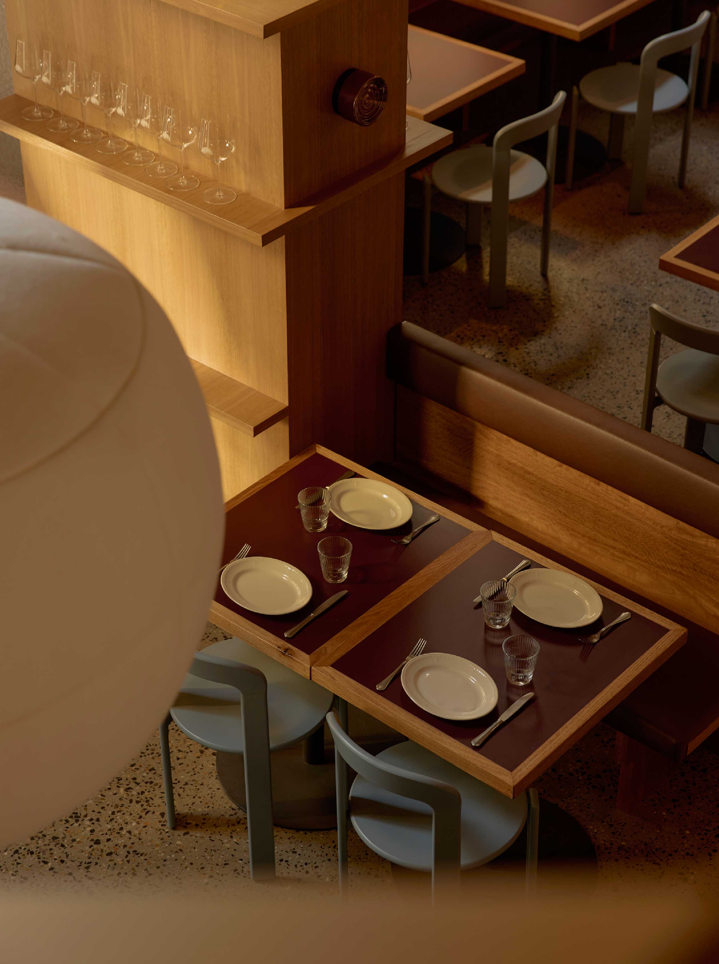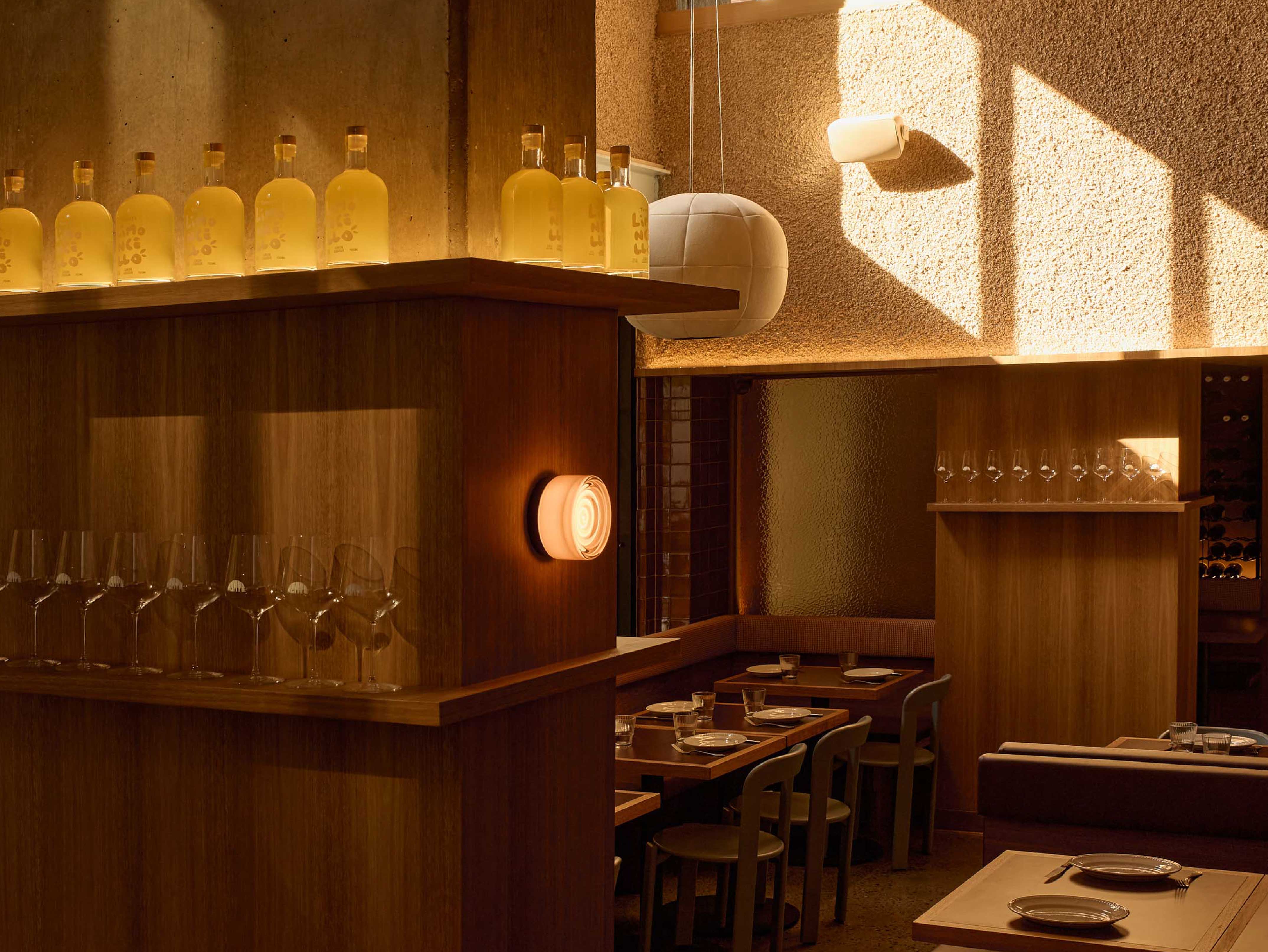 這間可容納百席的 Bar Monte Newstead,設計師 Will Rathgeber 以義大利理性主義為設計主軸,將「結構與秩序」作為空間語言,藉由層次分明的格局安排與光線控制,重現義式餐廳的當代節奏。裸露的混凝土柱體形成清晰骨架,搭配木質與陶磚,空間在冷暖之間取得平衡。中央的幾何長椅貫穿主要動線,柔化結構線條,上方懸掛的羊毛吊燈以柔光覆蓋全室,帶出放鬆節奏。