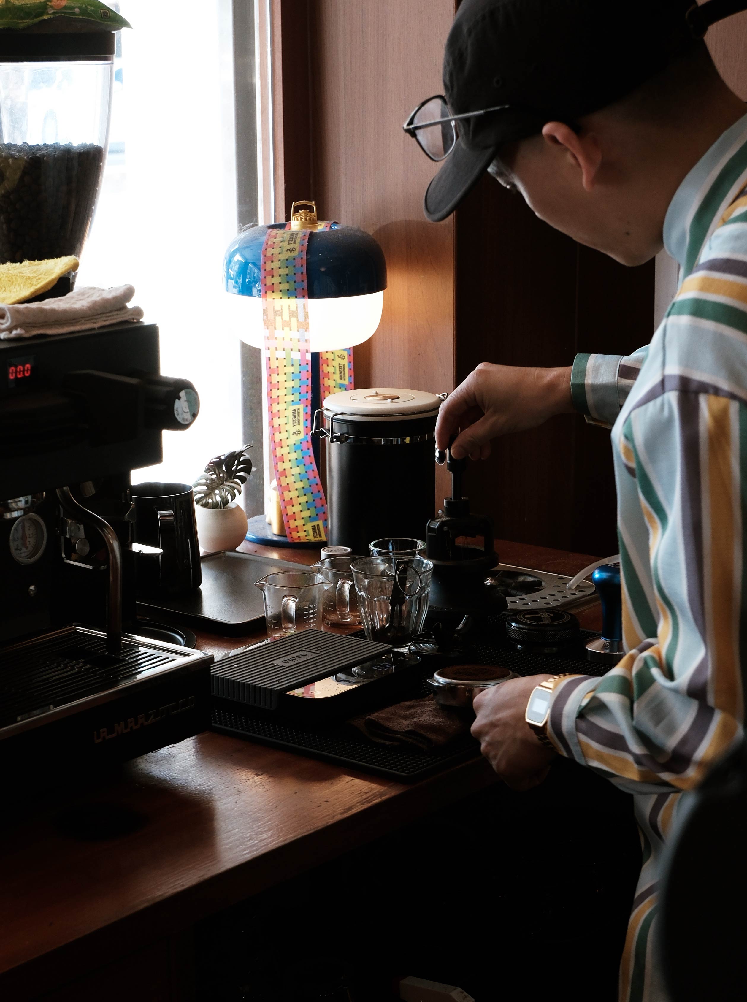 」是一間僅約八坪大小的咖啡店,一進門便能被咖啡的香氣包圍。深色木皮包覆的空間帶著一種靜謐的感受,騎樓下擺放著幾張簡單的桌椅,午後陽光撒落時,是立冬後最舒服的座位。