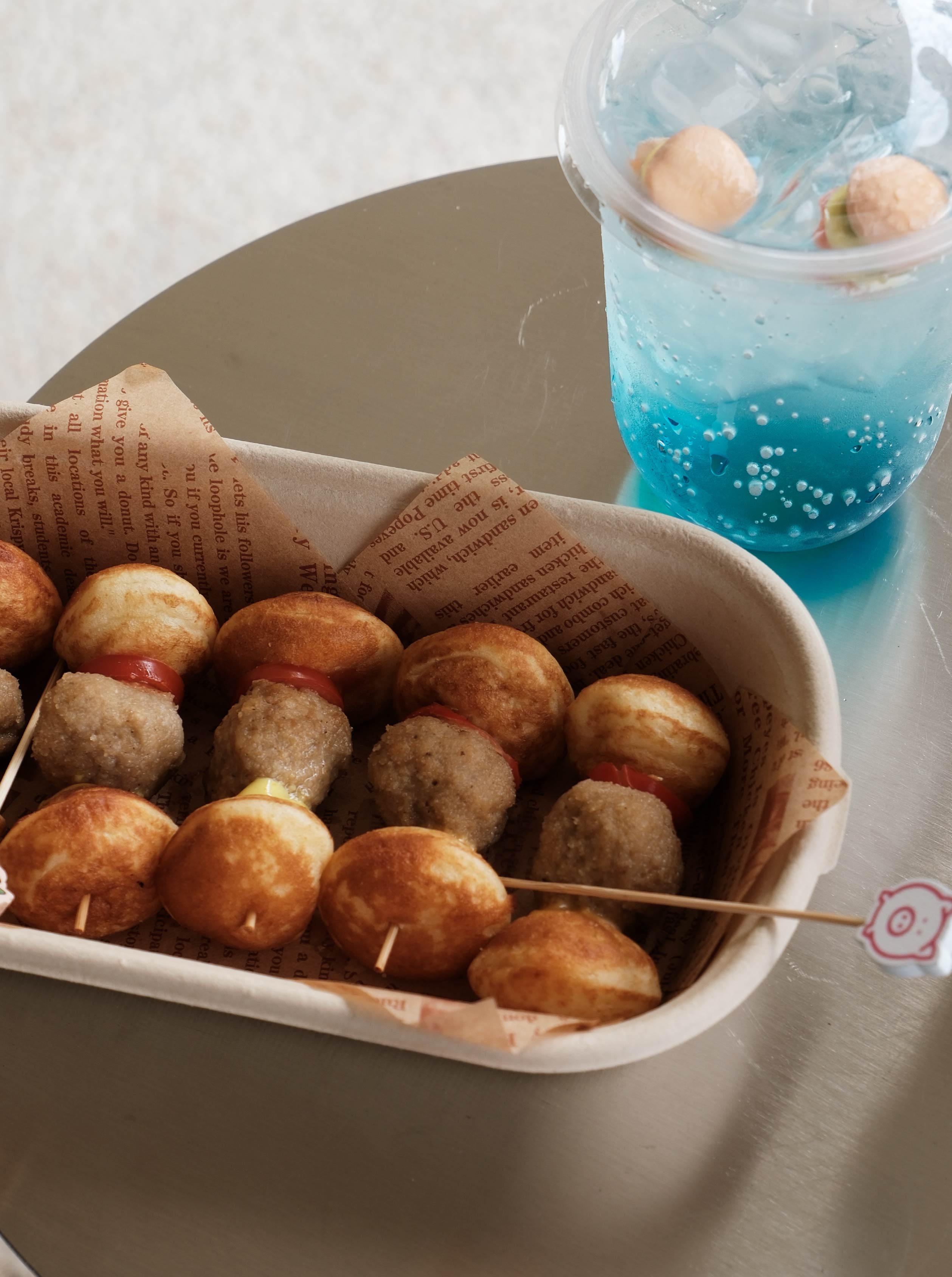 從夜市起家的「待瀾咖啡 DL COFFEE」,主打迷你堡、咖啡與飲品。店內最受歡迎的「肉迷你堡」以自製的荷蘭小鬆餅串上手打豬肉丸,鬆餅口感鬆軟帶著淡淡奶香,夾著彈牙多汁的豬肉丸,鹹香味在口中恰到好處地散開。迷你的尺寸一口剛剛好,不用狼吞虎嚥,也能優雅的享受一份漢堡的滿足感。