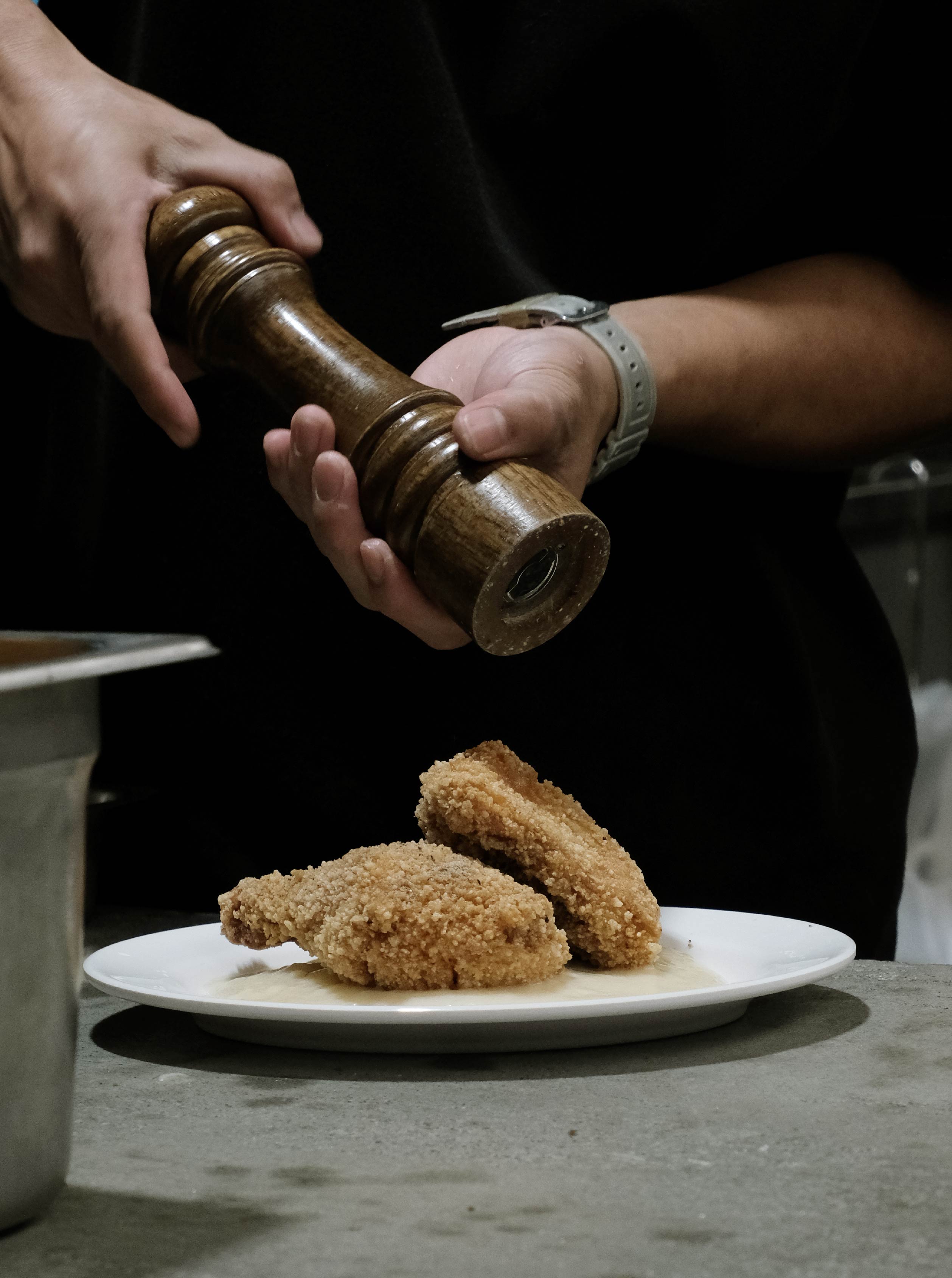 油鍋裡的聲音此起彼落,香氣立即在空氣中散開。老闆熟練地夾起雞塊,確認金黃色的炸衣是否剛好酥脆,再俐落地瀝油、裝盤。他的每一步動作都帶著對味道的細心拿捏。