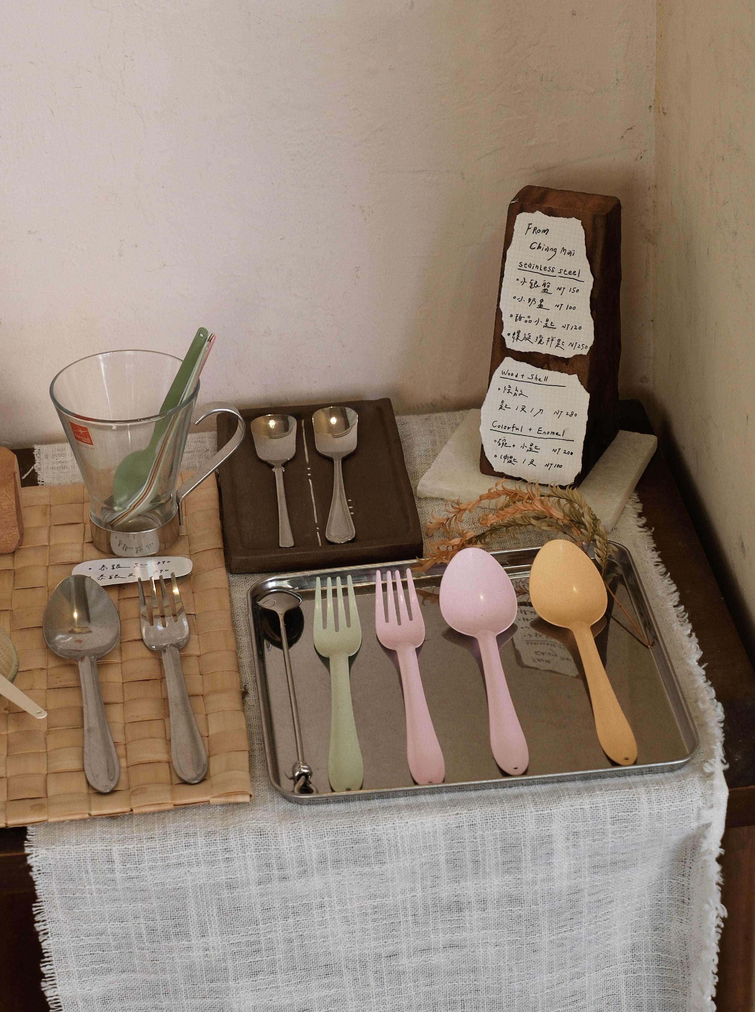 深色木皮構成店內主要色彩,從吧台、桌面到座椅,都以樸實的木質紋理延伸出安定的氛圍。店裡還藏著一小區選物角落,擺放著他們親自挑選的器皿與周邊小物,低調卻能看見用心。那裡不只是展示品,更像是老闆日常生活的延伸——讓人能在咖啡香氣之外,感受到她對「生活感」的詮釋。
