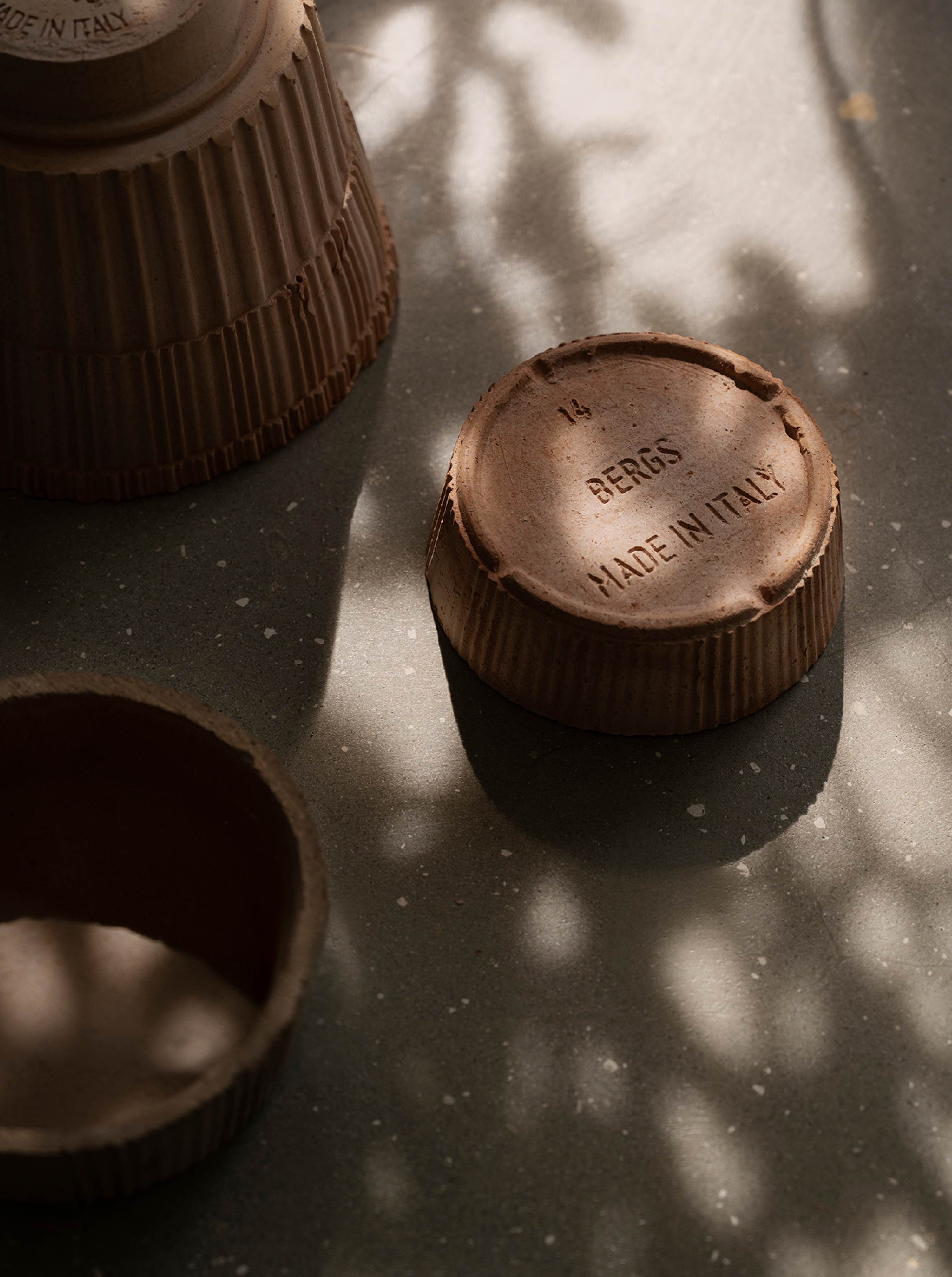 千年以來,金色小麥與橄欖樹下的肥沃土壤,是義大利古老赤陶工藝的根基。Bergs Potter 的工坊內,世代傳承工藝的匠人們各司其職。製作陶盆的過程複雜,需具熟練經驗與靈活雙手。依據不同器型與尺寸,選擇全手工拉坯或石膏壓模的專業技法。細心修整外觀後,整齊羅列在棚架上,等待風乾靜置,高溫漫燒成堅固耐用的美麗陶盆。底部托盤經特殊處理,同時具備防水與防黴功能。若有燒製失敗的破損陶片,蒐集並與再次與水、黏土融合,確保每一份資源都被善待,實現 Bergs Potter 尊重與熱愛自然的理念。