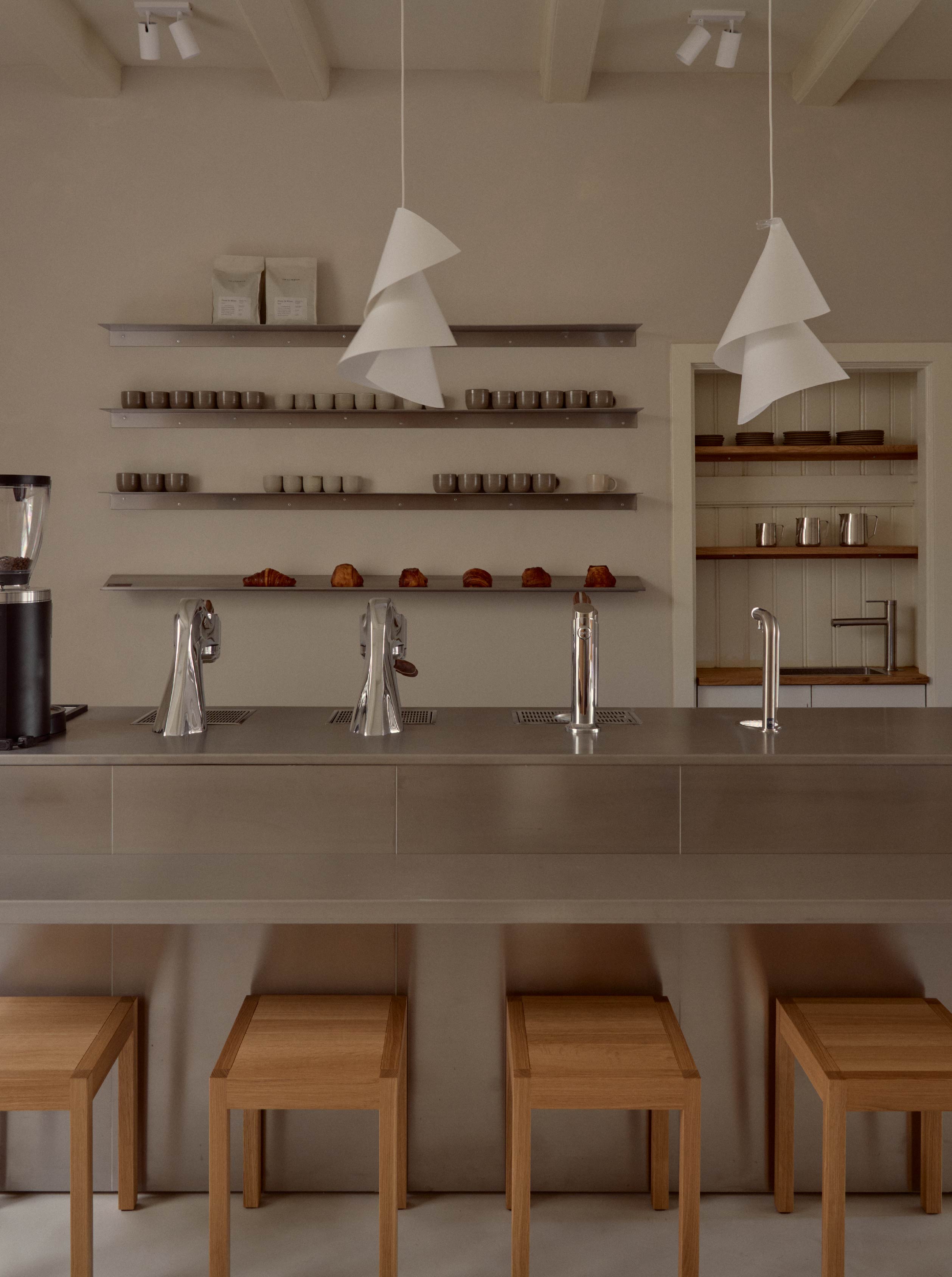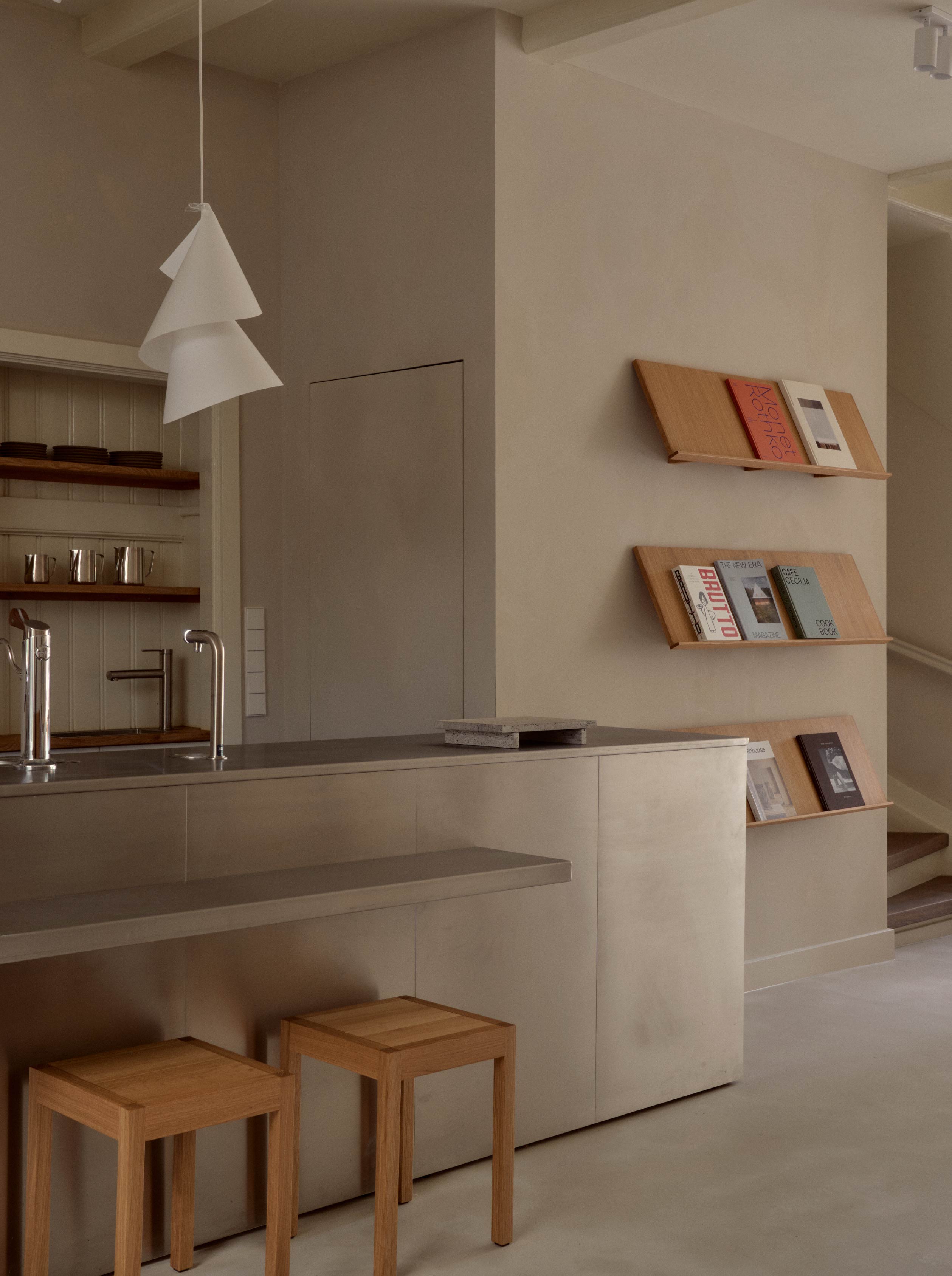 在空間配置上,一樓面向運河開口、又同時與庭院相連的區域被作為咖啡館與設計選品店舖使用,使街道、室內與院子自然串聯,並藉由較