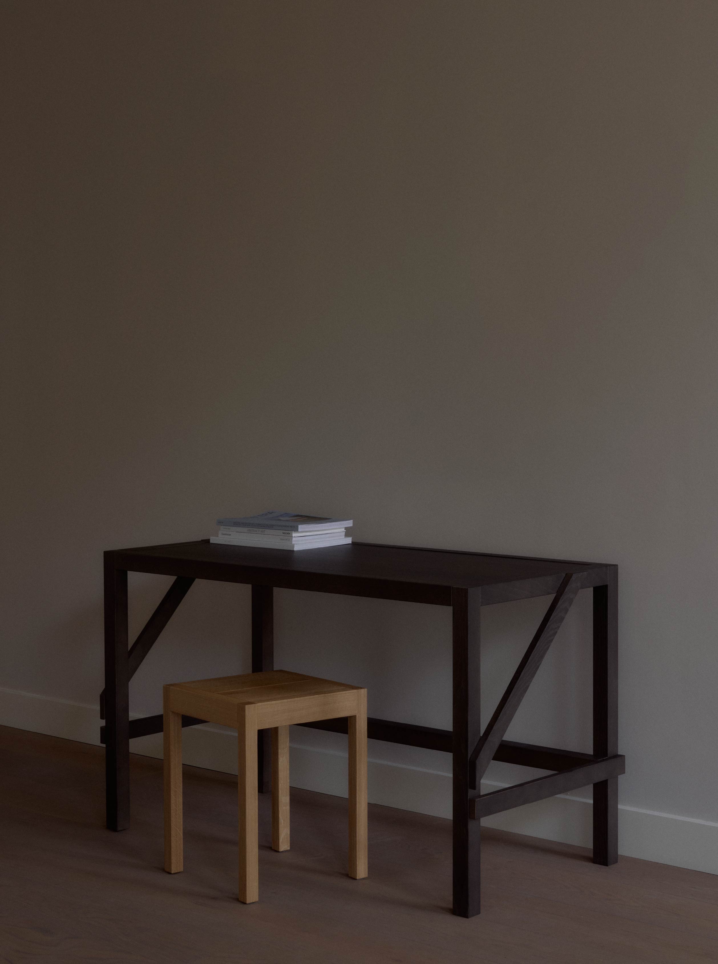 如果說空間配置讓老建築重新獲得秩序,那麼家具與材質則是為Two Story注入了觀看的節奏與場景深度。這裡的所有家具幾乎都是量身打造,從咖啡吧台、展示櫃,到畫廊長椅與書桌皆屬一致語彙,