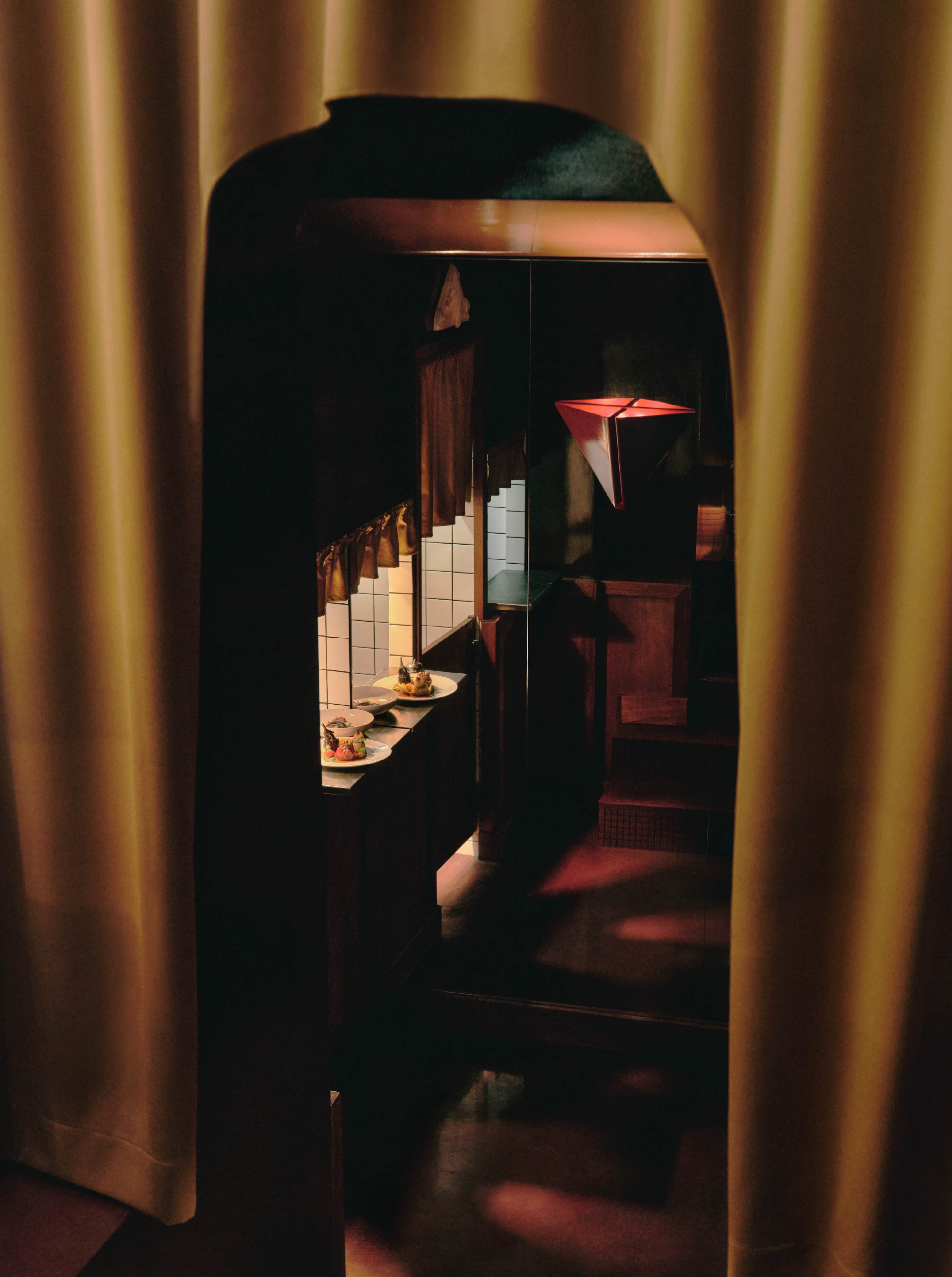 整體配置從臨街的戶外露台開始,率先迎接短暫停留的顧客,用餐區承接正式的晚餐時段,餐後則移坐到吧台小酌,形成一條隨著時序轉換重心的動線。