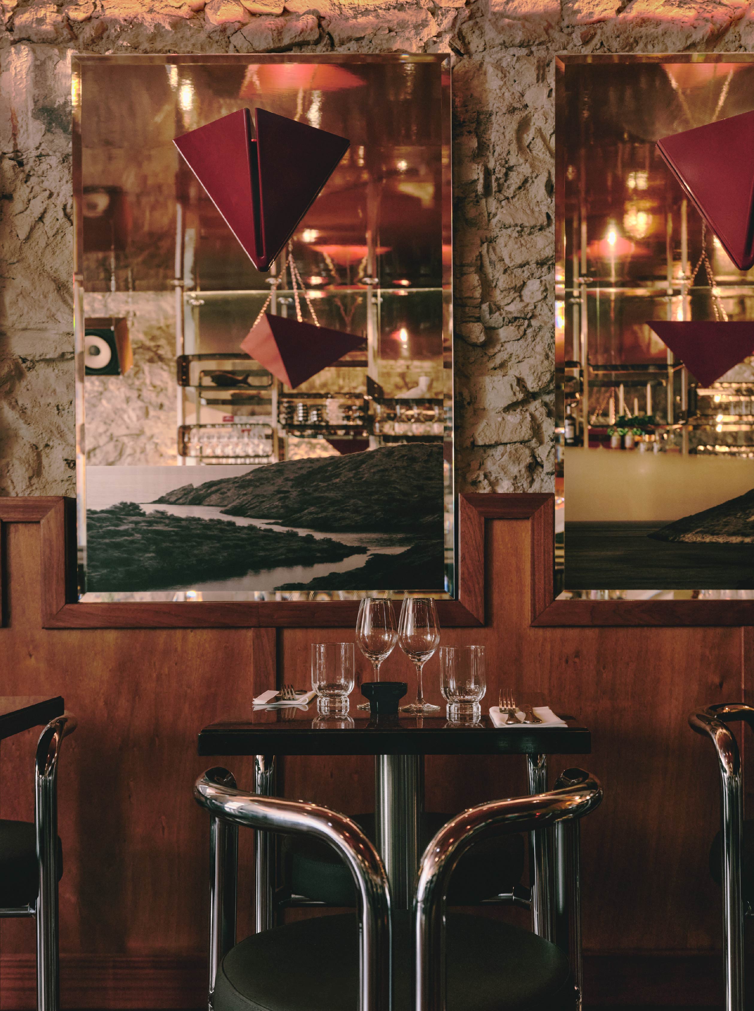延續70年代的調性,燈具、餐椅採用大膽的幾何造型,立體的三角壁燈嵌在鏡面,反射出雙倍的溫潤光源。