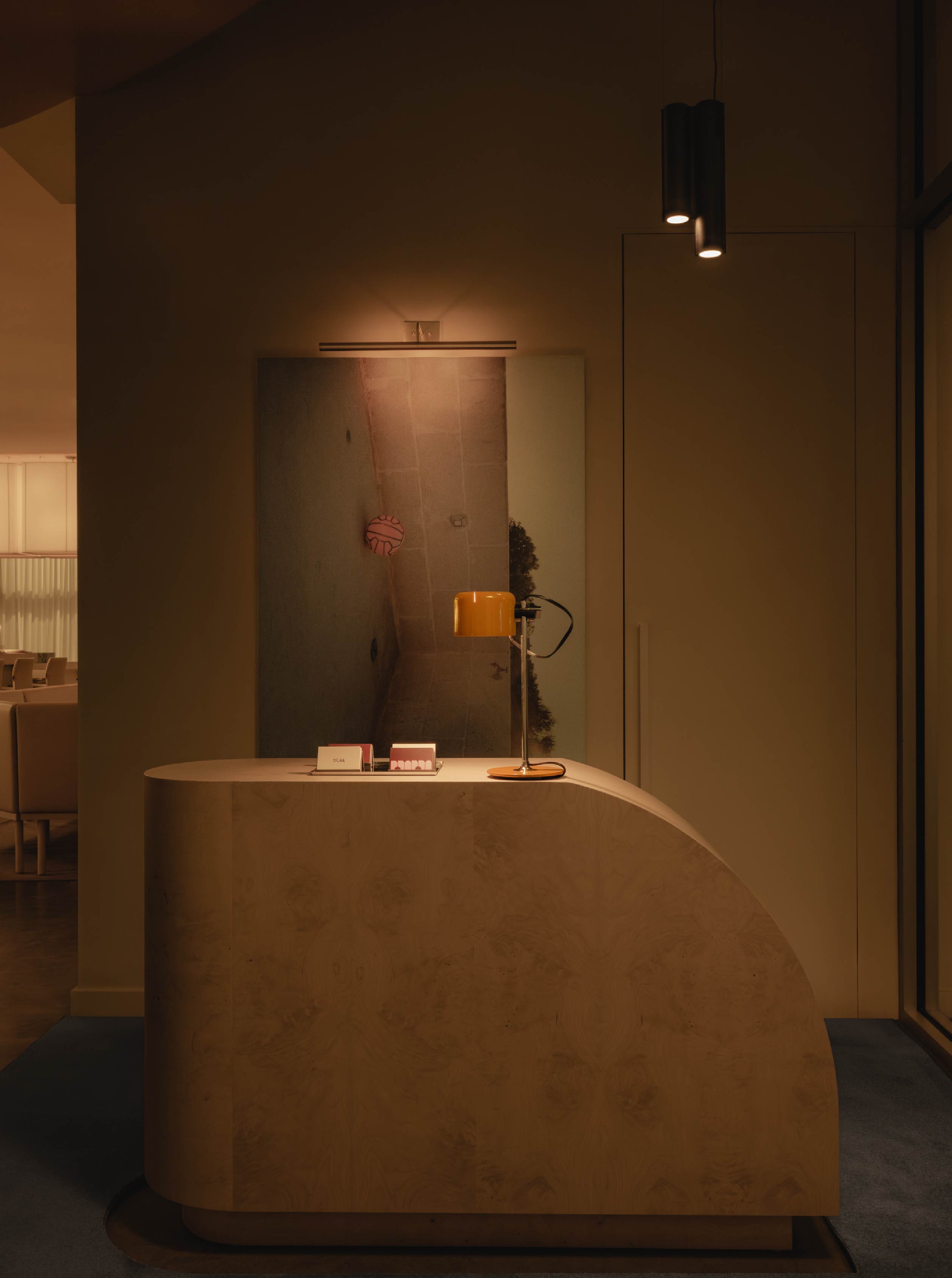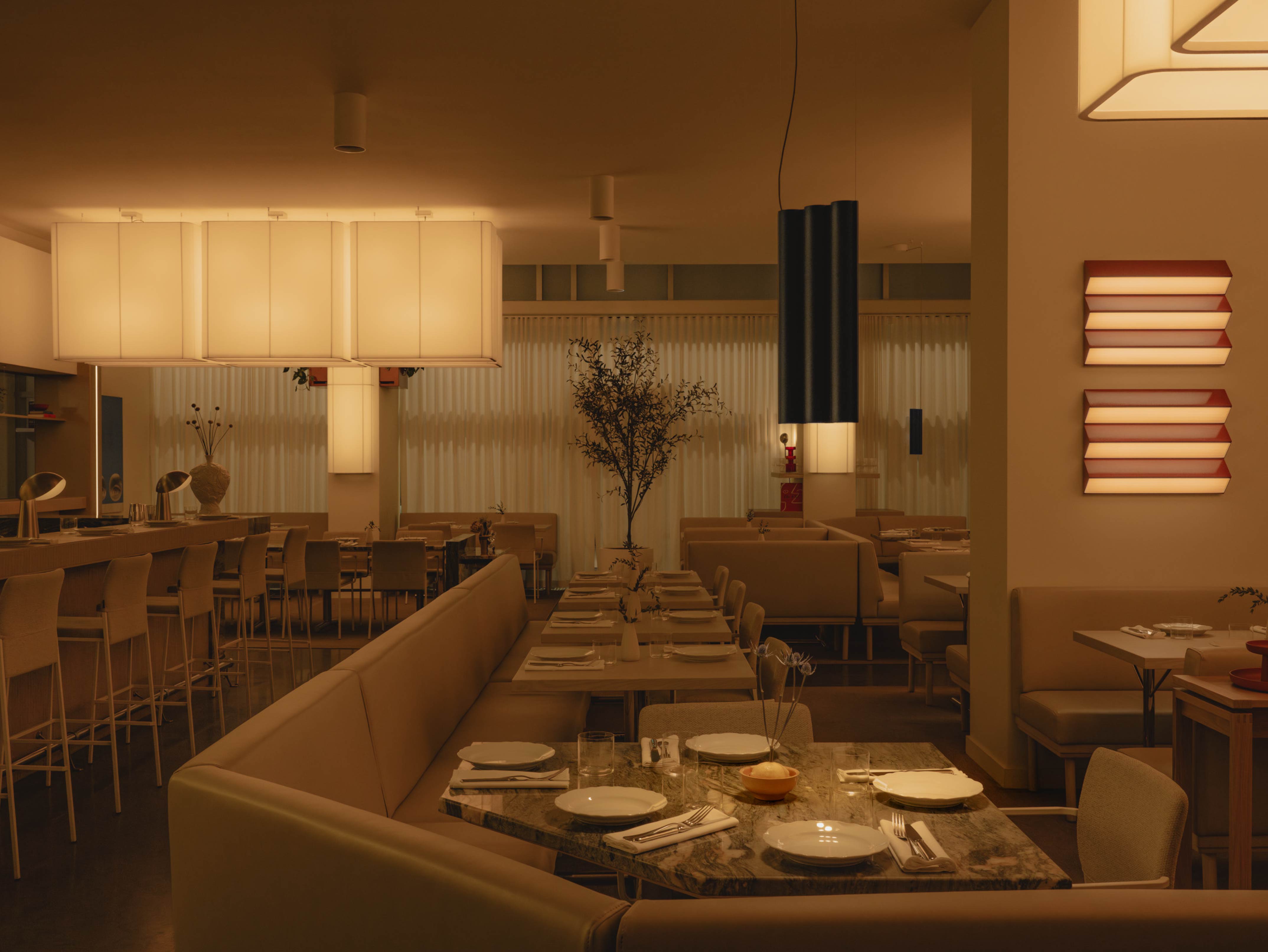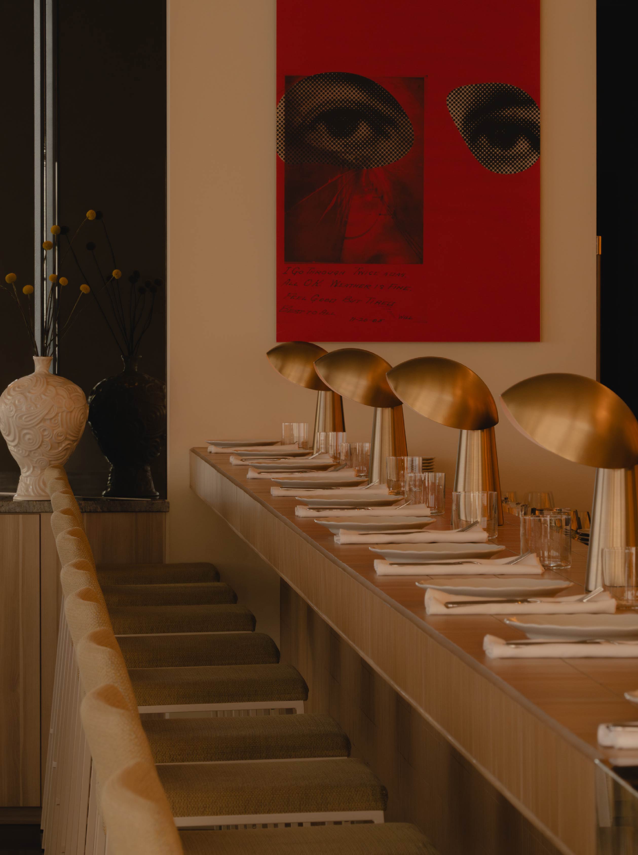 首先是懸掛在主要用餐區域上方的大型訂製亞麻吊燈,像是一層柔軟的光幕,穩定整體環境光。白天透過薄紗窗簾引入自然光,夜晚,燈光轉為奶油色調的人造光源,均勻灑落在桌面與拋光材質表面,自然調節日夜氛圍。其次,用餐區中也穿插使用以手工燈飾聞名的Lambert et Fils品牌藍色吊燈,冷色調在暖色背景中形成對比,增添層次與節奏。轉換至吧台區域,延續雕塑語彙的黃銅燈具在暖光映照下展現細緻質感,既提供足夠照度,也成為視覺焦點之一。最後,牆面適度點綴的普普藝術作品,為理性的餐飲空間注入些許趣味與當代感,讓Olia在實用機能下,仍保有輕鬆且富有個性的設計表情。