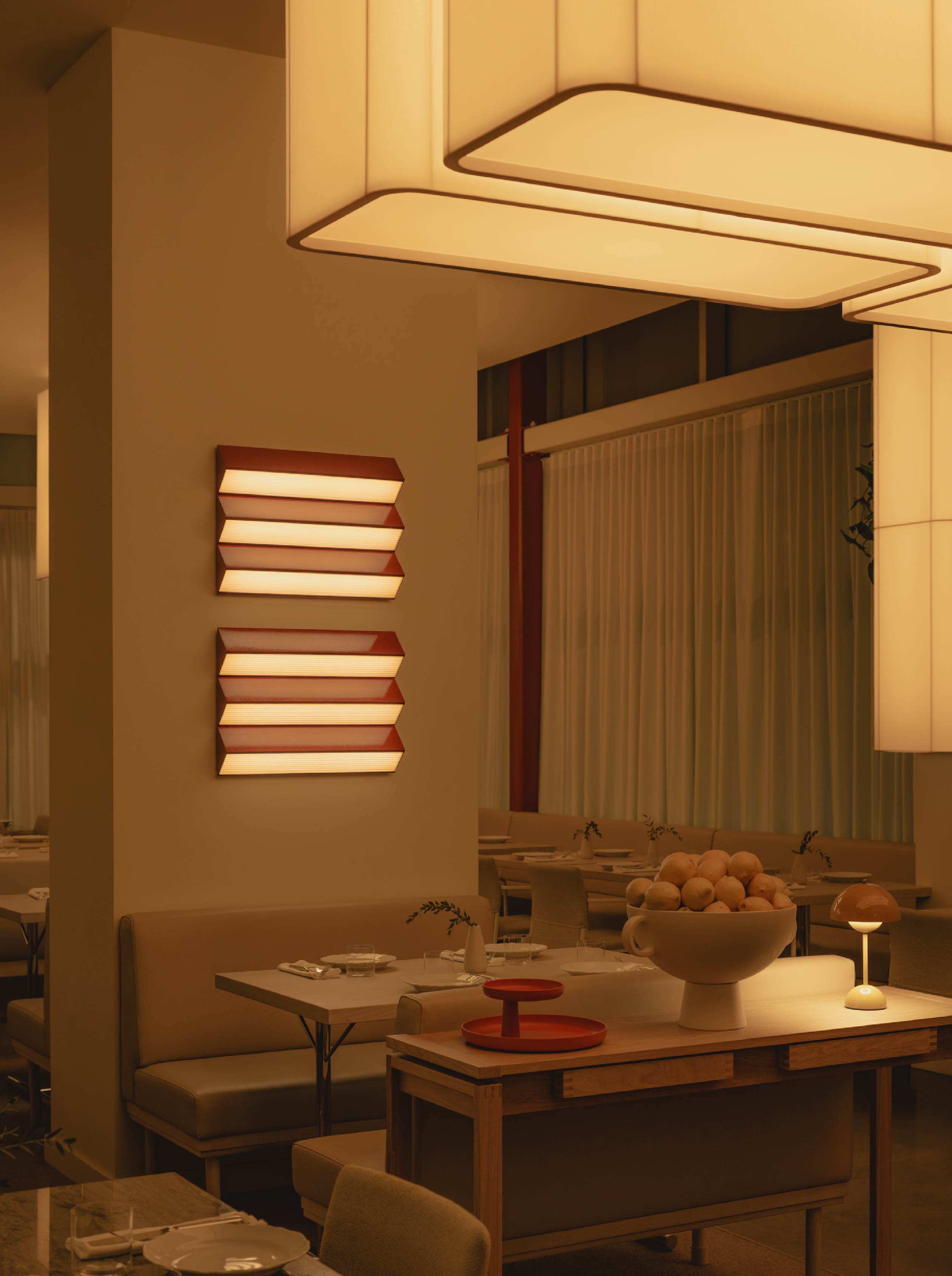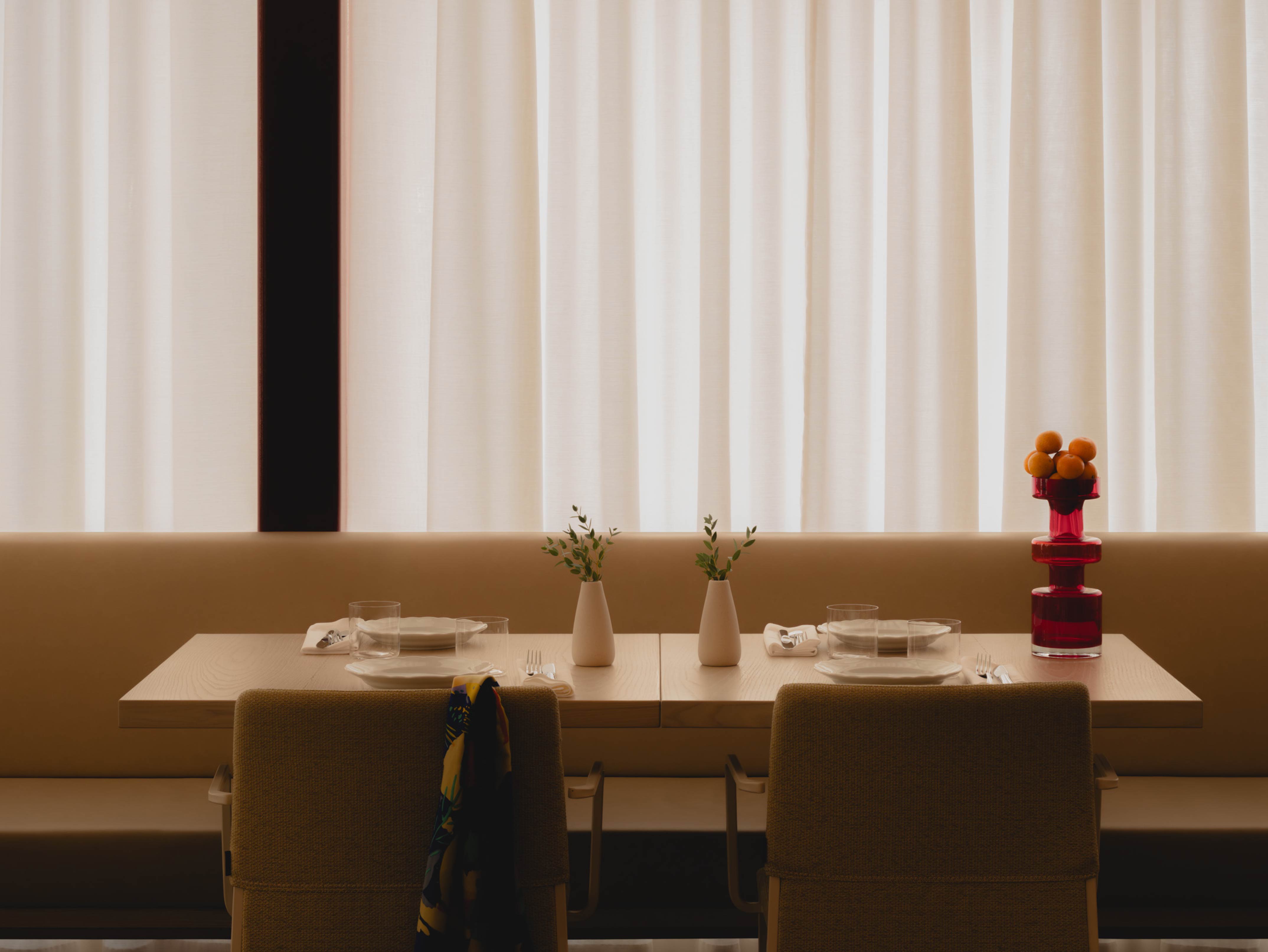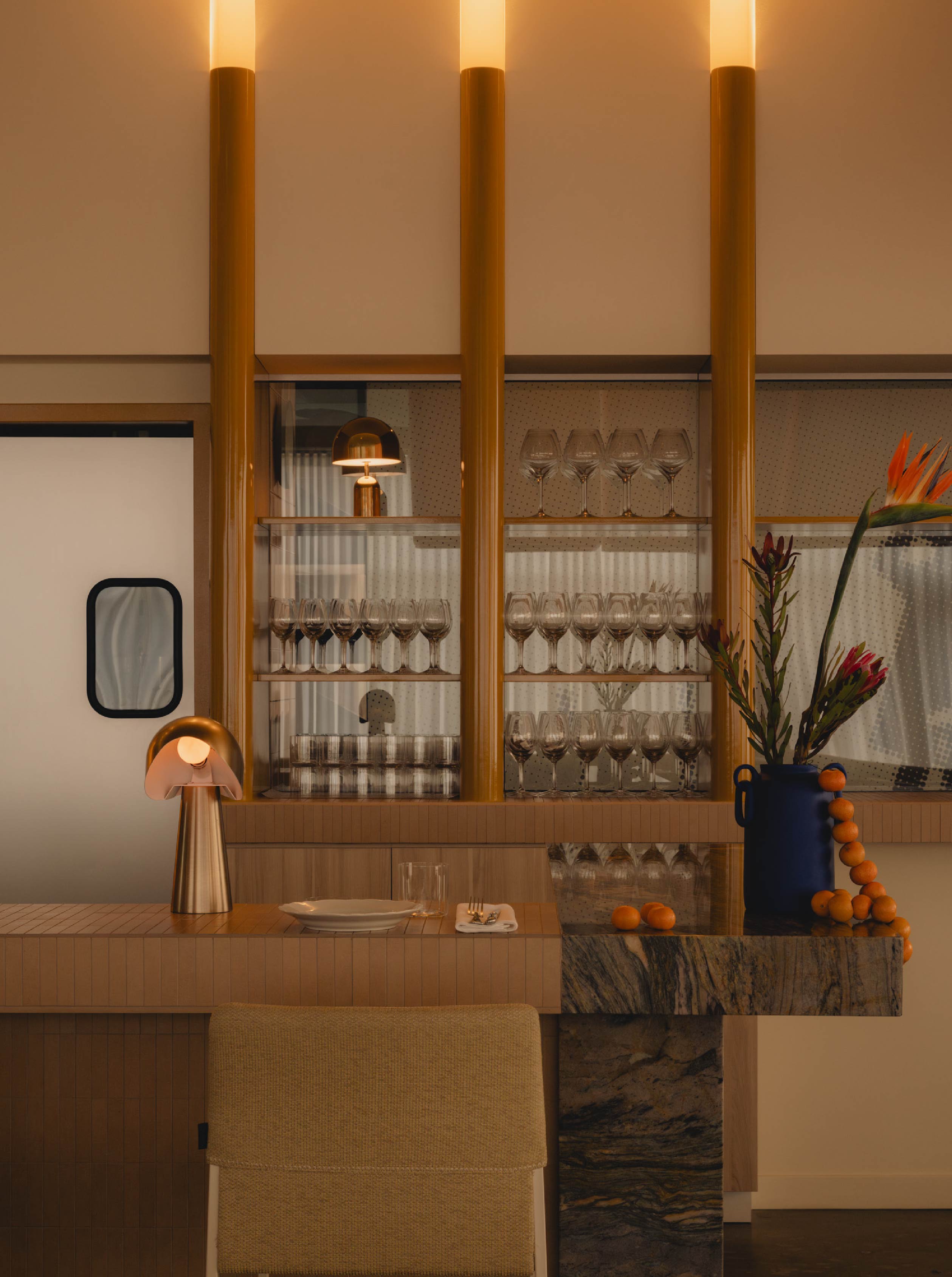 首先是懸掛在主要用餐區域上方的大型訂製亞麻吊燈,像是一層柔軟的光幕,穩定整體環境光。白天透過薄紗窗簾引入自然光,夜晚,燈光轉為奶油色調的人造光源,均勻灑落在桌面與拋光材質表面,自然調節日夜氛圍。其次,用餐區中也穿插使用以手工燈飾聞名的Lambert et Fils品牌藍色吊燈,冷色調在暖色背景中形成對比,增添層次與節奏。轉換至吧台區域,延續雕塑語彙的黃銅燈具在暖光映照下展現細緻質感,既提供足夠照度,也成為視覺焦點之一。最後,牆面適度點綴的普普藝術作品,為理性的餐飲空間注入些許趣味與當代感,讓Olia在實用機能下,仍保有輕鬆且富有個性的設計表情。