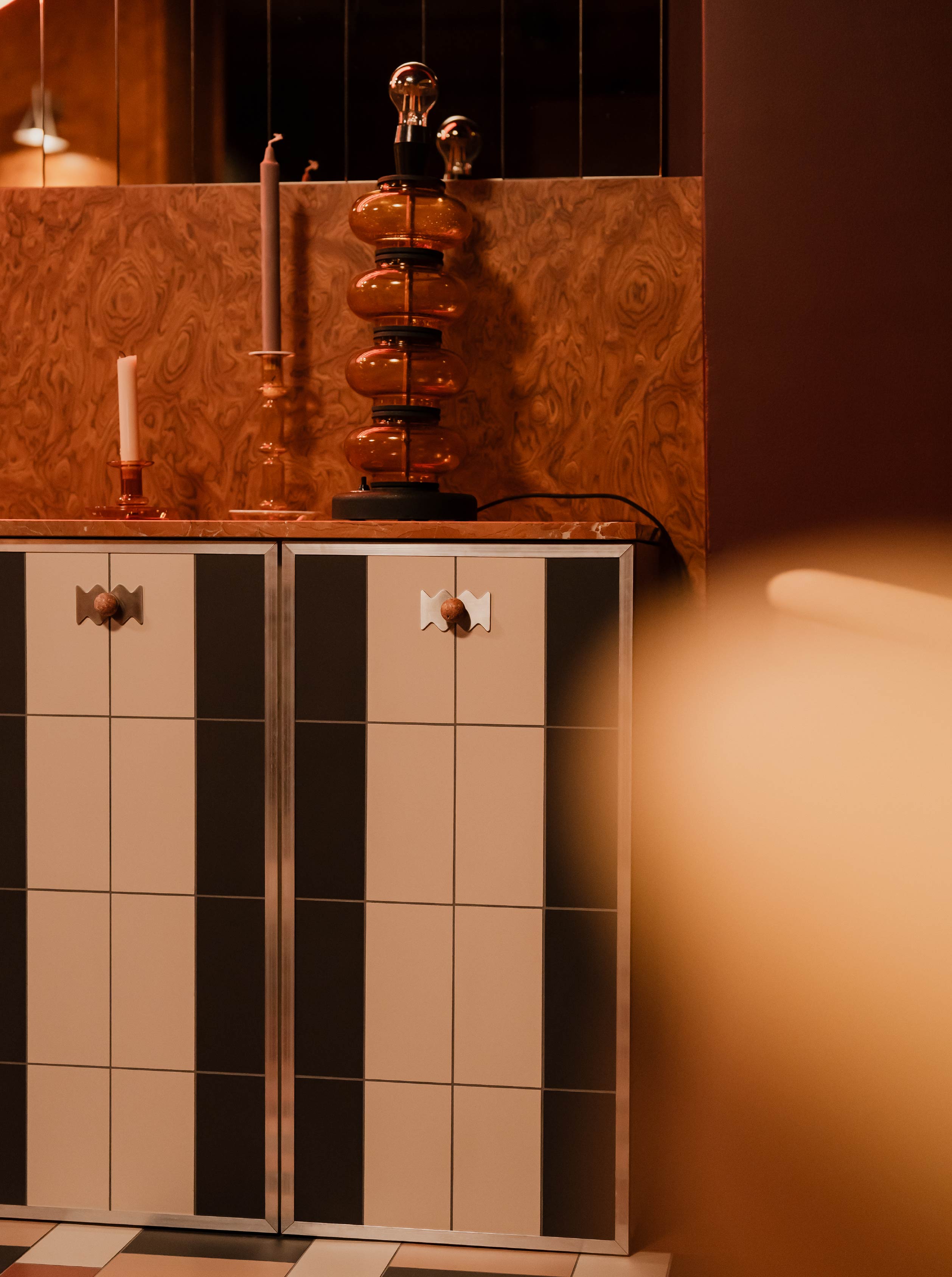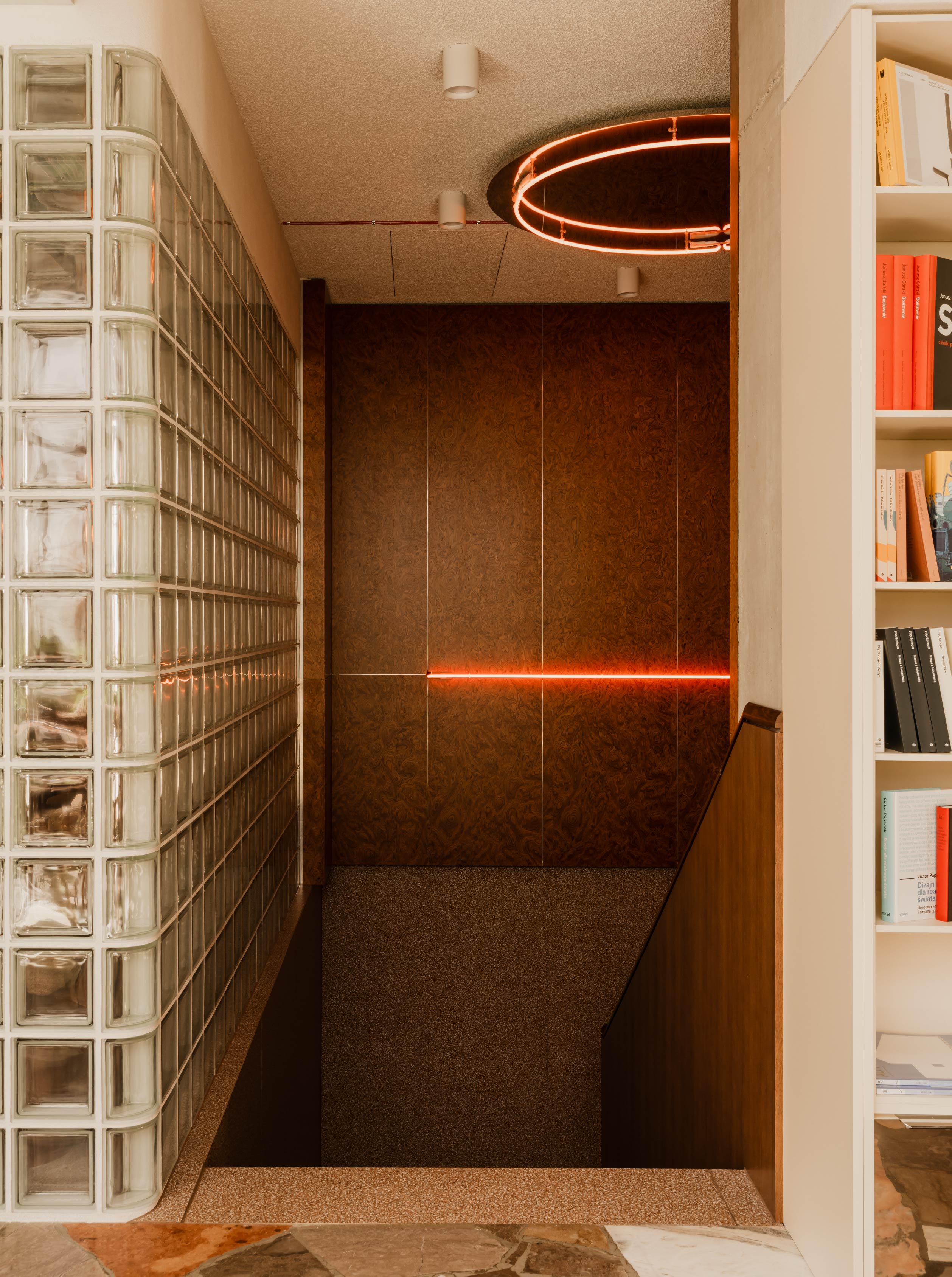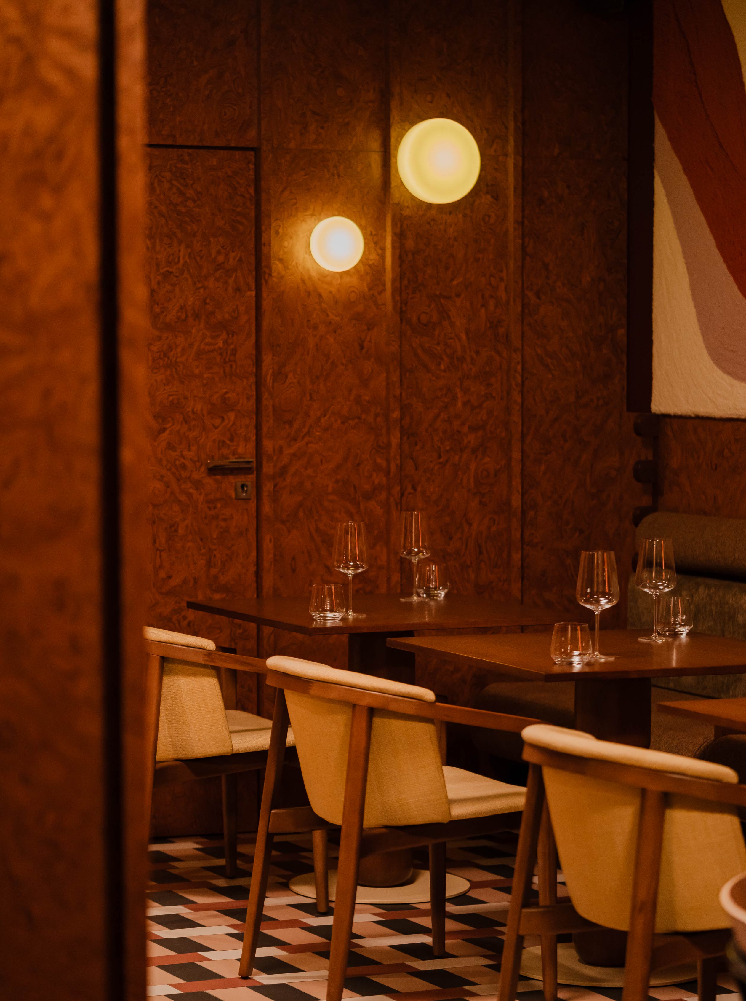 牆面鋪設Czeczot木皮,喚起復古壁櫃的集體記憶;橡木拼木地板嵌入馬賽克,連續的幾何圖形帶有迪斯可的象徵。最引人矚目的則是中央的拋光不鏽鋼牆面,點綴圓形的霓虹燈光,在酒紅色調的包覆下,營造迷幻奢華的氛圍。