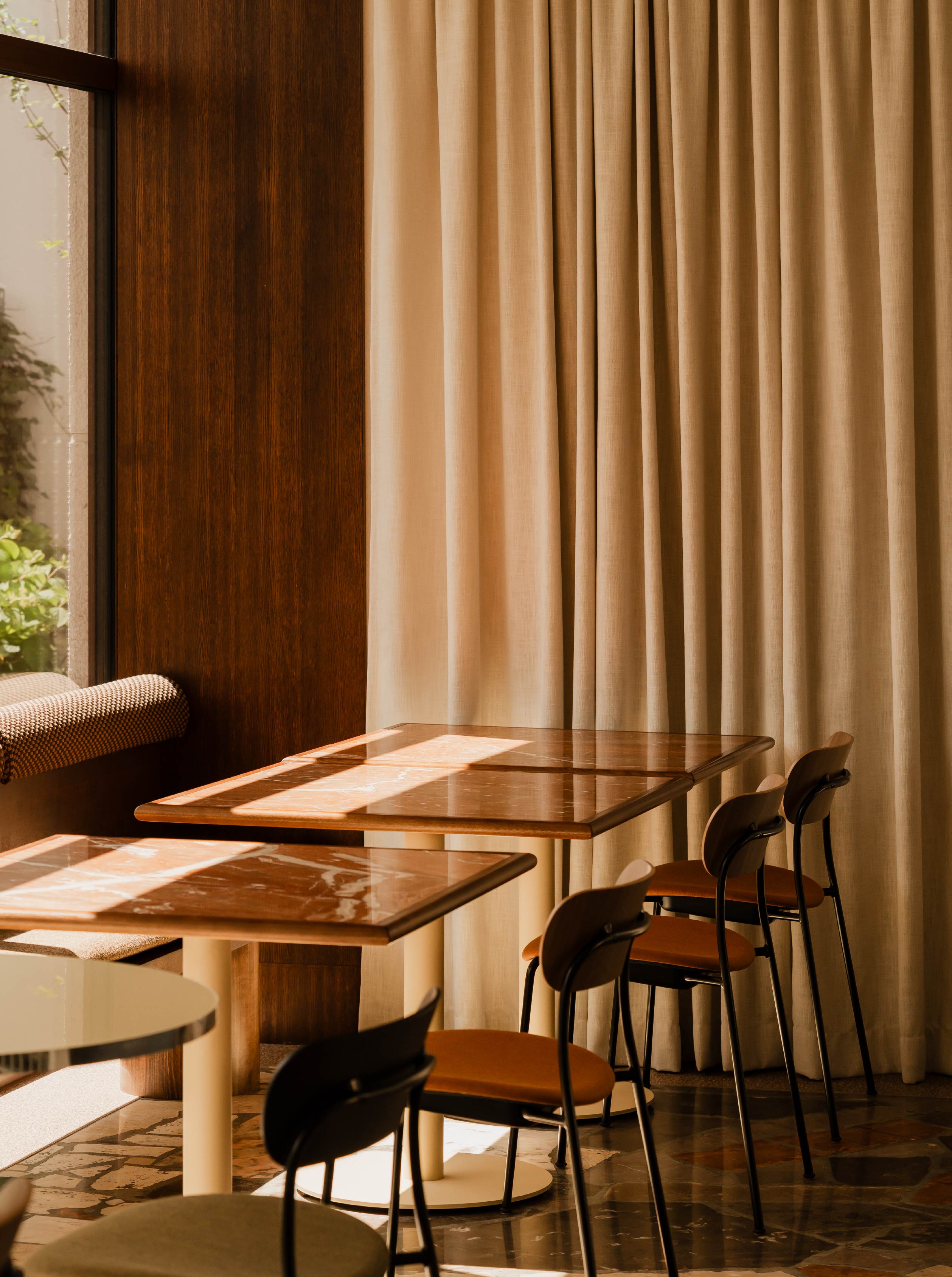在整體配置上,以柔和的綠色、黃色、橘色與棕色為基調,並選用Rojo Alicante西班牙紅色大理石作為餐桌,搭配亮面的黃色玻璃,形成大膽鮮明的視覺效果,也呼應70年代的建築背景。