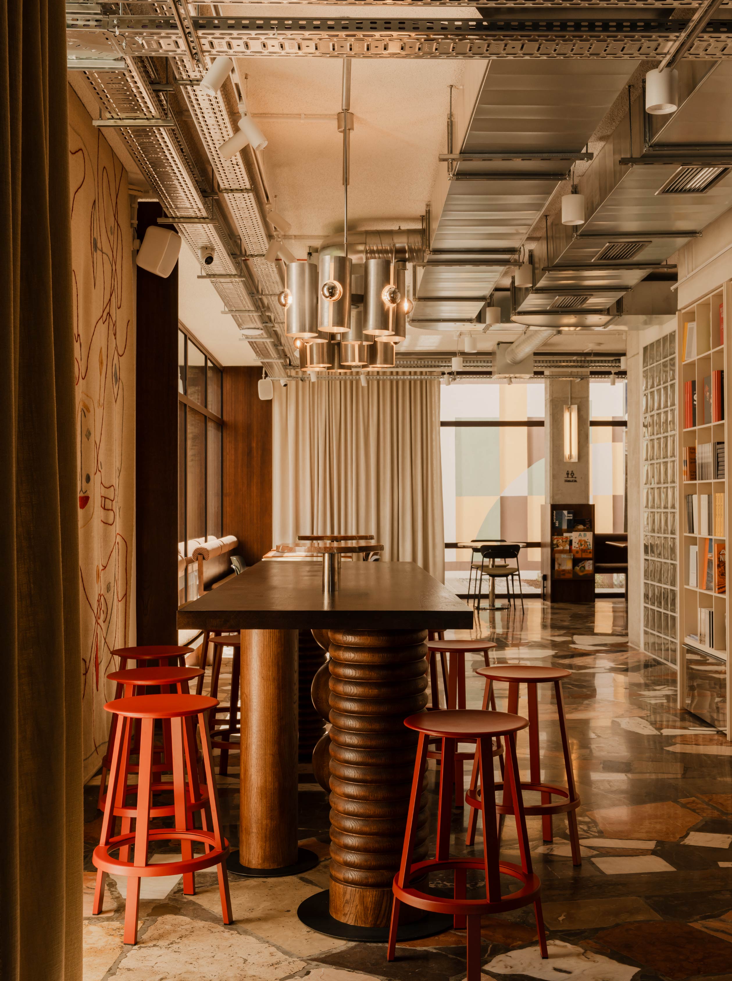 中央採用共用長桌,搭配車木桌腳,厚實的螺紋線條與連續圓球造型流露復古的精工質感,紅色吧台椅增添活潑氣息;天花則搭配當時年代的原版UFO燈具作為視覺焦點,巧妙回應過往的文化記憶。