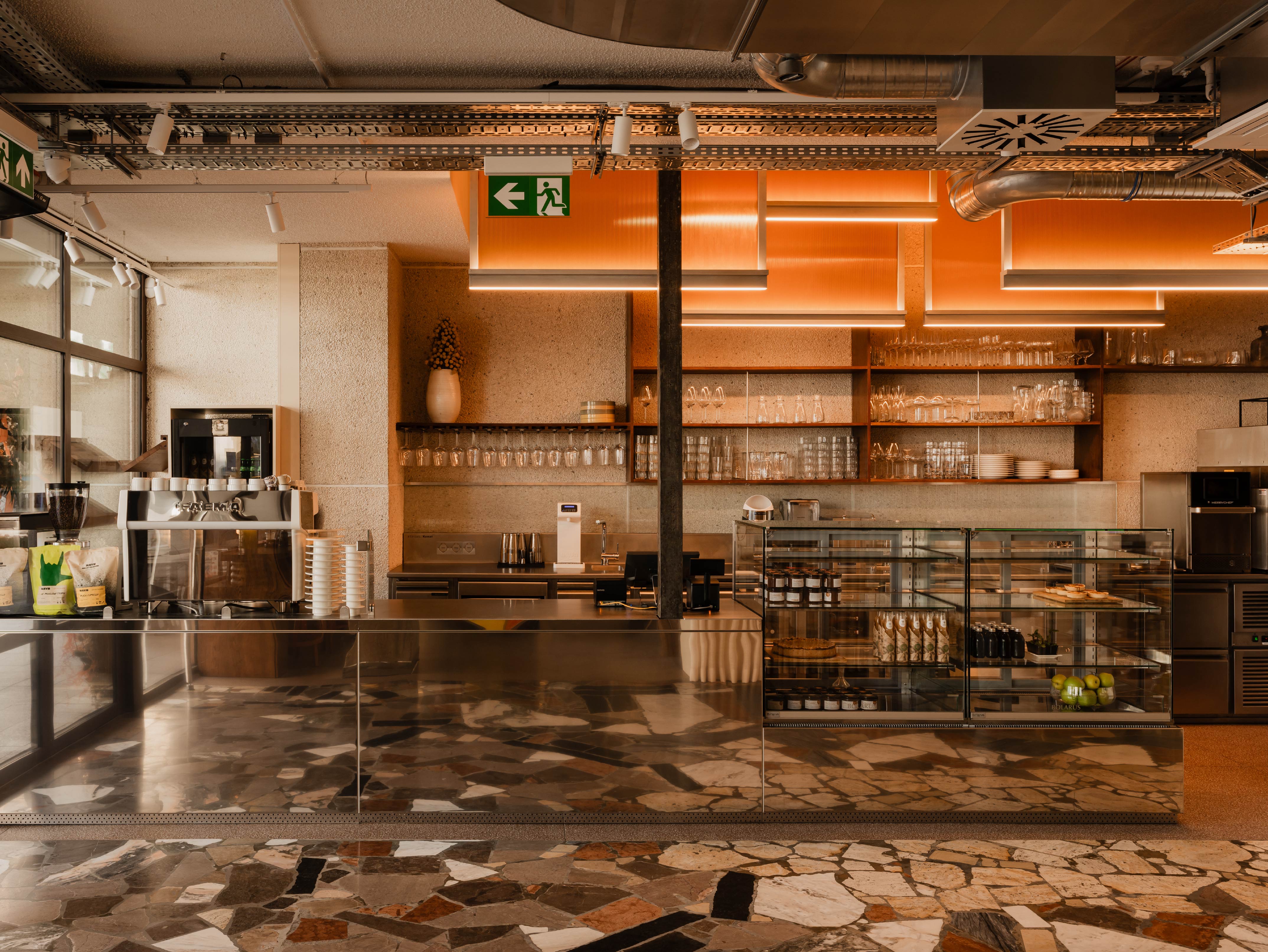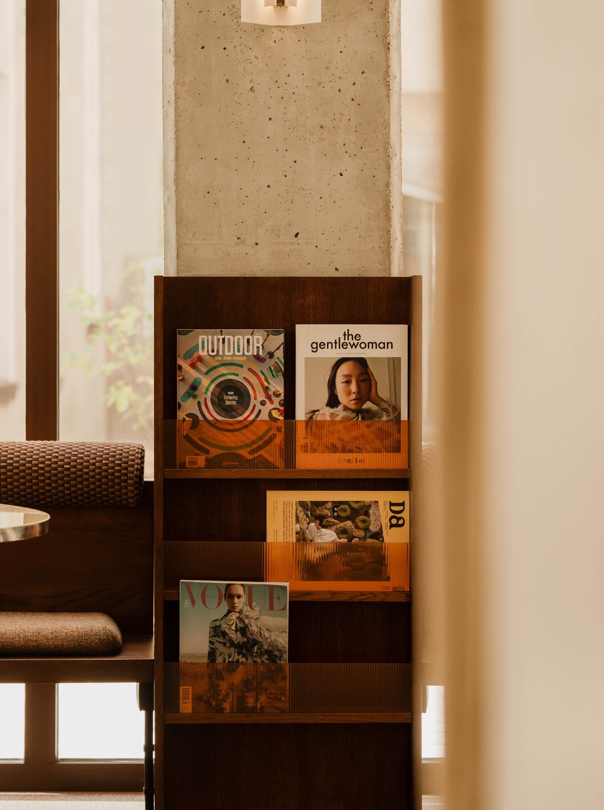 Strona餐廳所在的一樓,過去即是Dom Książki與城市最緊密的連結。負責操刀設計OYKA Studio設計工作室順應既有的建築結構與使用記憶,從街道望入,裸露的混凝土樑柱和波蘭大理石地板被完整保留,重現舊時歷史風華。