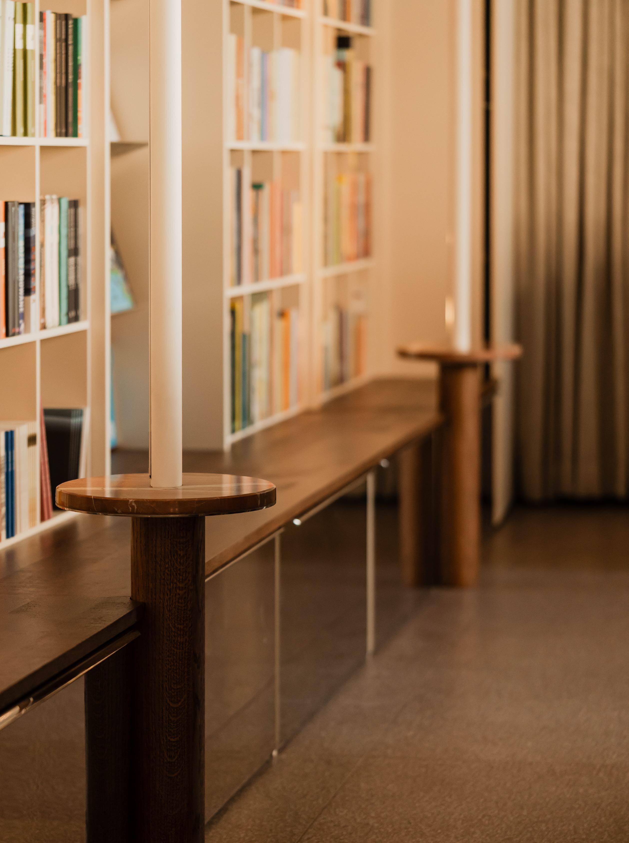 而空間一角嵌入開放書櫃,輔以矮櫃當作座位,漆成白色的金屬管線從牆面彎折向下,不僅形塑小型置物台,也呼應工業元素。同時沿窗設置木質吧台,臨街的優勢能吸引來往行人的目光。桌面復古的蘑菇造型燈具暈染氛圍,注入悠閒放鬆的步調,在此隨意翻閱,享受閱讀、社交與餐飲的多重機能。