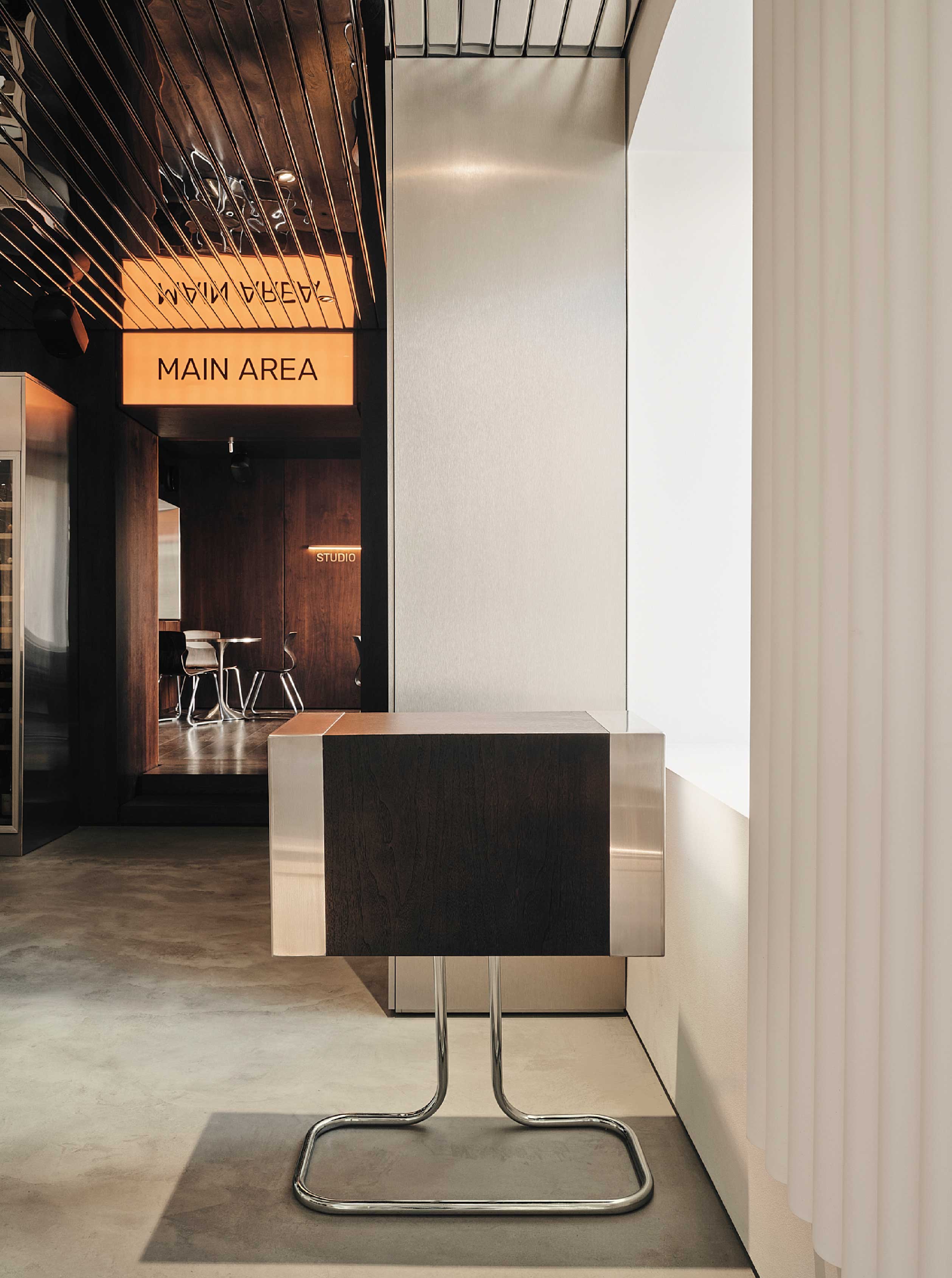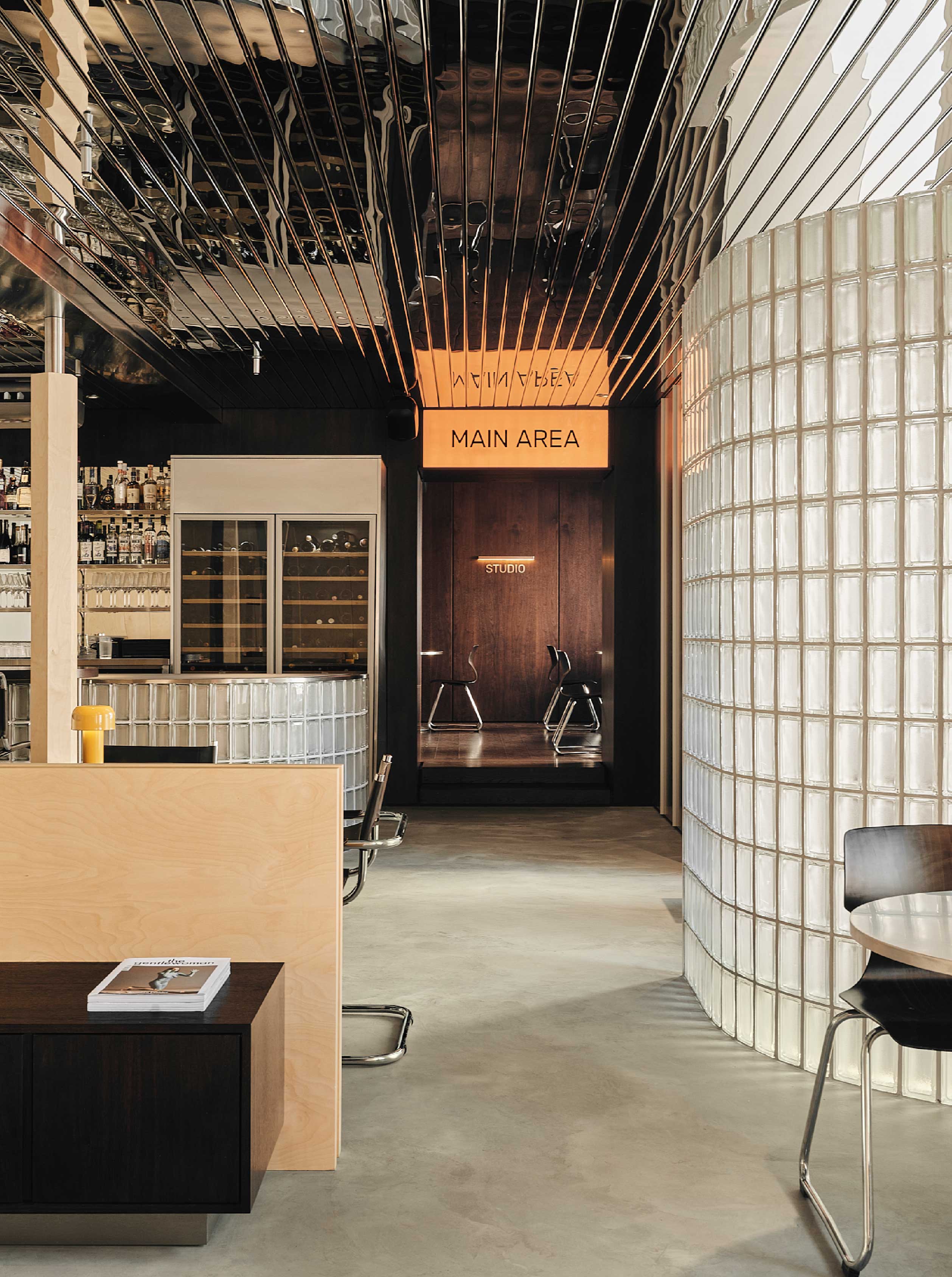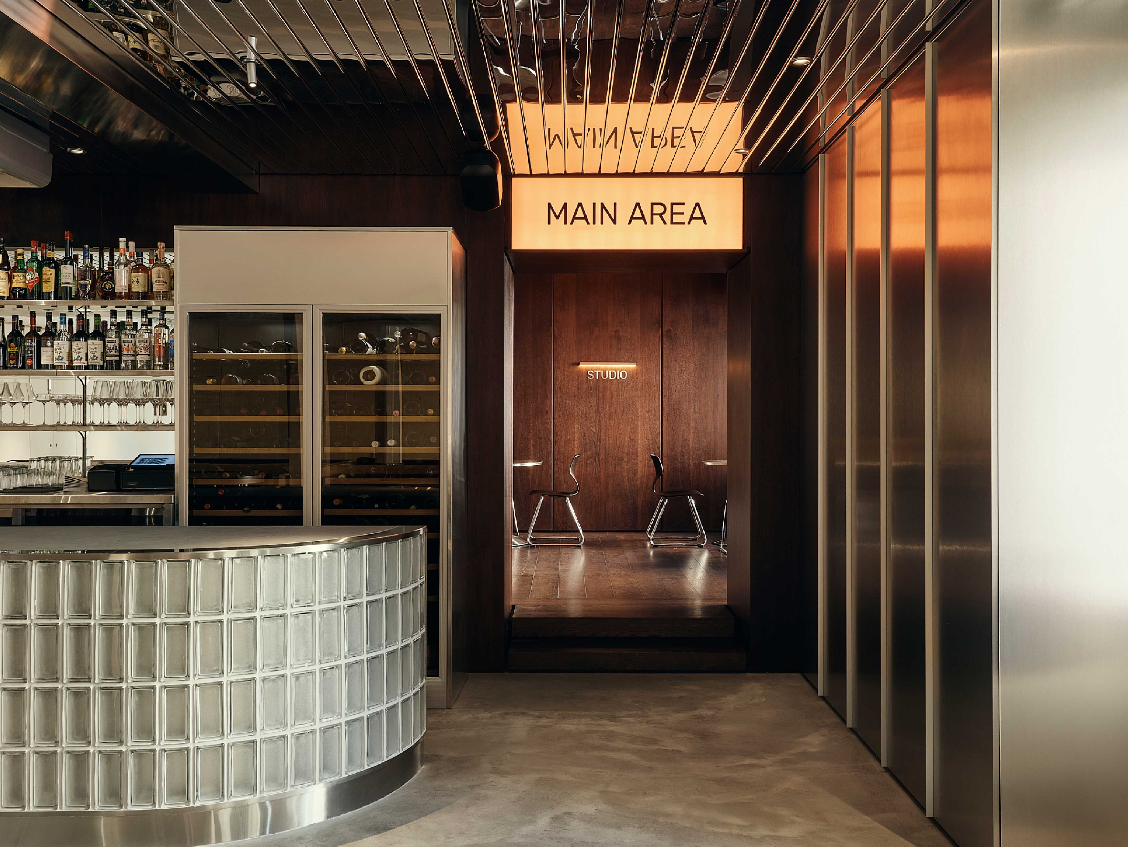 空間亦引入世紀中現代主義的語彙,主廳吧台延續玻璃磚元素的通透感,搭配不鏽鋼餐椅刻畫俐落細緻的現代感,入門的接待櫃臺則汲取Gale GS401A 喇叭的復古造型,整體在極簡與懷舊之間取得平衡。
