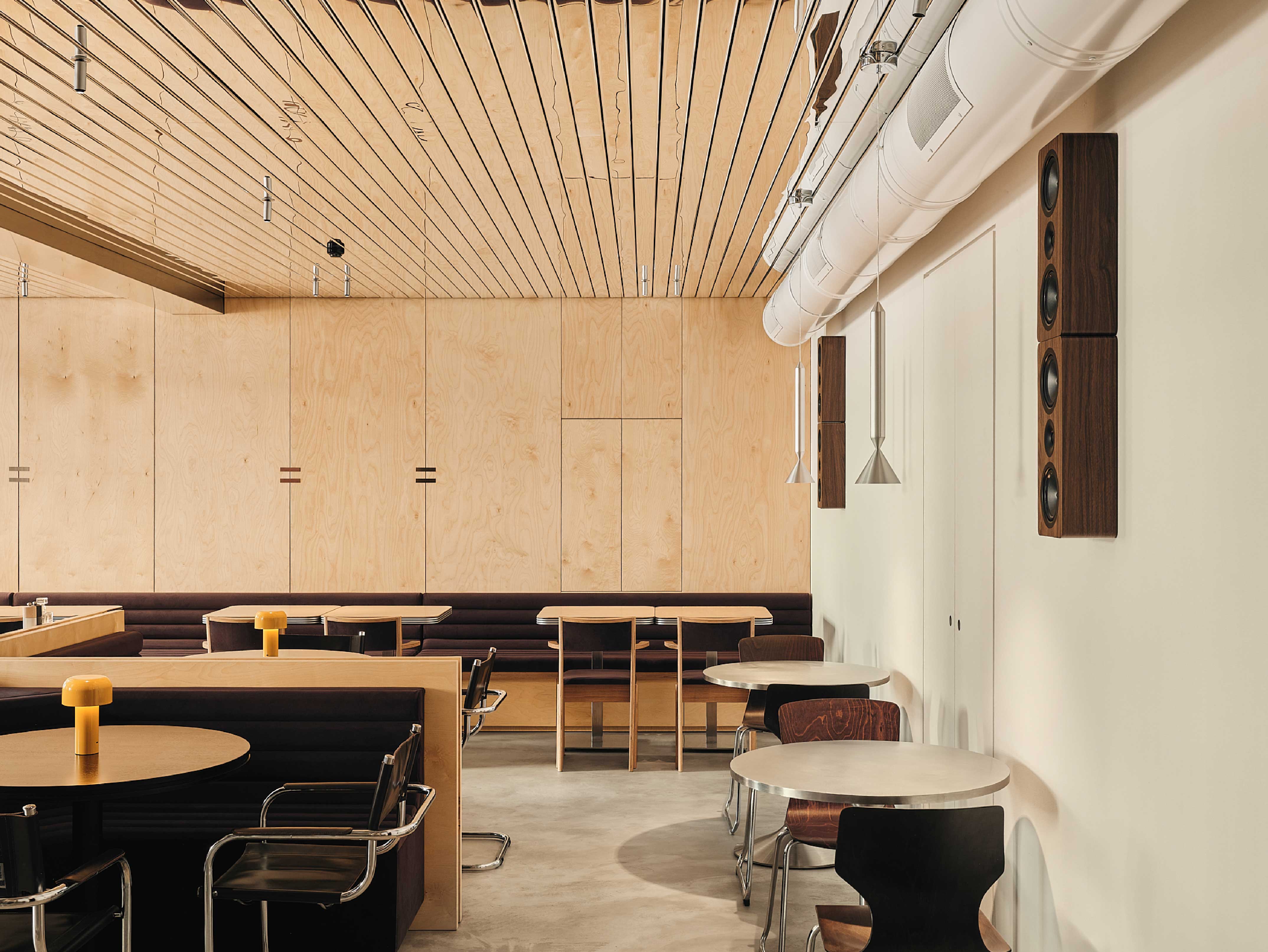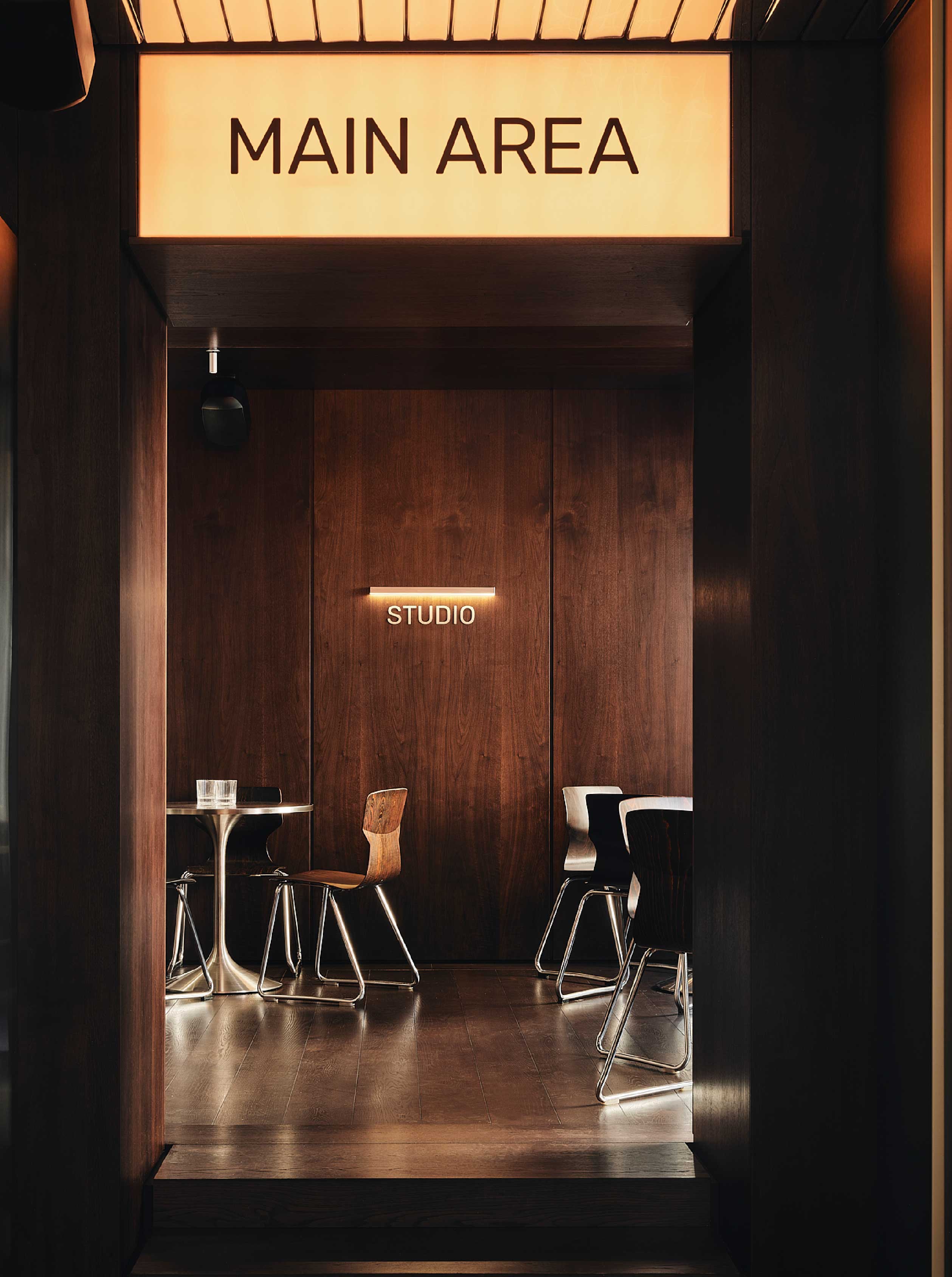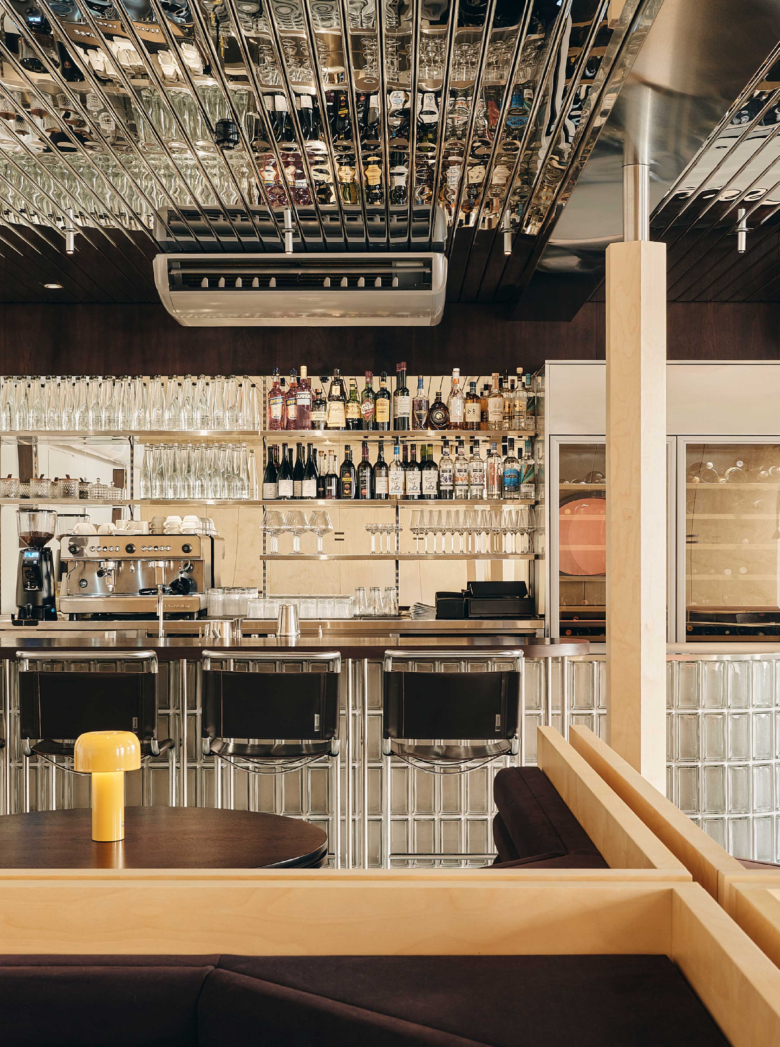 空間亦引入世紀中現代主義的語彙,主廳吧台延續玻璃磚元素的通透感,搭配不鏽鋼餐椅刻畫俐落細緻的現代感,入門的接待櫃臺則汲取Gale GS401A 喇叭的復古造型,整體在極簡與懷舊之間取得平衡。