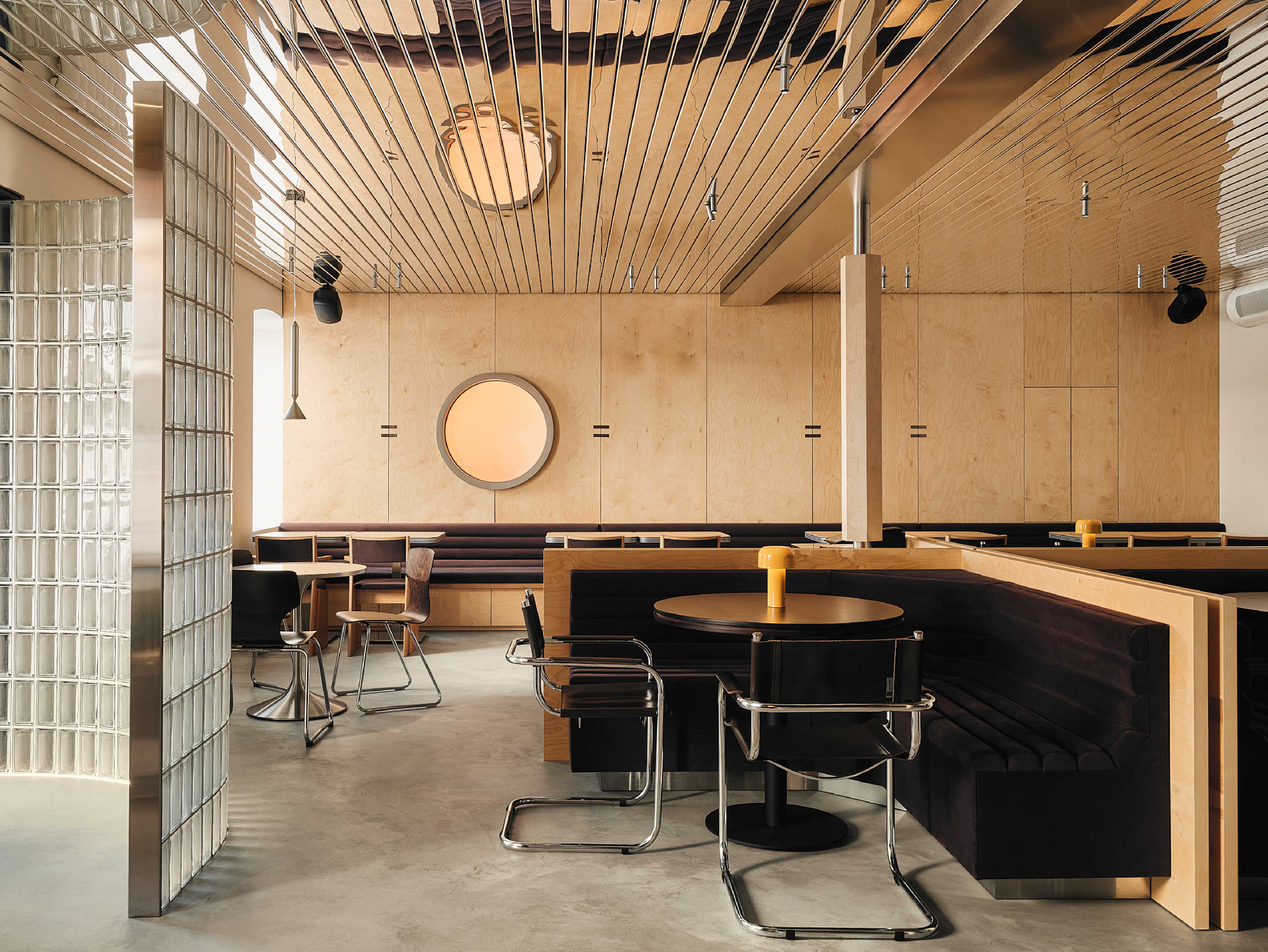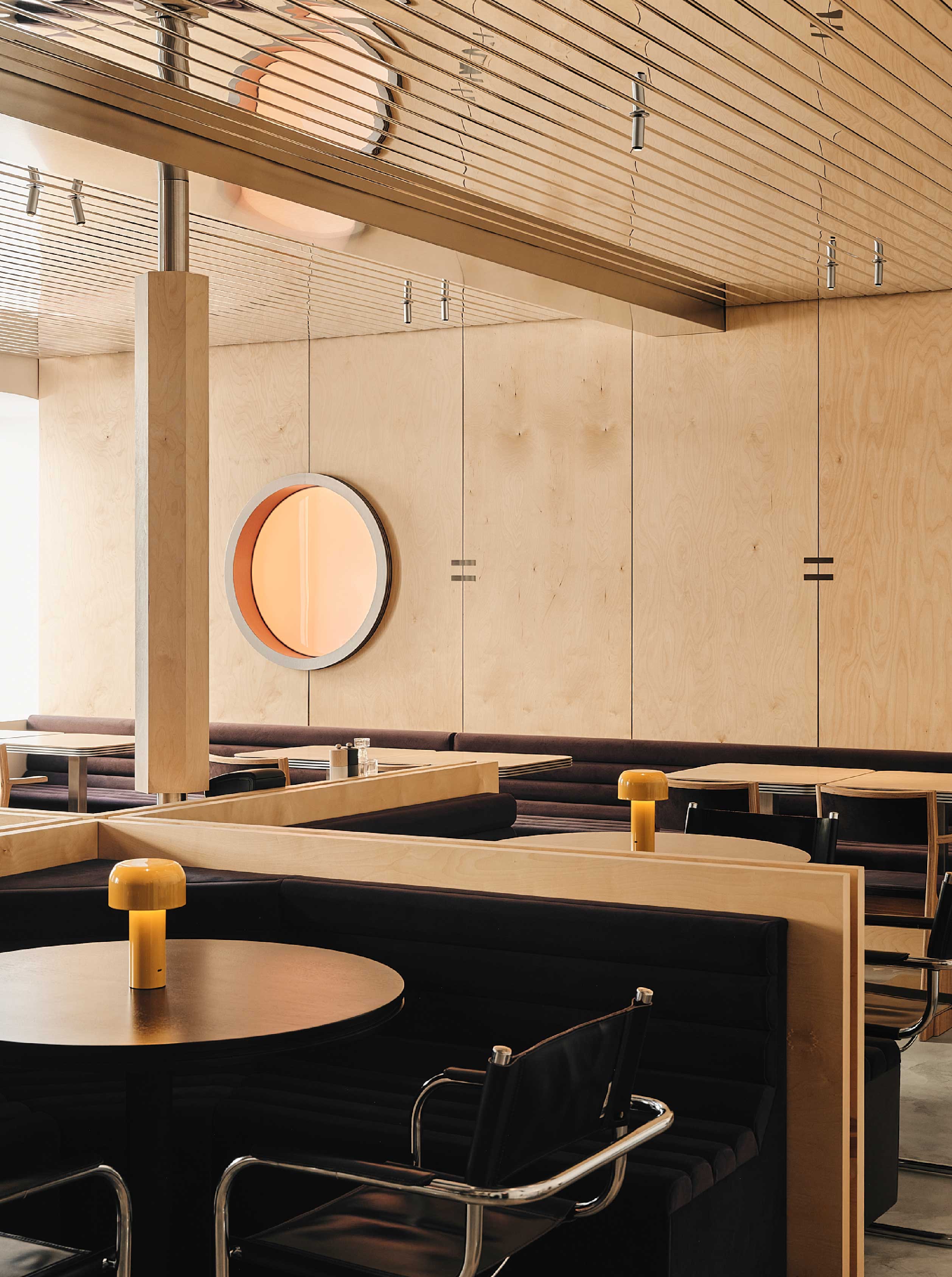 首先以大型主廳作為主要用餐區,增設木牆拉直斜向空間,牆面並嵌入圓形燈箱,ULA Studio設計工作室提到,「這道舷窗的靈感取自一張老照片,我們企圖捕捉夕陽溫暖流動的氛圍,為充滿剛性的空間注入一抹暖度。」