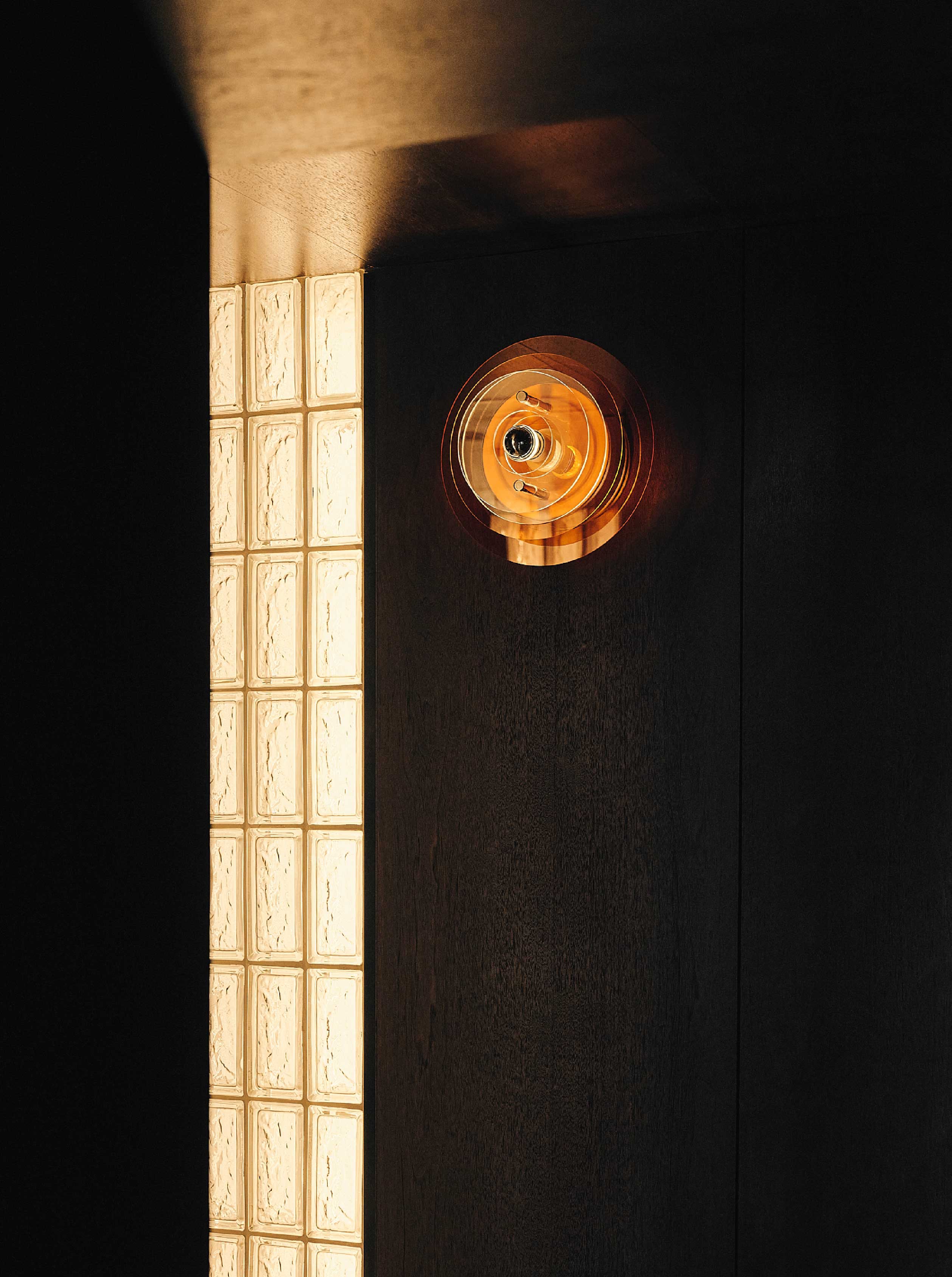 洗手間則成為另一處令人驚喜的端景,安排透光的玻璃磚牆、不鏽鋼復古洗手槽與橙色壁燈交織,打造出讓人一拍再拍的打卡端景。