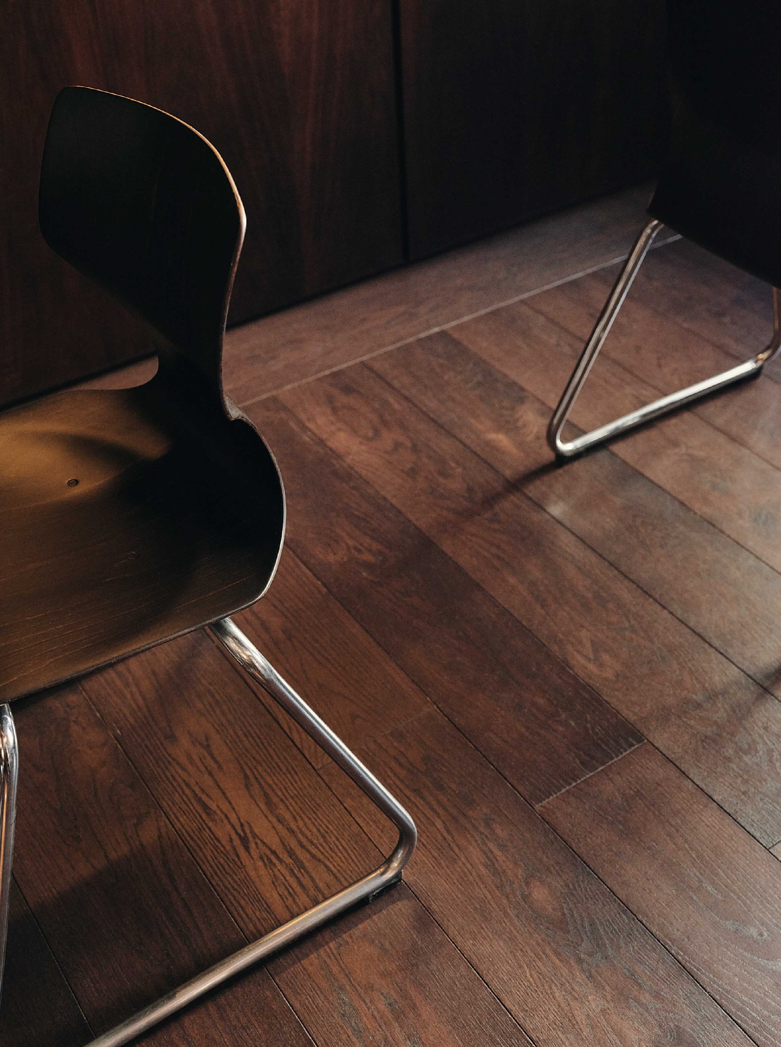 以深色胡桃木鋪陳牆面、天花,安排開放式廚房,臨窗增設座位,顧客能近距離觀看料理出爐的過程, 透過展演提升交流互動的氛圍。
