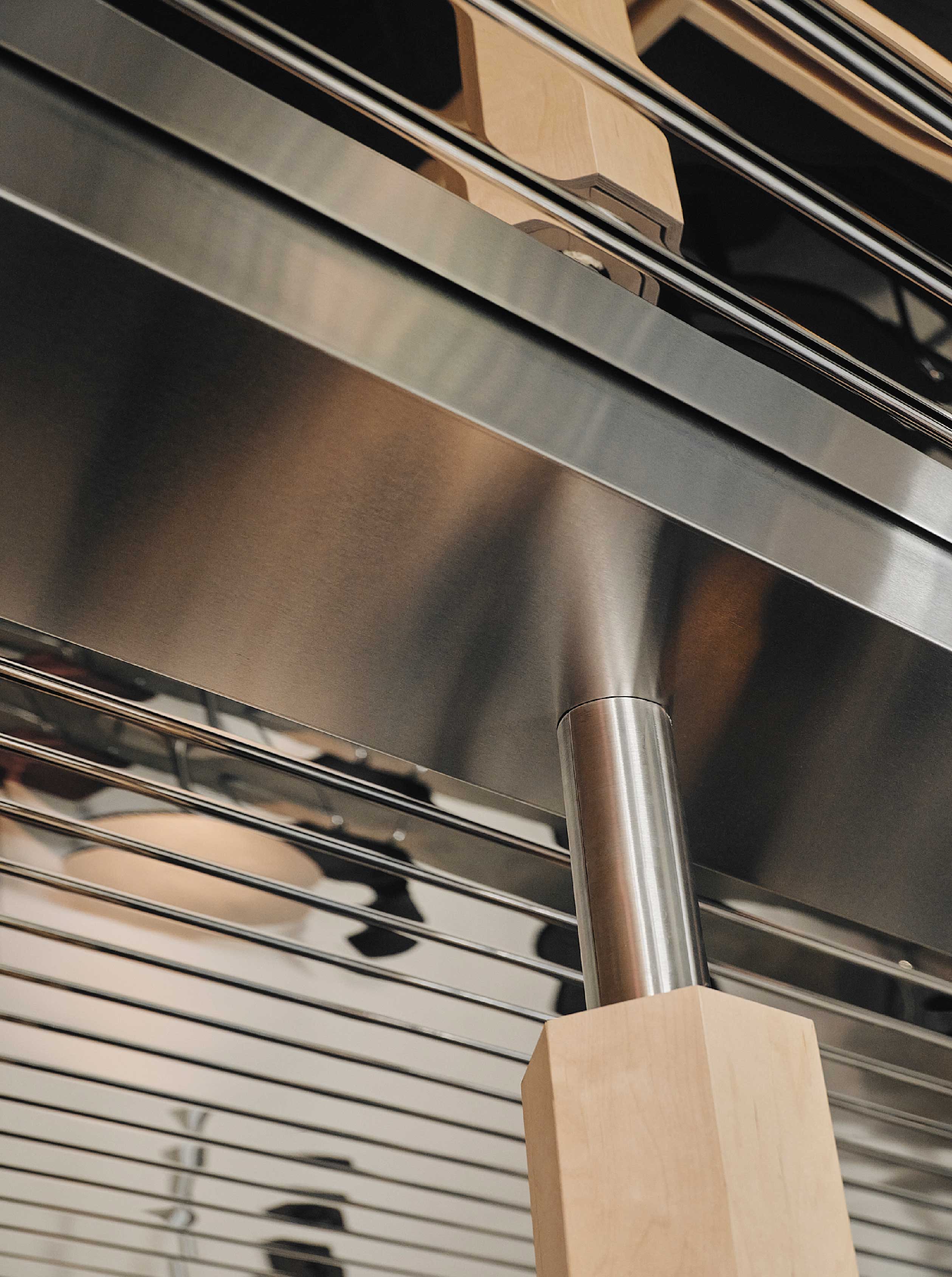 視覺焦點進一步延伸至天花,鏡面金屬板順著結構鋪陳,反射人流與光影,將原本低矮的樓高向上延展,也弱化既有樑體的存在感。無法移除的金屬柱體則以木質包覆,六角形的結構更為立體有型,整體流露出未來主義與極簡韻味。