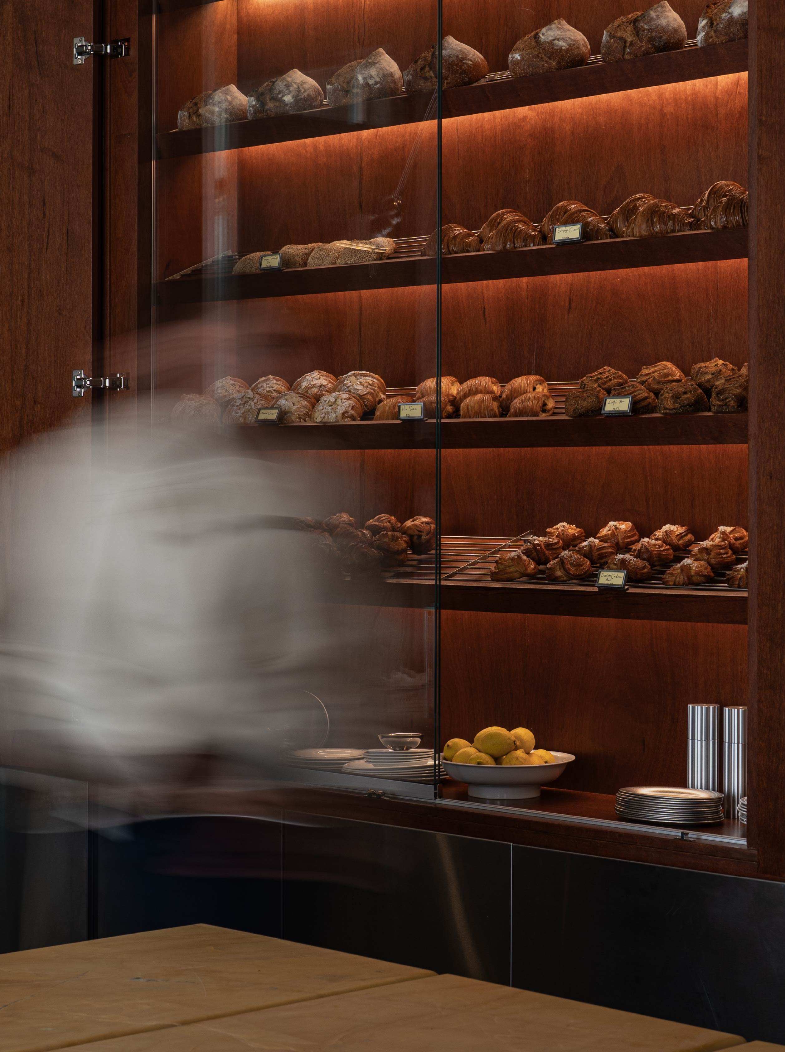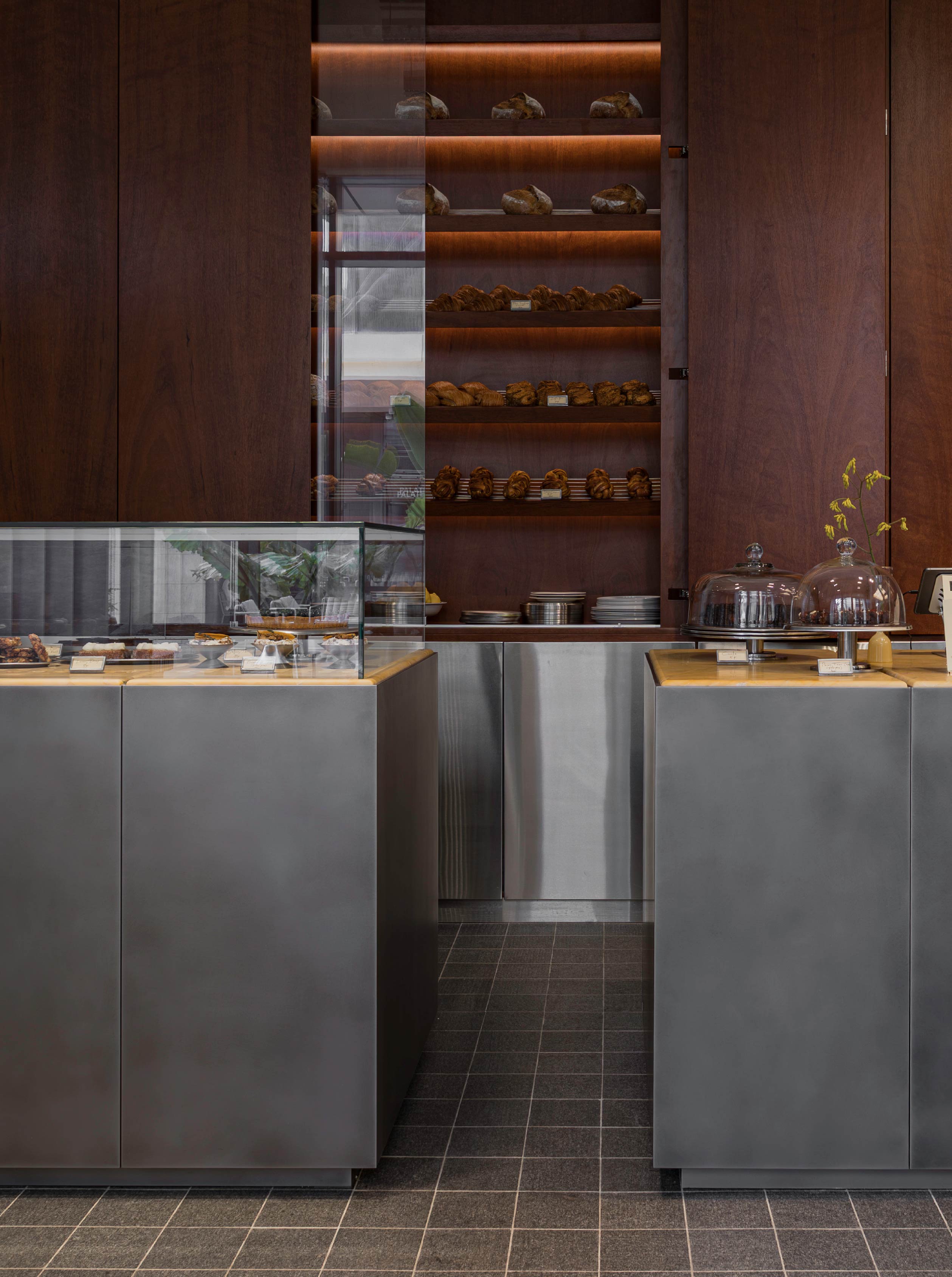 中央再安排兩座展示中島,提供多樣麵包與甜點選擇。木色檯面延續溫潤質感,立面則以霧面金屬構築充滿張力的結構語言,與亮面金屬形成細膩對比。從金屬半牆到中島維持一致的水平線,為空間架構清晰有節奏的秩序。