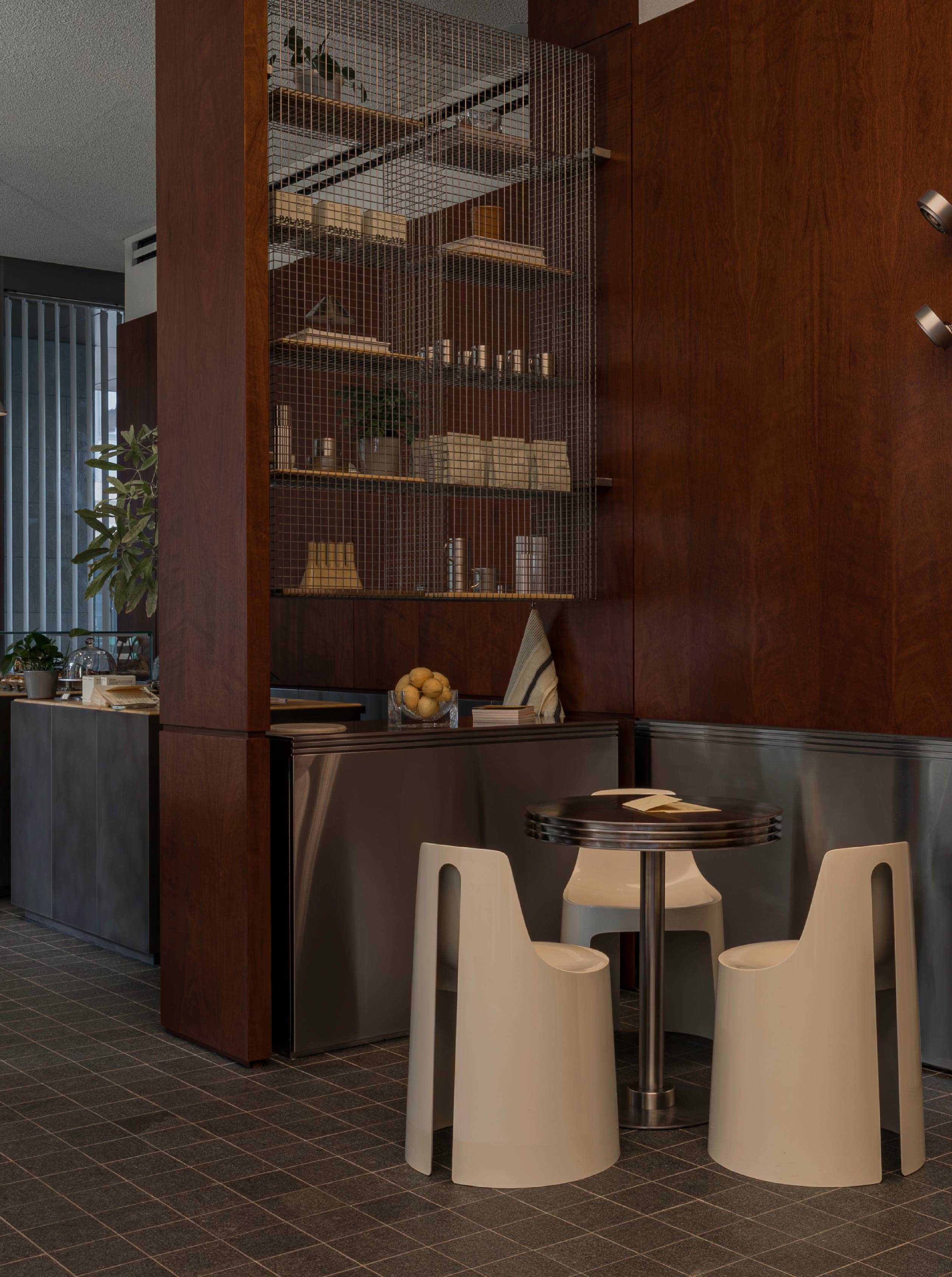 空間配置上,以一道鏤空高櫃作為展示中島與座位區的界線,高櫃內嵌細緻的金屬網格層架,再輔以金屬島台與復古桌燈相互輝映,營造低調耐看的場景。座位區深處則設置咖啡吧台,開放式的設計能近距離觀看咖啡製作過程,成為與顧客輕鬆交流的展演場域。