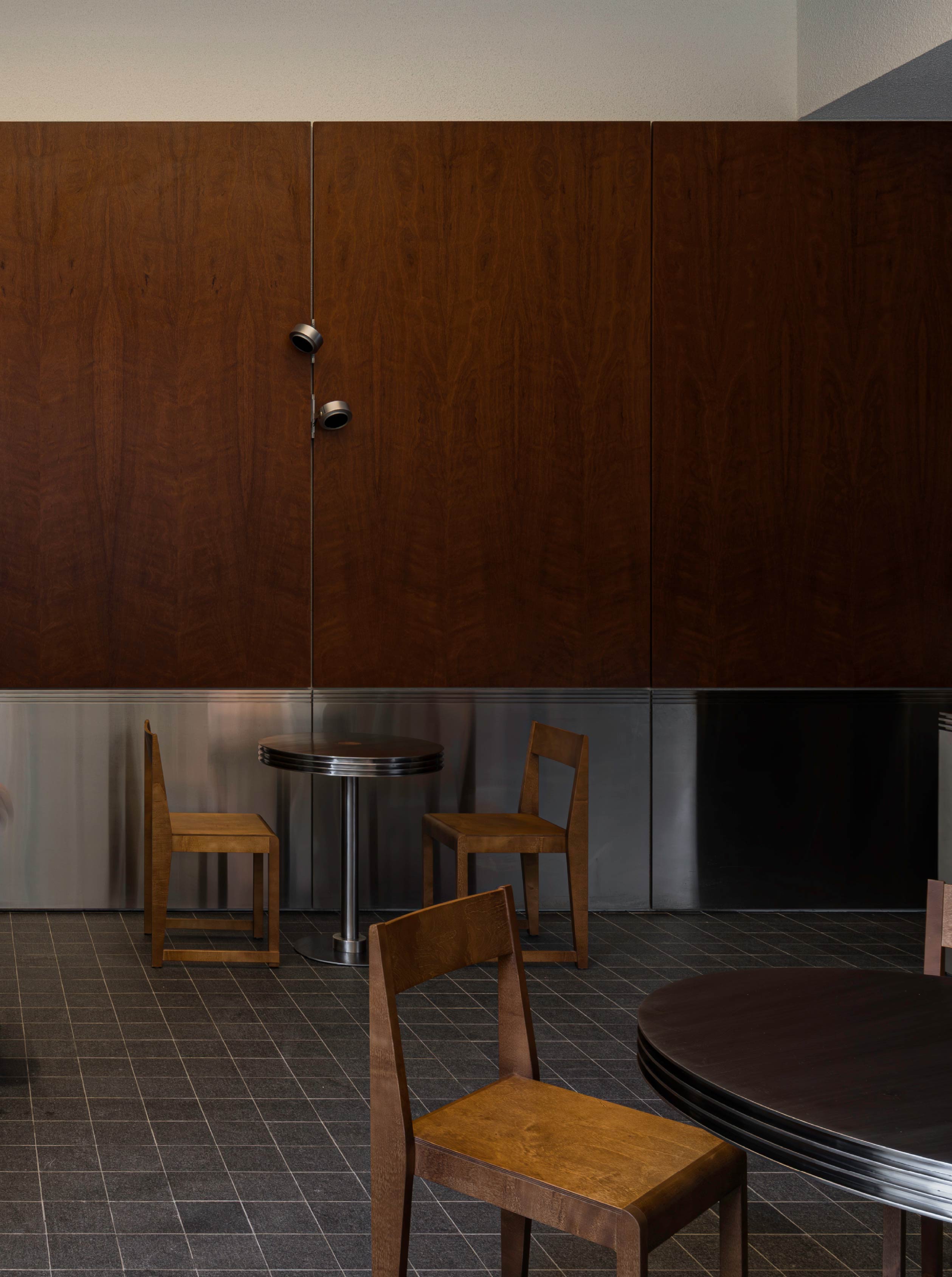 踏入Palate,四周環繞的木質牆體率先建立沉穩溫厚的基調,深色木紋帶出空間的重量感,下方則以金屬飾面點綴,注入乾淨俐落的現代語彙。
