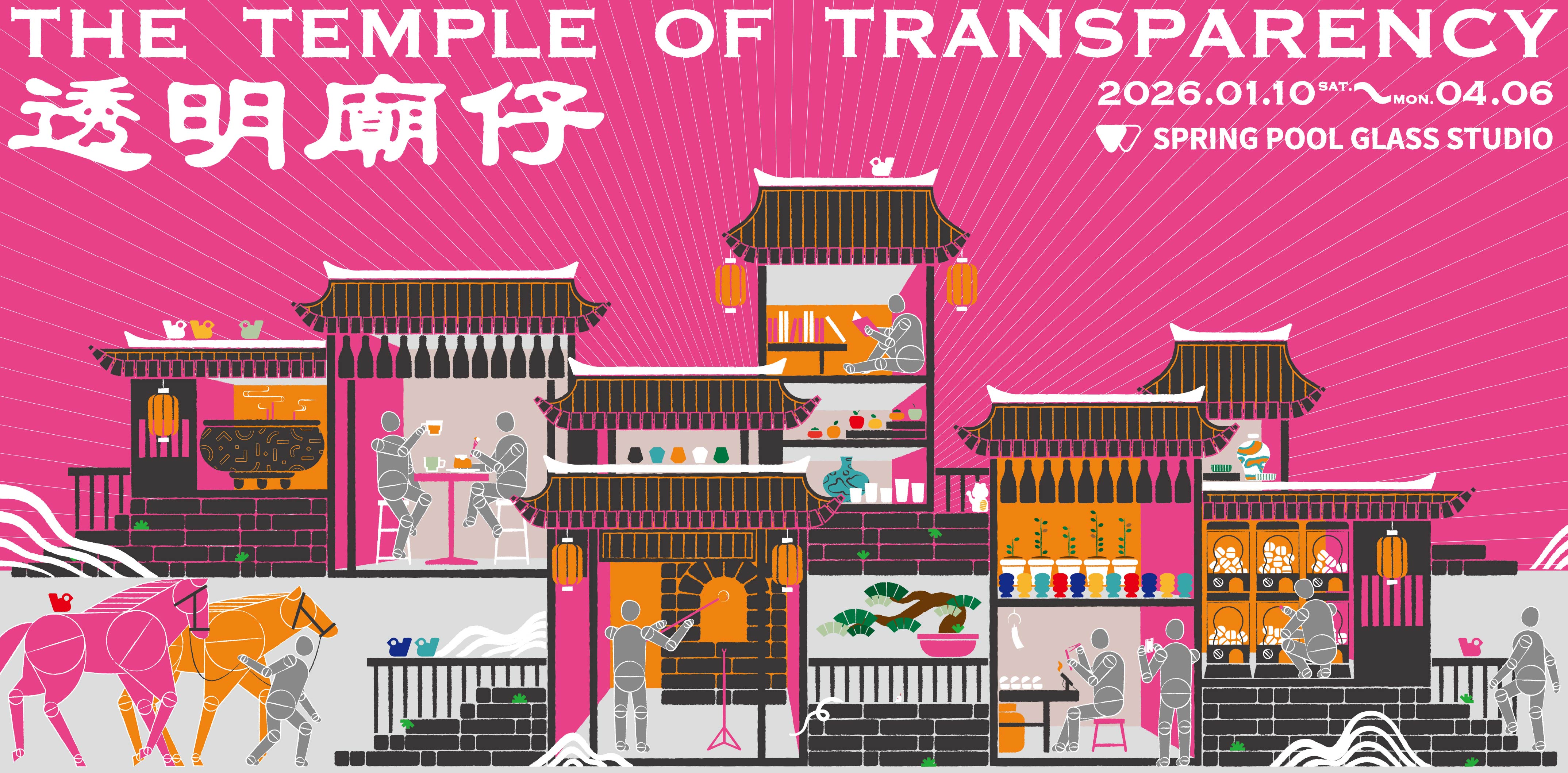 《 透明廟仔 THE TEMPLE OF TRANSPARENCY 》 總策規劃|W春池計畫 W Glass Project by SPRINGPOOL 視覺設計|W春池計畫 W Glass Project by SPRINGPOOL 玻璃工藝|春池玻璃 Spring Pool Glass + 春室 Glass Studio 餐飲設計|春室 The POOL 衛星響應|南美春室 The POOL、新園春室 The POOL 展覽期間|2026 年 01 月 10 日 - 04 月 06 日