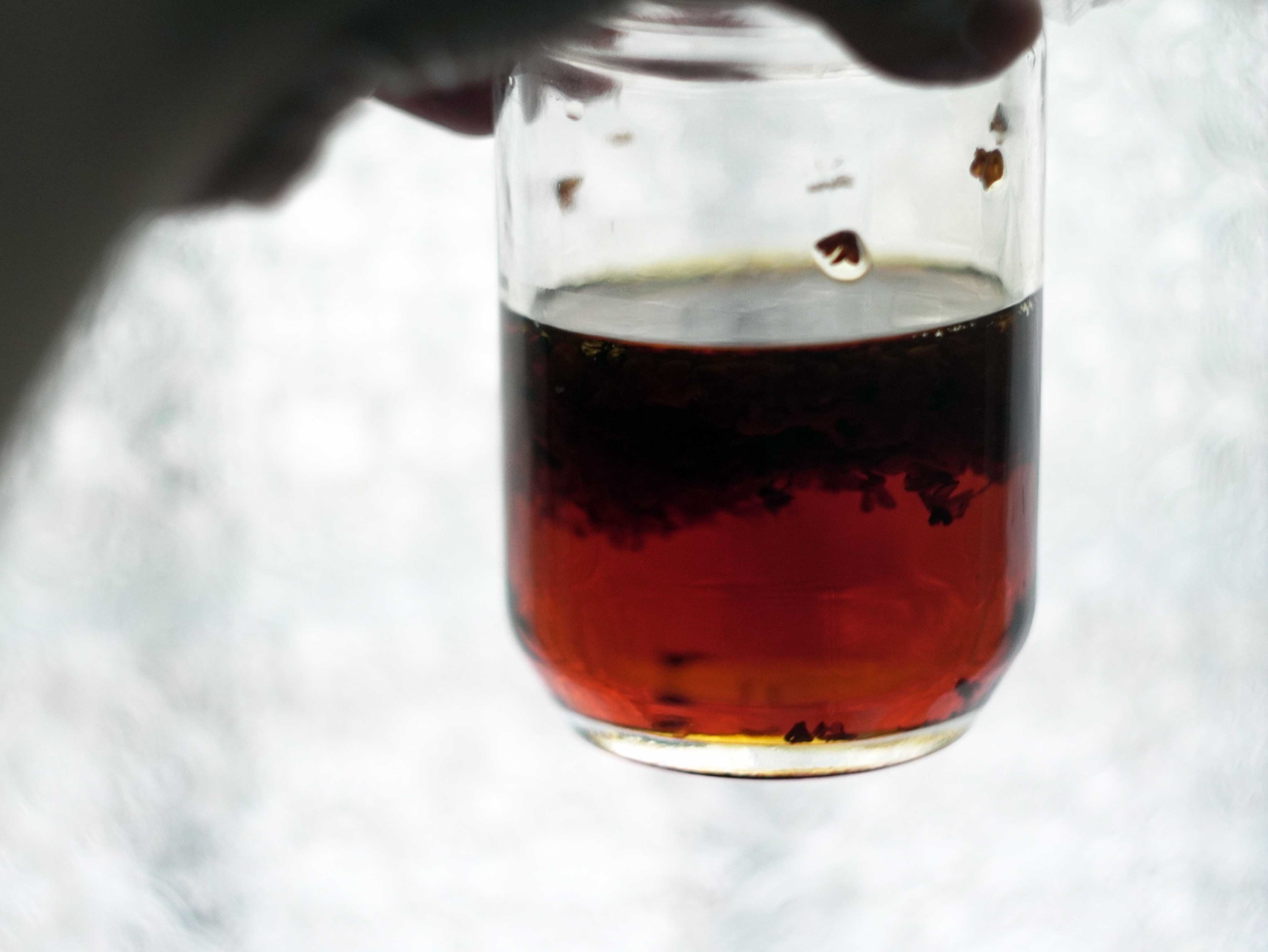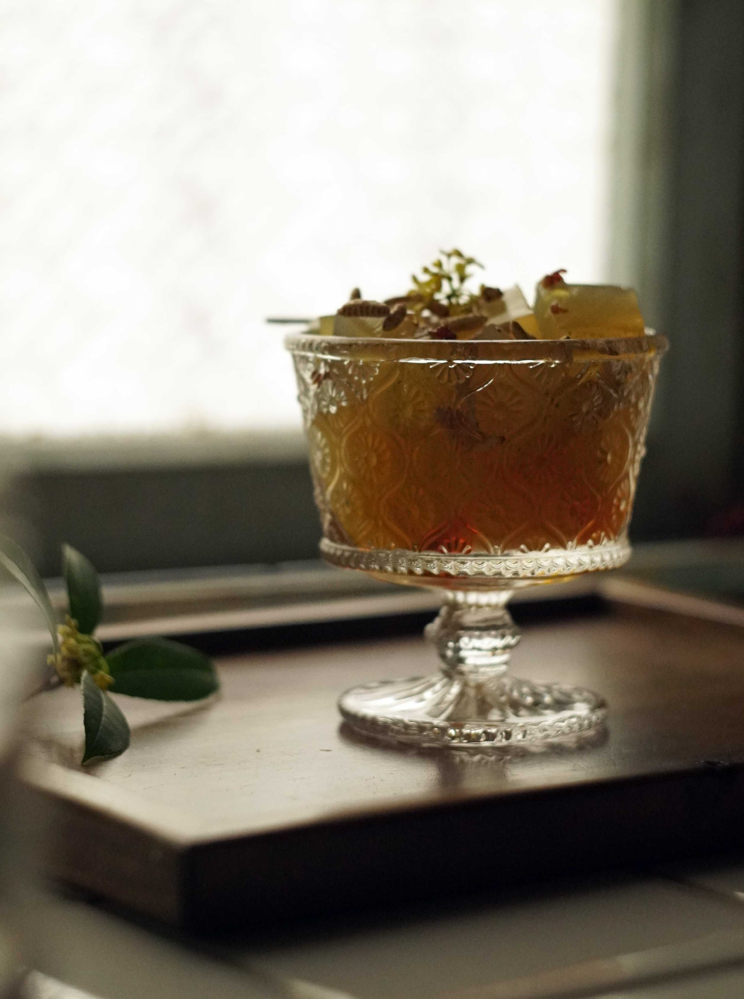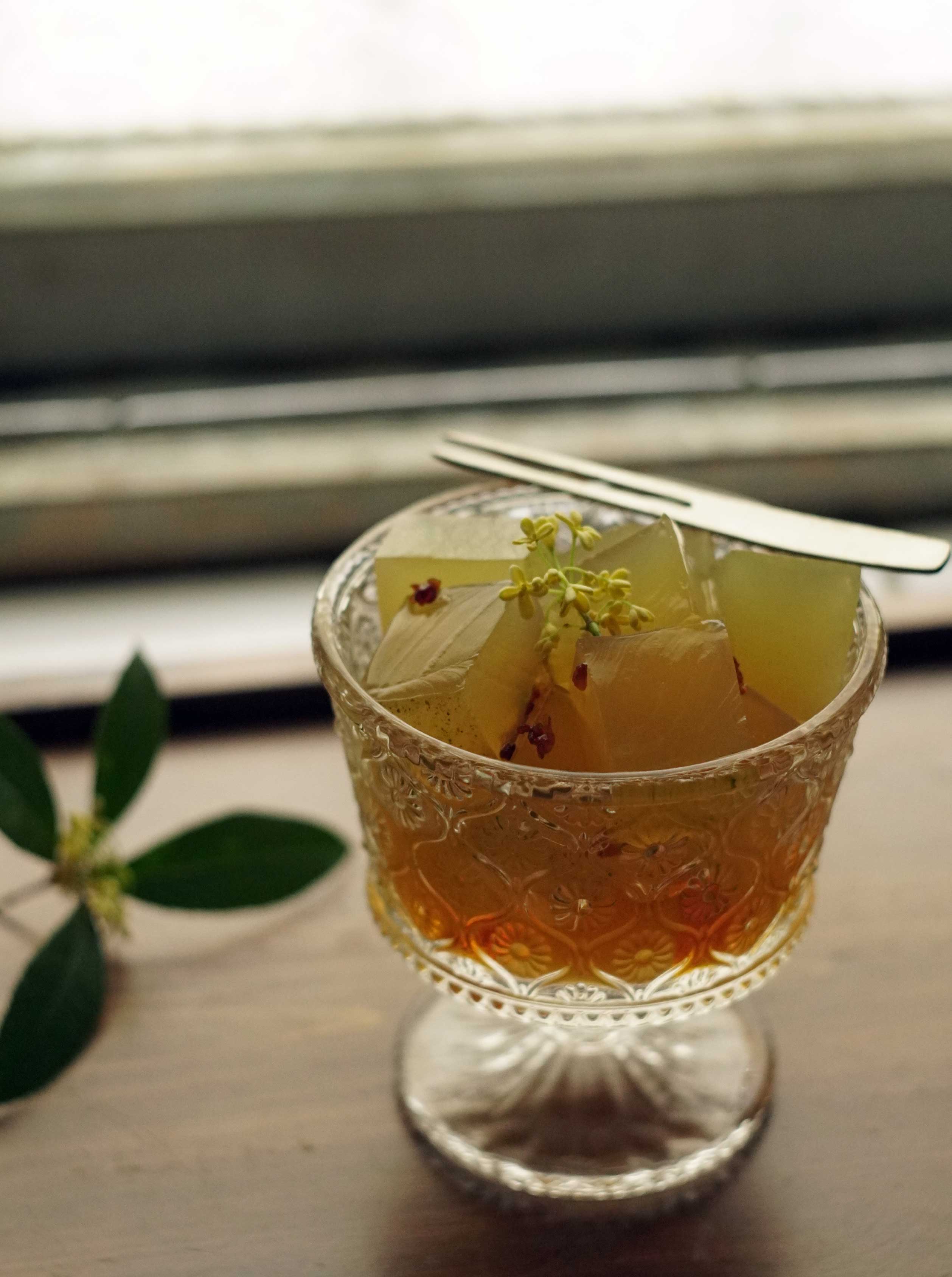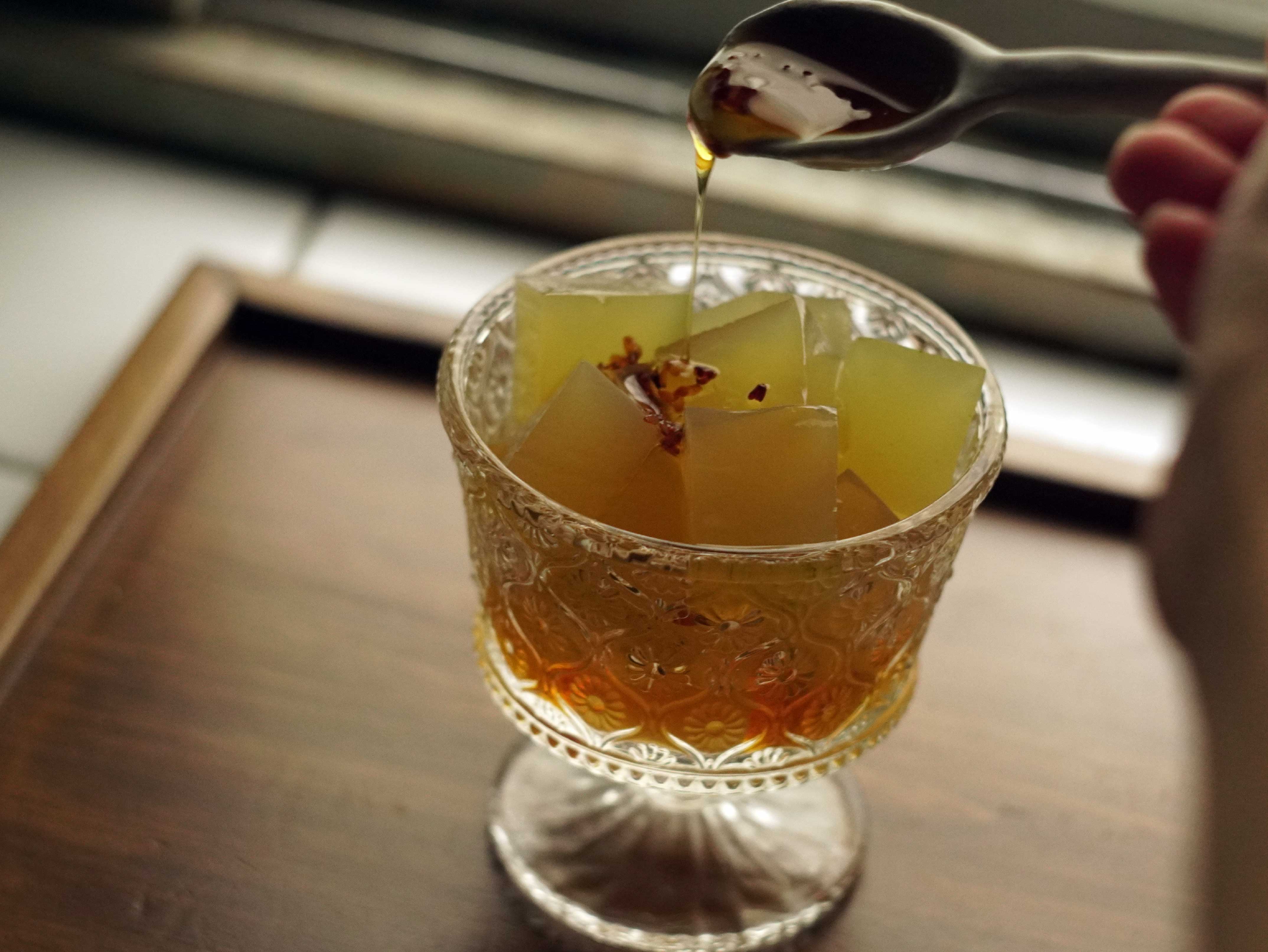 浸泡五分鐘後,我把洋菜粉篩入鍋內,再次以小火加熱至微滾,接著過濾茶渣。不能煮太久,否則會太澀,剛剛好就是最好的樣子。等待茶湯放涼,送進冰箱裡冰鎮一夜,然後安心地睡去。