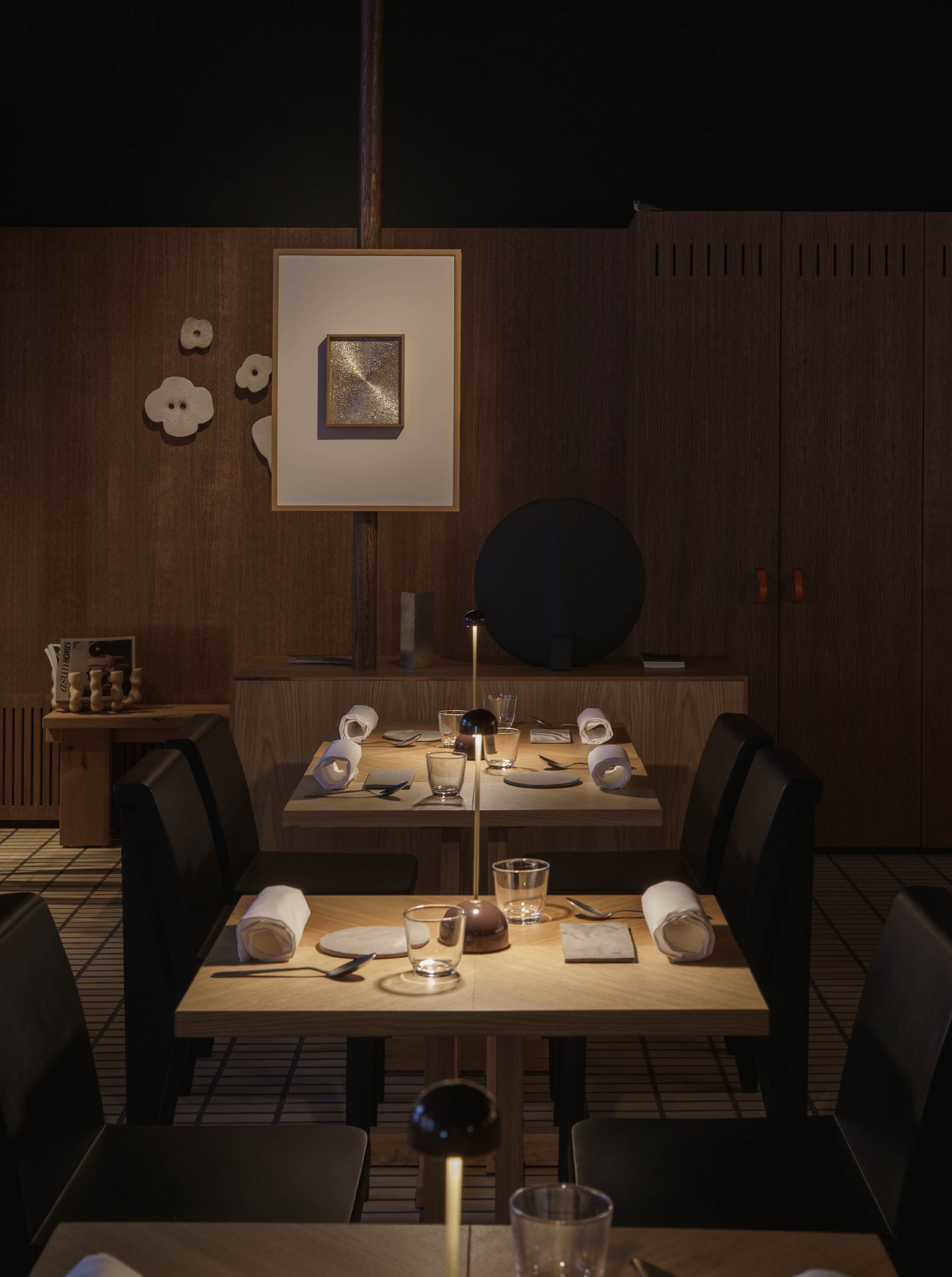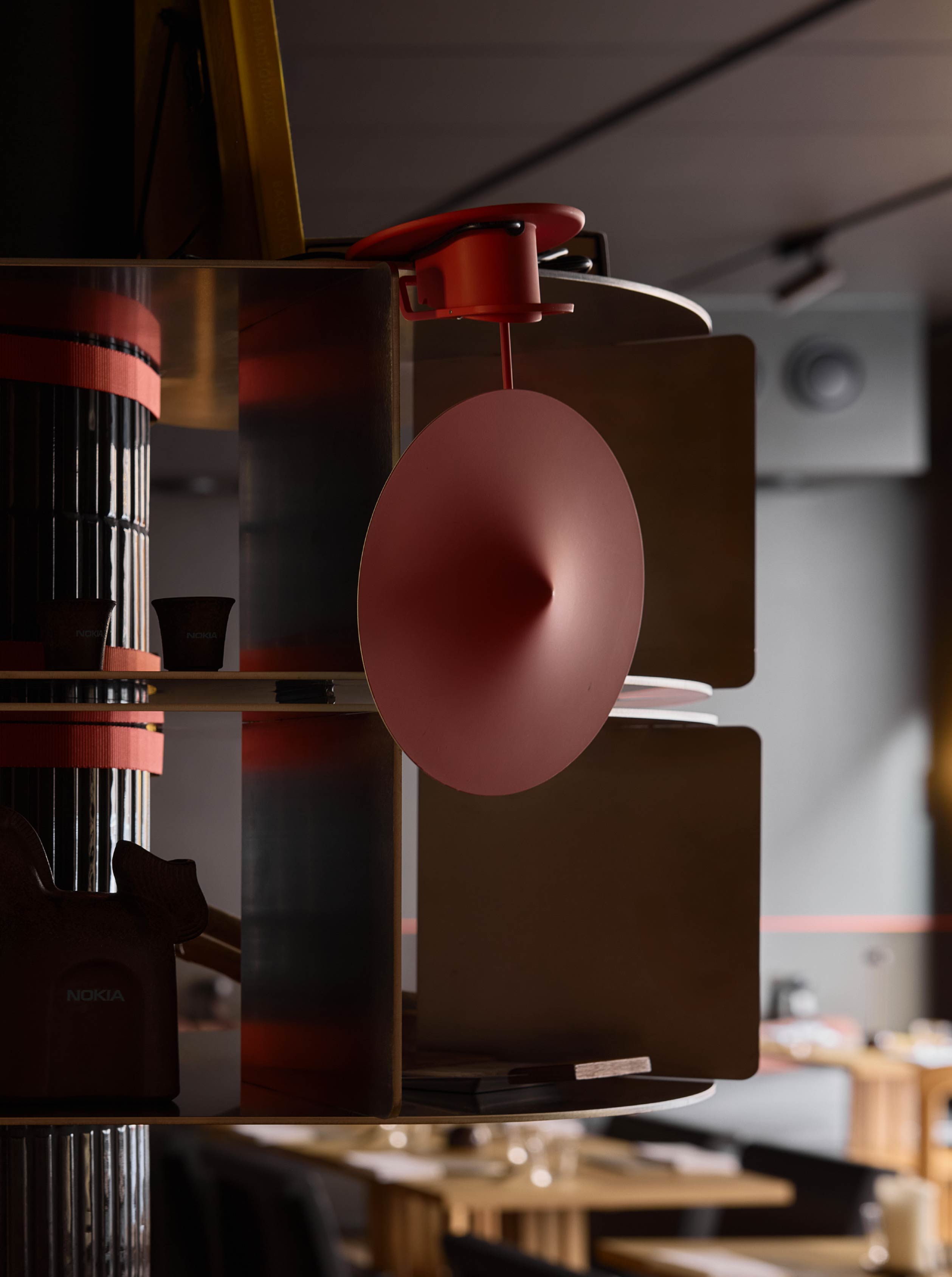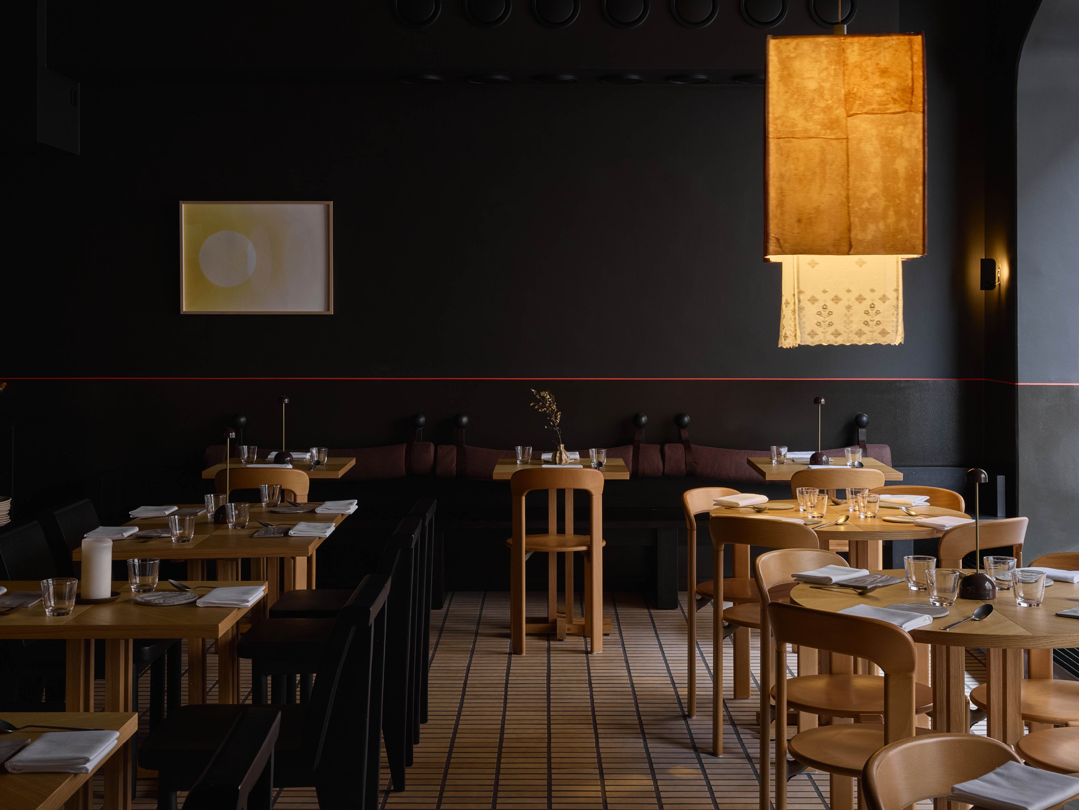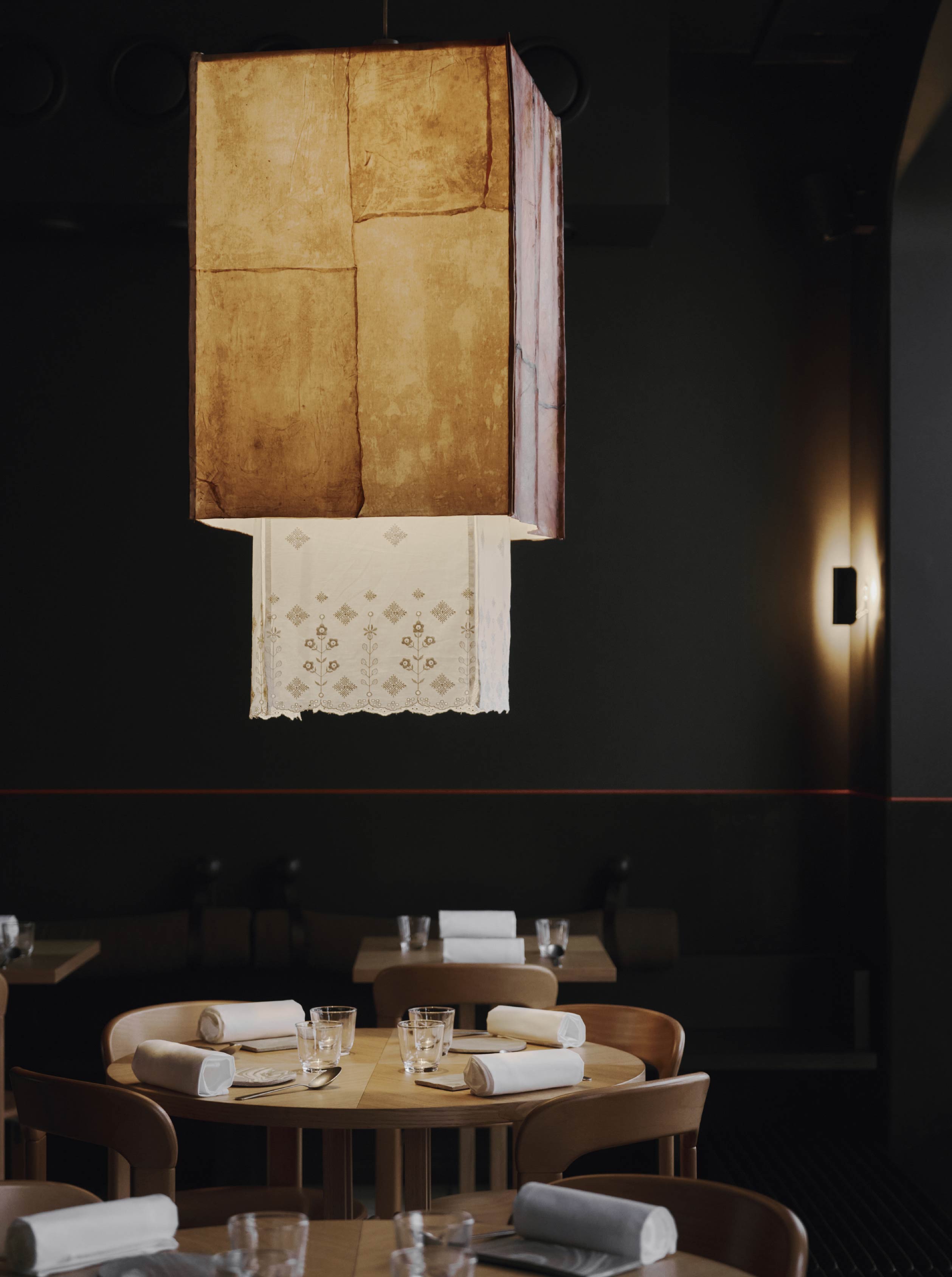 在材料與細節的處理上,設計團隊選用許多具有普遍辨識度的材料,如木材、陶瓷與編織織物,然而透過細緻的工藝處理和設計細節,展現材料的獨特個性。另外,餐廳內也有多件北歐藝術家的作品,以及世界各地的裝飾收藏,甚至還有餐廳團隊親手製作的物件。其中最有特色的便是餐桌上方的主燈,